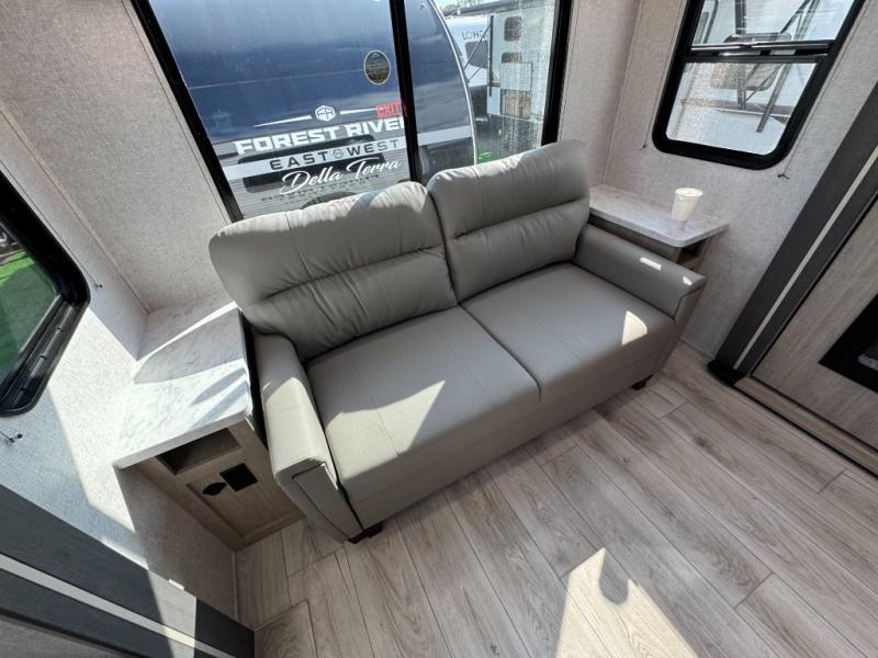 Each Della Terra travel trailer by EAST TO WEST is constructed with an enclosed and heated underbelly and enclosed holding tanks for added protection against the elements. There is also a power tongue jack with an LED light for easy set up and a power awning with LED lights you can rest under after you've unpacked. The Explore Comfort Package comes seamless pressed countertops, kitchen backsplash, window valance package with black night shades, and many more comforts. You will also appreciate the Adventure Outdoor Package with backup camera prep and solar prep, a tankless water heater, an RV grill quick disconnect, and a universal docking station with battery disconnect.