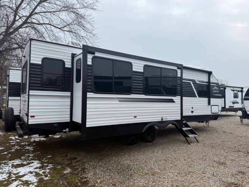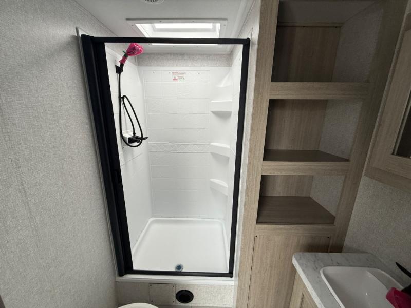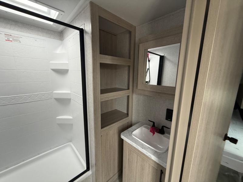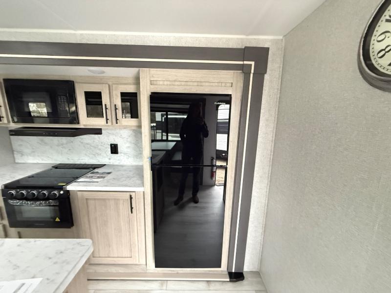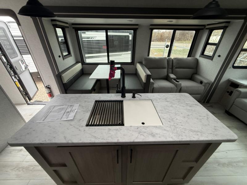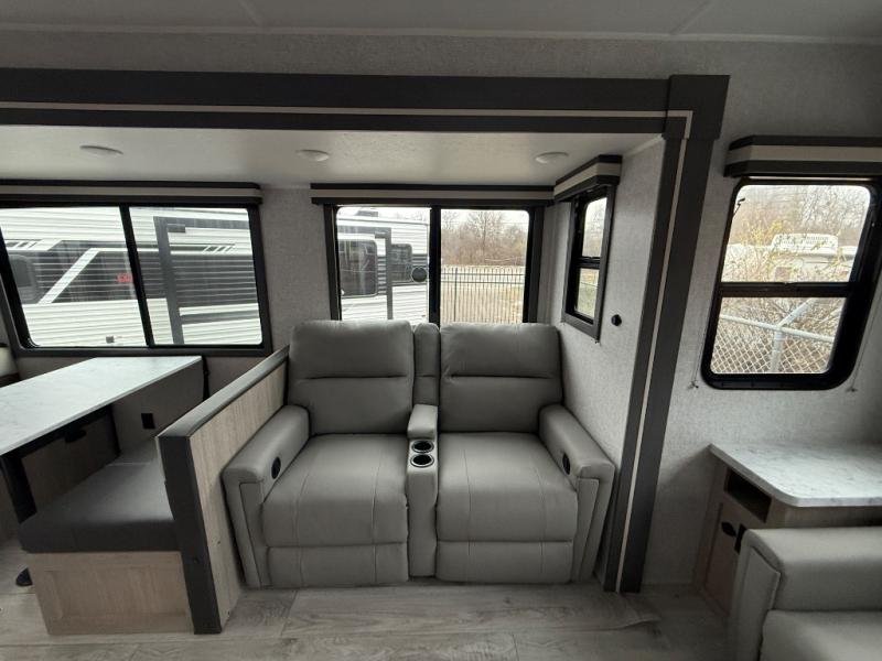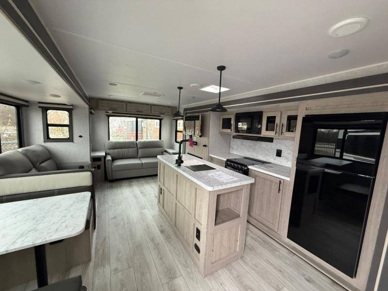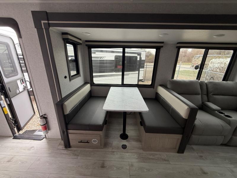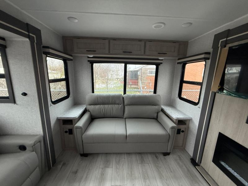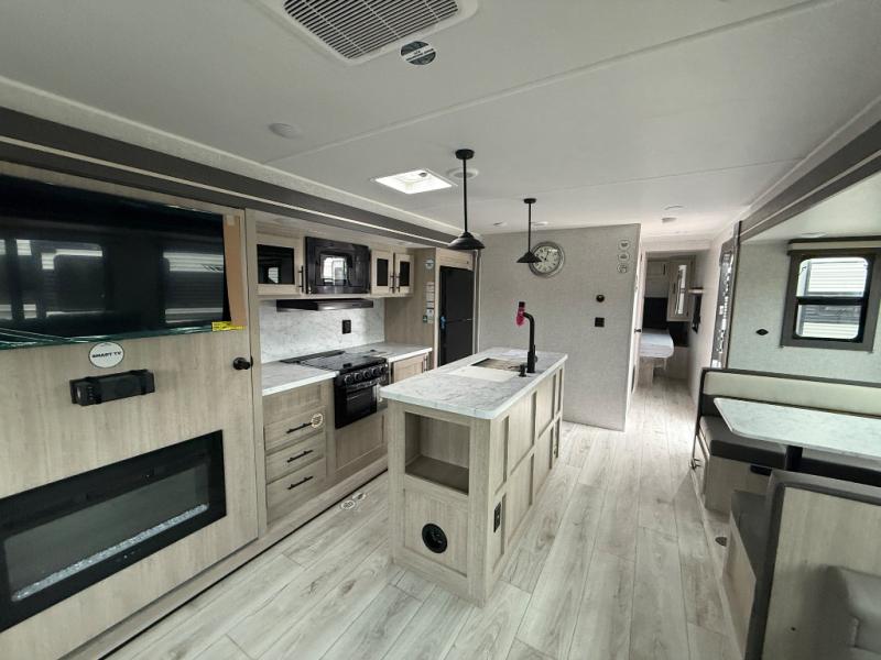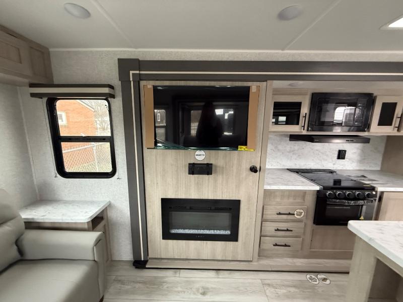 Camping in this double slide out travel trailer will be easier than ever! Once you arrive at your destination, set up the power awning, unload the pass-through storage, and head inside to make lunch in the full kitchen. There is a kitchen island for more prep space, along with a 10.7 cu. ft. 12V refrigerator, three burner range, and microwave oven. You'll find comfortable seating space on the booth dinette, jiffy sofa, and dual lounge chairs, and the fireplace is sure to make your space feel more like home. There is also hidden storage behind the fireplace for pantry items, board games, and more! Up front, a full bath and front private bedroom will let you freshen up before a great night's rest on the king bed!