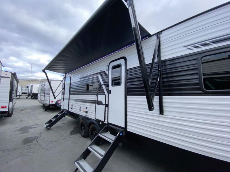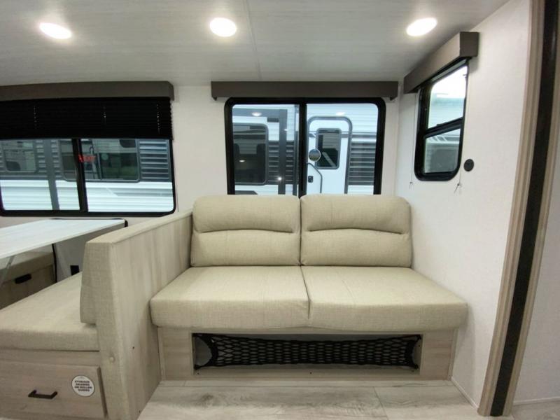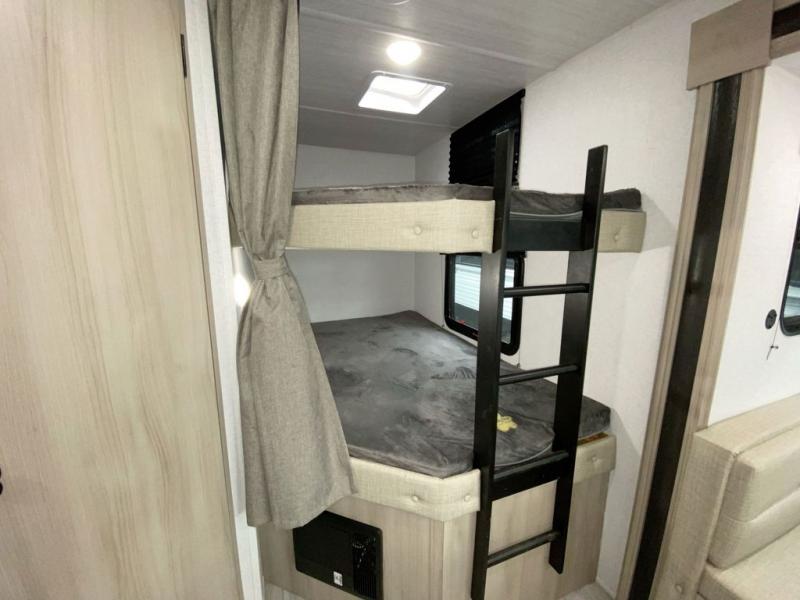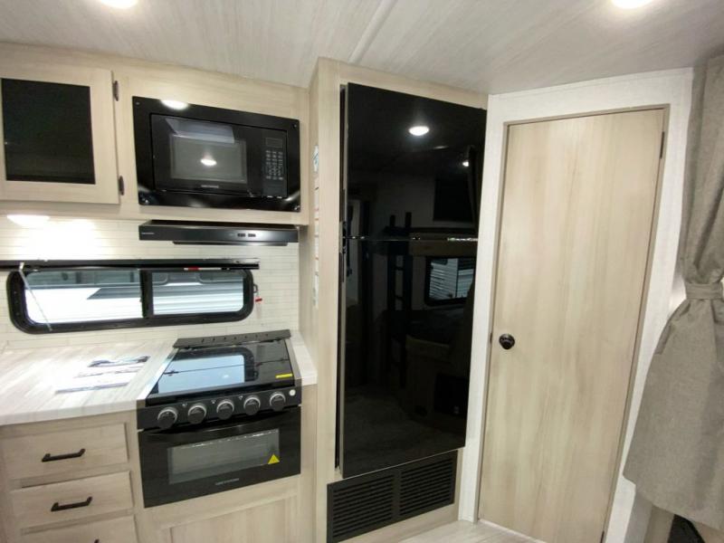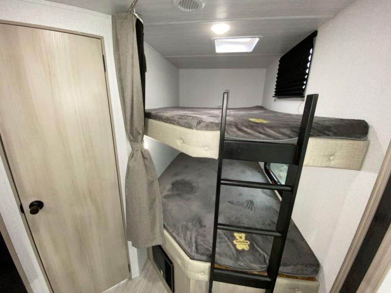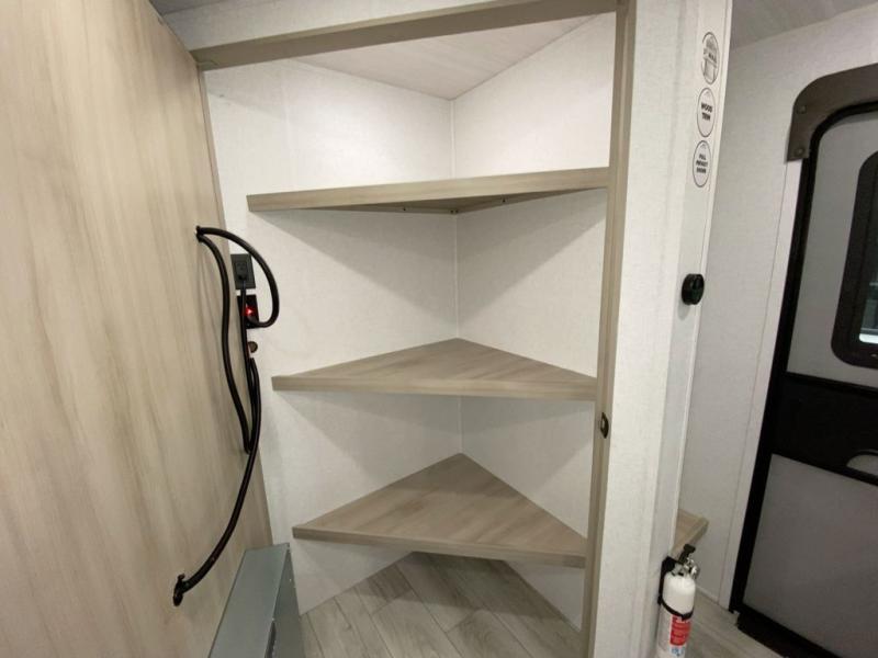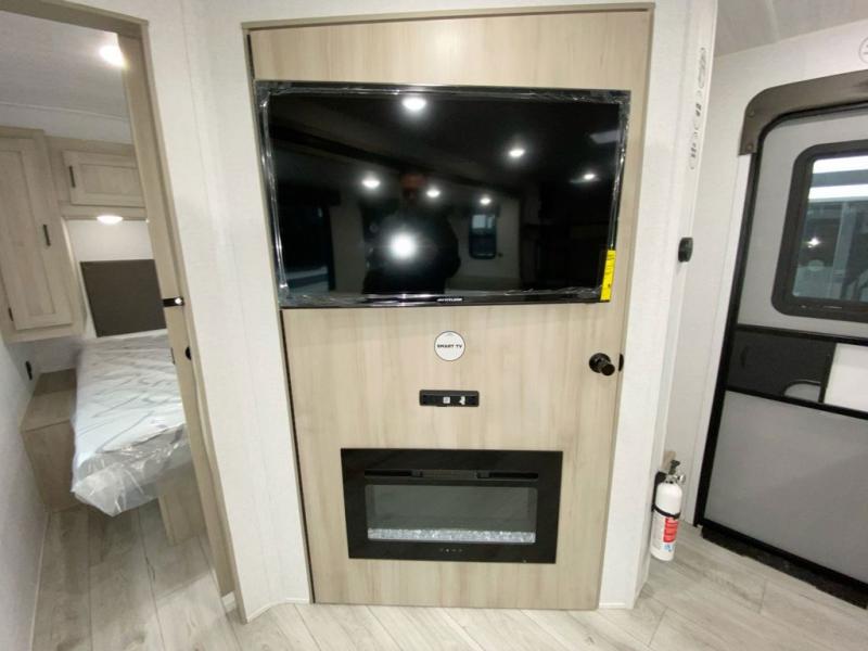 Pack your bags and hitch up this travel trailer for a fun family adventure! You will get a good night's rest on the front king bed in the front private bedroom, and the kids can sleep on the double bunk beds with storage. You could even transform the booth dinette with storage underneath it and the jiffy sofa which can be switched out for the optional theater seat or optional tri-fold sofa. The entertainment center has a fireplace for a cozy evening indoors and a hidden pantry behind it for all of your movie night snacks. With dual entry doors, it will be easy to enter and exit this unit especially from the rear corner bathroom which has one of the entry/exit doors to the unit. Enjoy cooking breakfast outside at the outdoor kitchen complete with a pull-out griddle and fridge!