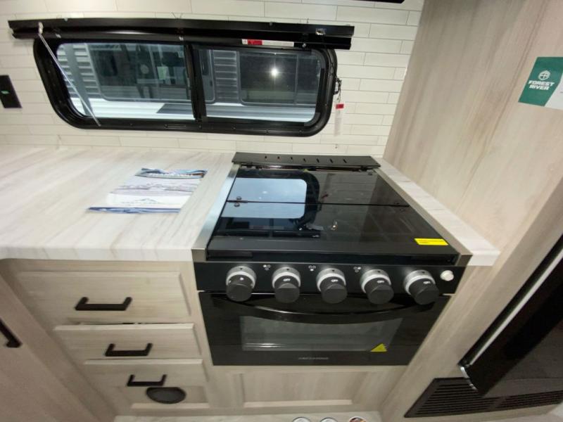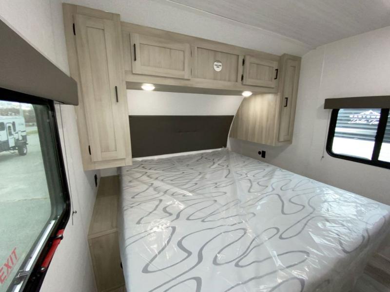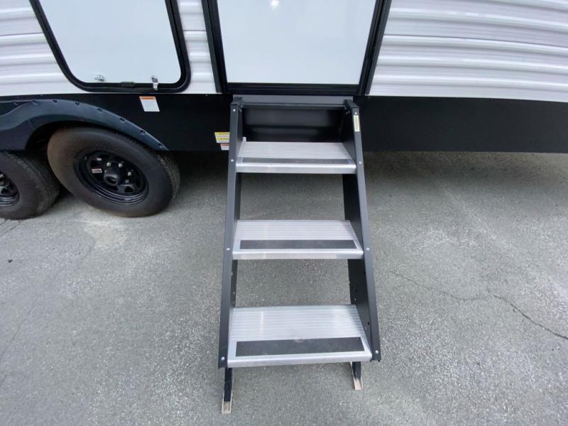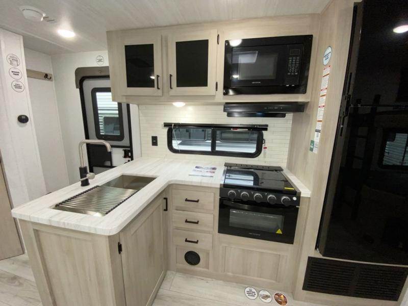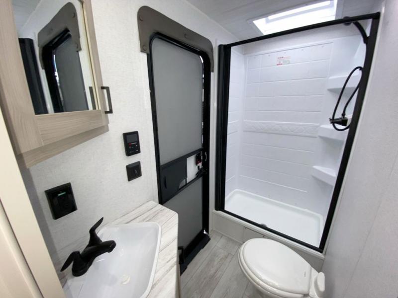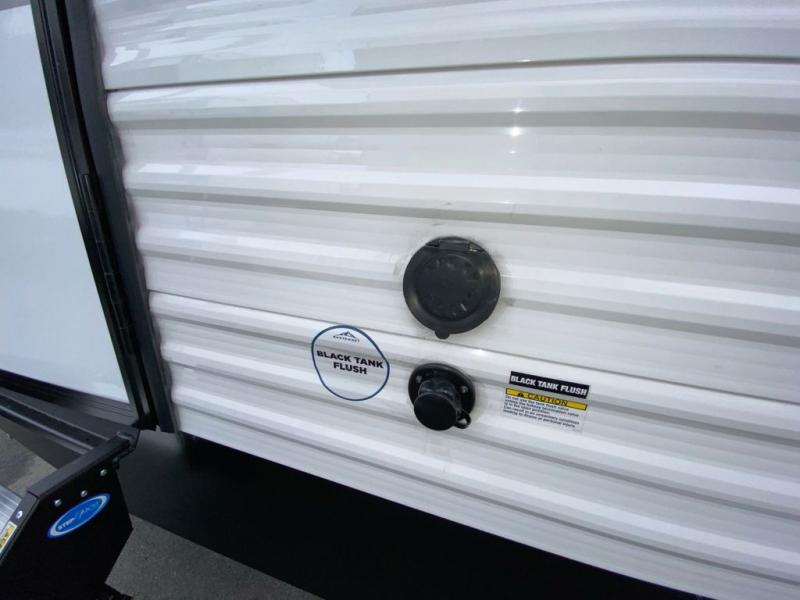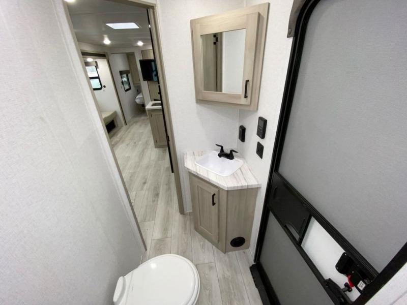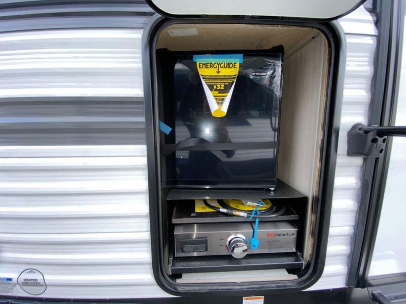 Pack your bags and hitch up this travel trailer for a fun family adventure! You will get a good night's rest on the front king bed in the front private bedroom, and the kids can sleep on the double bunk beds with storage. You could even transform the booth dinette with storage underneath it and the jiffy sofa which can be switched out for the optional theater seat or optional tri-fold sofa. The entertainment center has a fireplace for a cozy evening indoors and a hidden pantry behind it for all of your movie night snacks. With dual entry doors, it will be easy to enter and exit this unit especially from the rear corner bathroom which has one of the entry/exit doors to the unit. Enjoy cooking breakfast outside at the outdoor kitchen complete with a pull-out griddle and fridge!