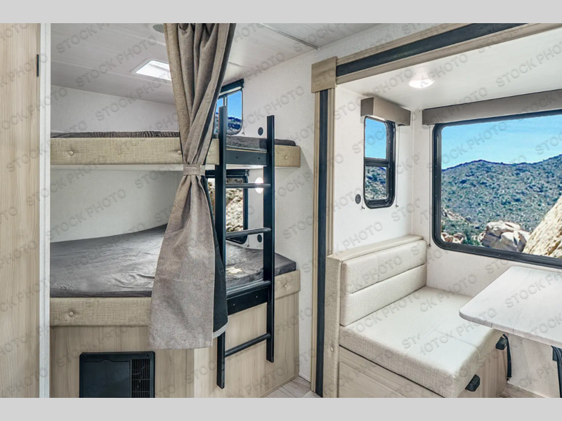 Pack your bags and hitch up this travel trailer for a fun family adventure! You will get a good night's rest on the front king bed in the front private bedroom, and the kids can sleep on the double bunk beds with storage. You could even transform the booth dinette with storage underneath it and the jiffy sofa which can be switched out for the optional theater seat or optional tri-fold sofa. The entertainment center has a fireplace for a cozy evening indoors and a hidden pantry behind it for all of your movie night snacks. With dual entry doors, it will be easy to enter and exit this unit especially from the rear corner bathroom which has one of the entry/exit doors to the unit. Enjoy cooking breakfast outside at the outdoor kitchen complete with a pull-out griddle and fridge!