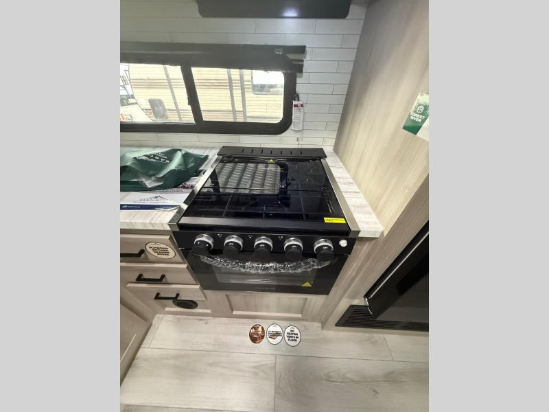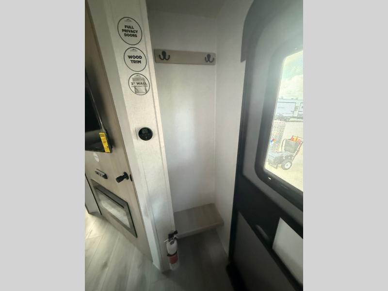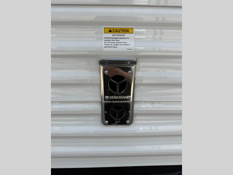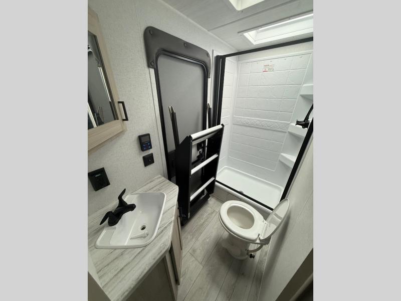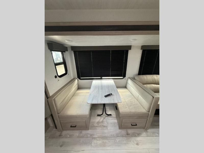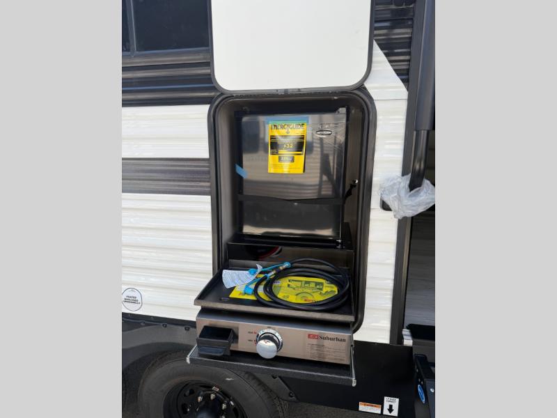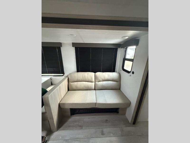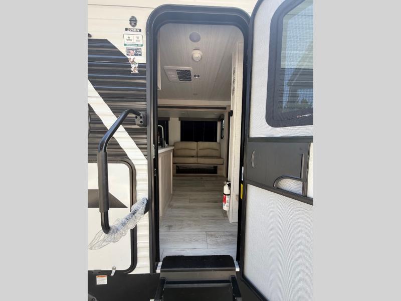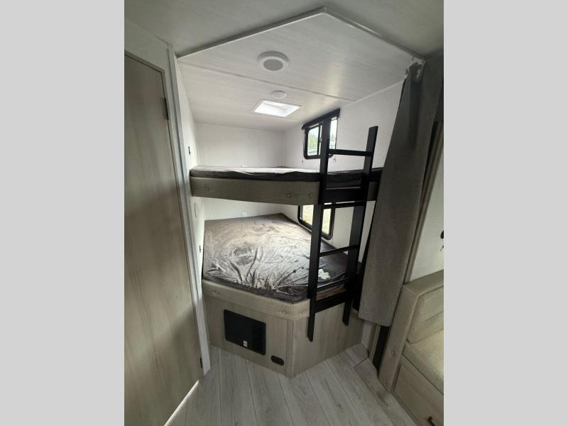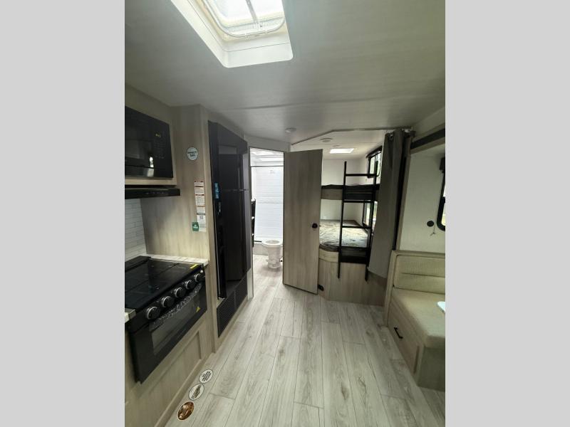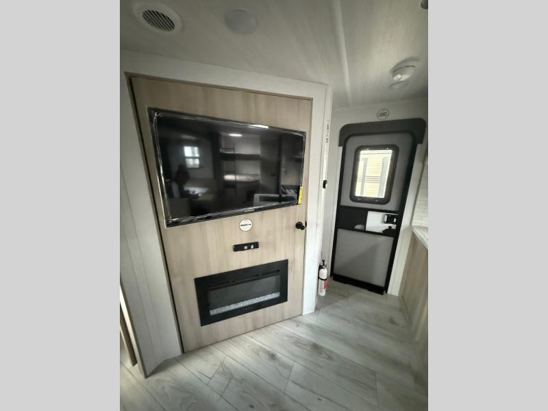 Pack your bags and hitch up this travel trailer for a fun family adventure! You will get a good night's rest on the front king bed in the front private bedroom, and the kids can sleep on the double bunk beds with storage. You could even transform the booth dinette with storage underneath it and the jiffy sofa which can be switched out for the optional theater seat or optional tri-fold sofa. The entertainment center has a fireplace for a cozy evening indoors and a hidden pantry behind it for all of your movie night snacks. With dual entry doors, it will be easy to enter and exit this unit especially from the rear corner bathroom which has one of the entry/exit doors to the unit. Enjoy cooking breakfast outside at the outdoor kitchen complete with a pull-out griddle and fridge!