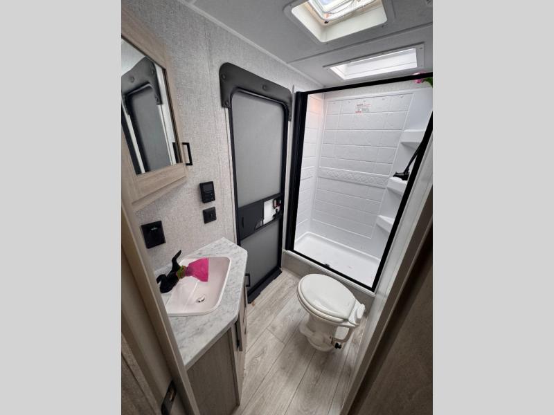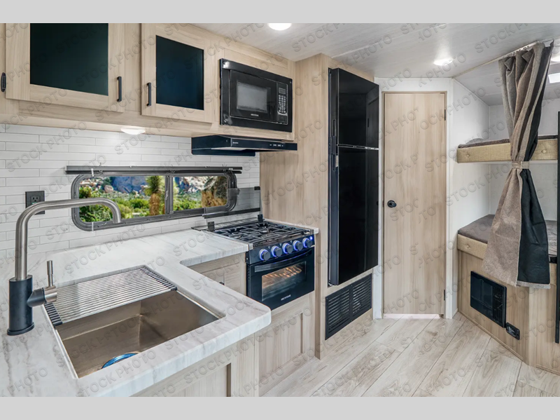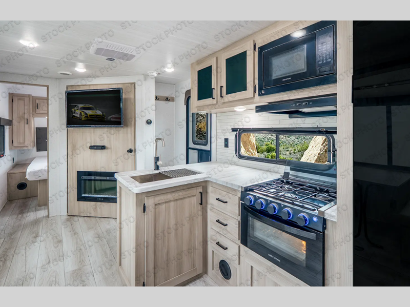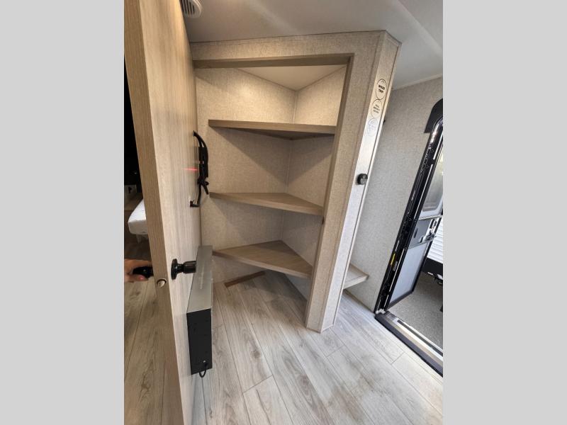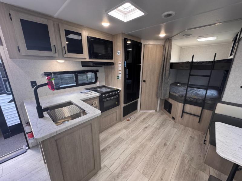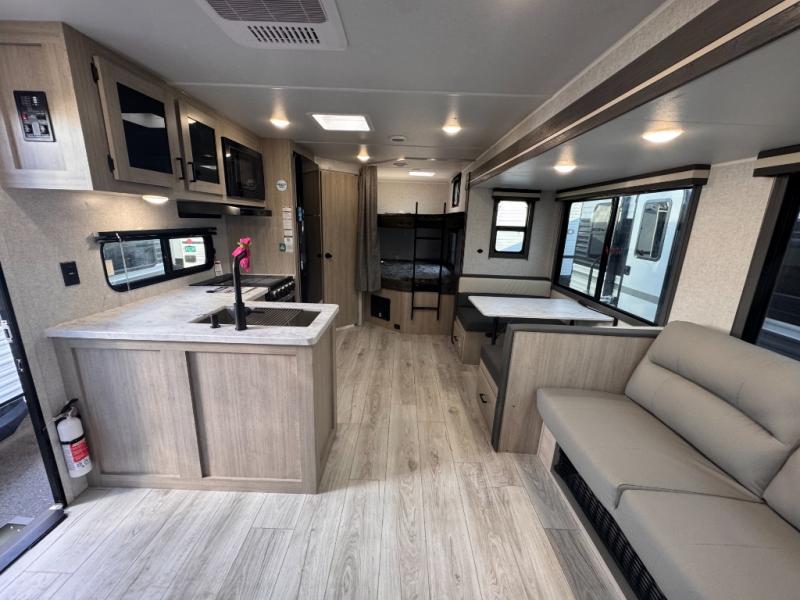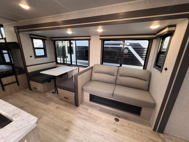 Pack your bags and hitch up this travel trailer for a fun family adventure! You will get a good night's rest on the front king bed in the front private bedroom, and the kids can sleep on the double bunk beds with storage. You could even transform the booth dinette with storage underneath it and the jiffy sofa which can be switched out for the optional theater seat or optional tri-fold sofa. The entertainment center has a fireplace for a cozy evening indoors and a hidden pantry behind it for all of your movie night snacks. With dual entry doors, it will be easy to enter and exit this unit especially from the rear corner bathroom which has one of the entry/exit doors to the unit. Enjoy cooking breakfast outside at the outdoor kitchen complete with a pull-out griddle and fridge!