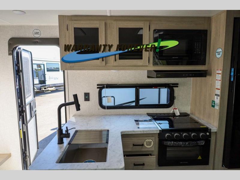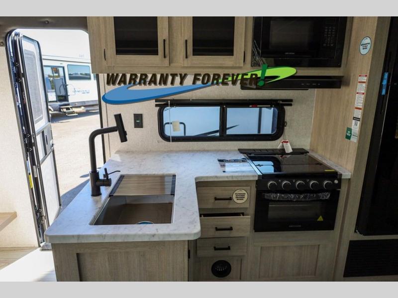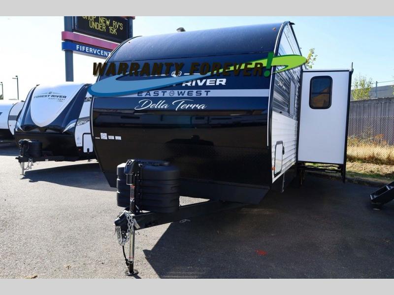 Each Della Terra travel trailer by EAST TO WEST is constructed with an enclosed and heated underbelly and enclosed holding tanks so you can camp all year long. There is also a power tongue jack with an LED light for easy set up and a power awning with LED lights you can rest under after you've unpacked. The Explore Comfort Package comes seamless pressed countertops, kitchen backsplash, window valance package with black night shades, and many more comforts. You will also appreciate the Adventure Outdoor Package with backup camera prep and solar prep, a tankless water heater, an RV grill quick disconnect, and a universal docking station with battery disconnect.