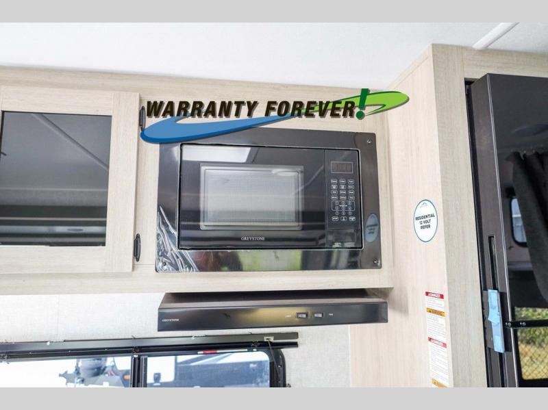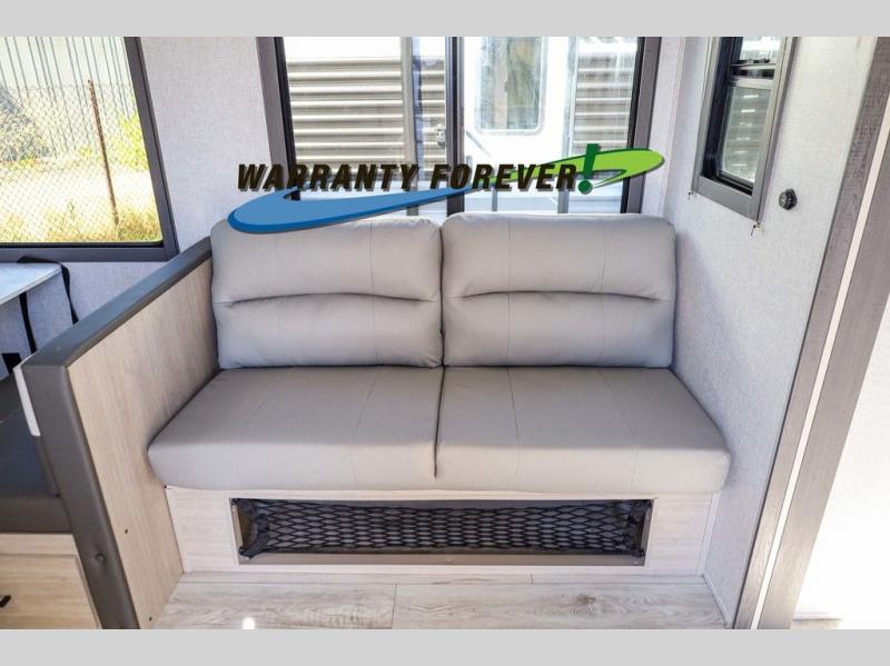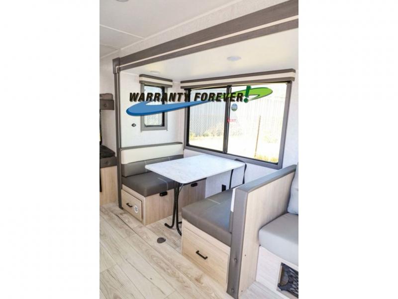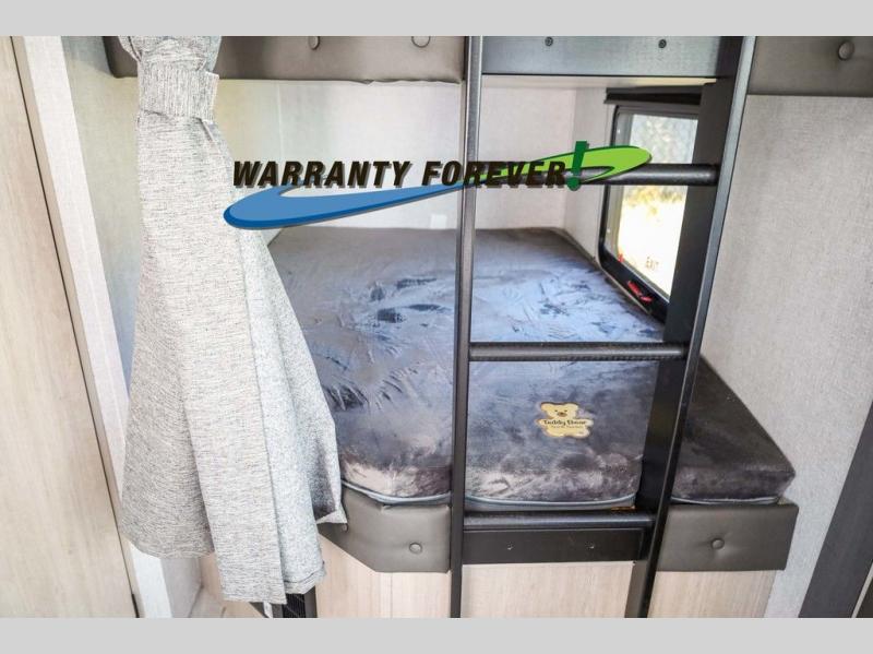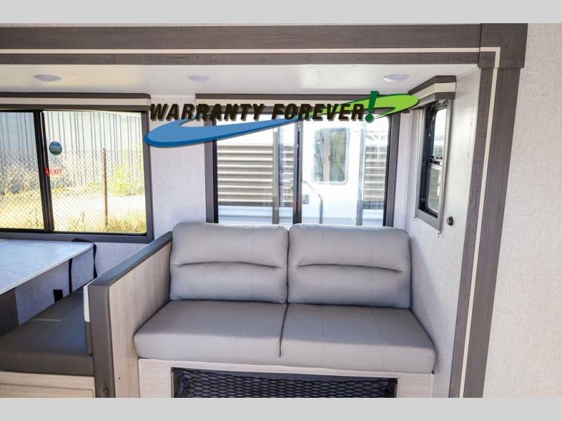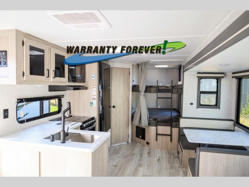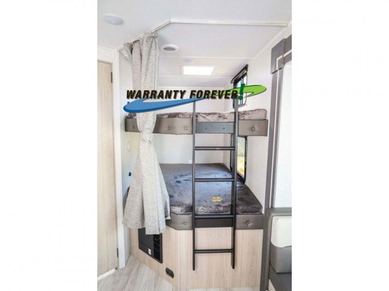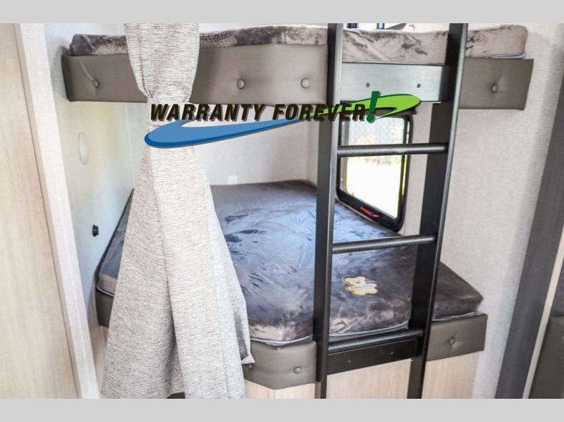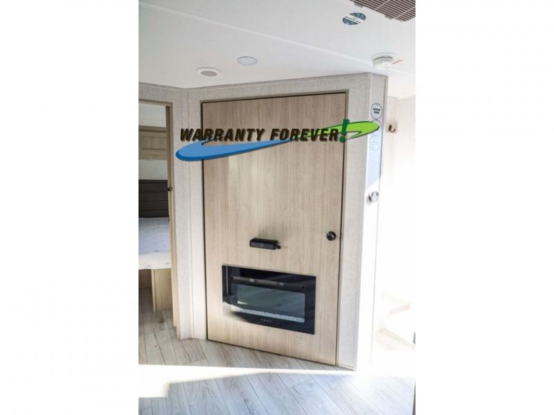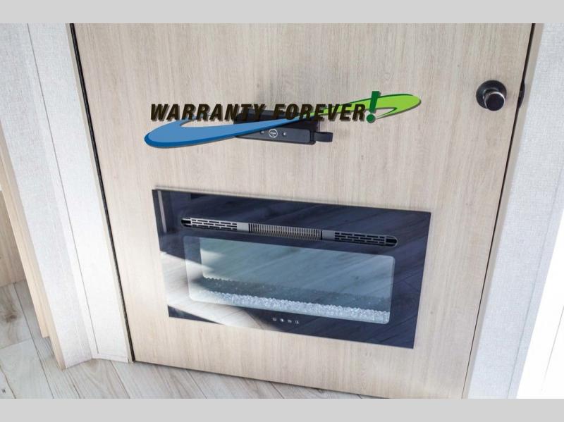 Pack your bags and hitch up this travel trailer for a fun family adventure! You will get a good night's rest on the front king bed in the front private bedroom, and the kids can sleep on the double bunk beds with storage. You could even transform the booth dinette with storage underneath it and the jiffy sofa which can be switched out for the optional theater seat or optional tri-fold sofa. The entertainment center has a fireplace for a cozy evening indoors and a hidden pantry behind it for all of your movie night snacks. With dual entry doors, it will be easy to enter and exit this unit especially from the rear corner bathroom which has one of the entry/exit doors to the unit. Enjoy cooking breakfast outside at the outdoor kitchen complete with a pull-out griddle and fridge!