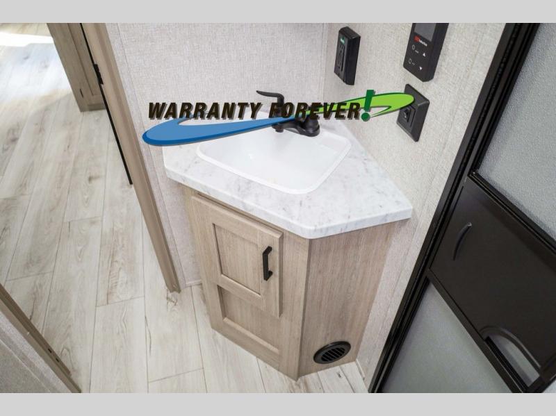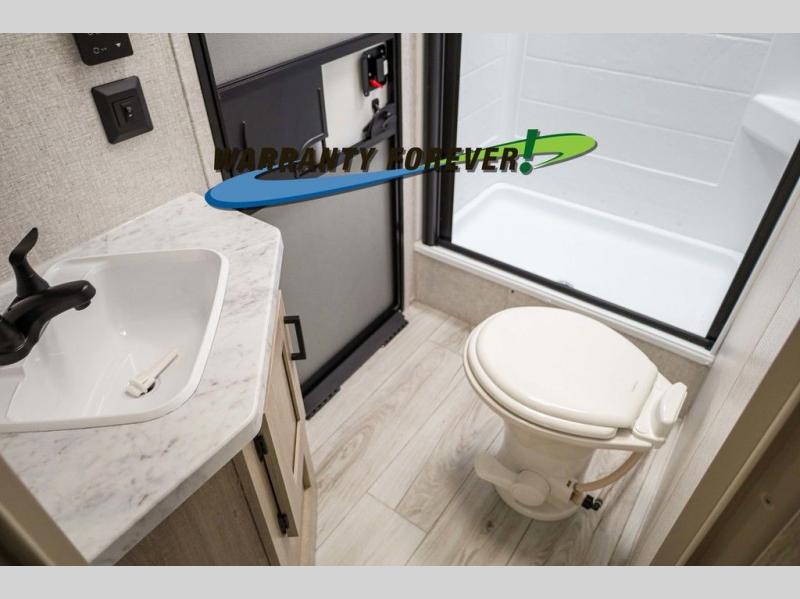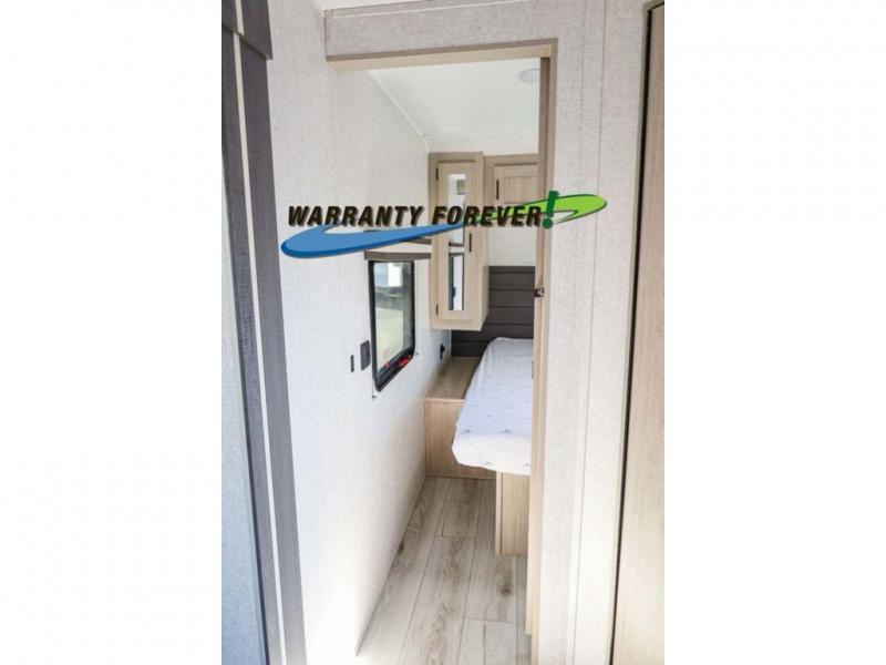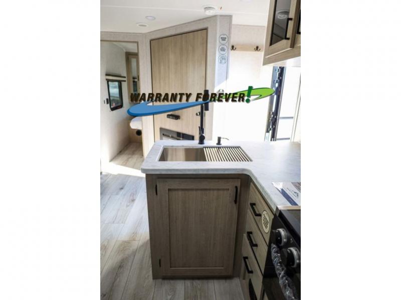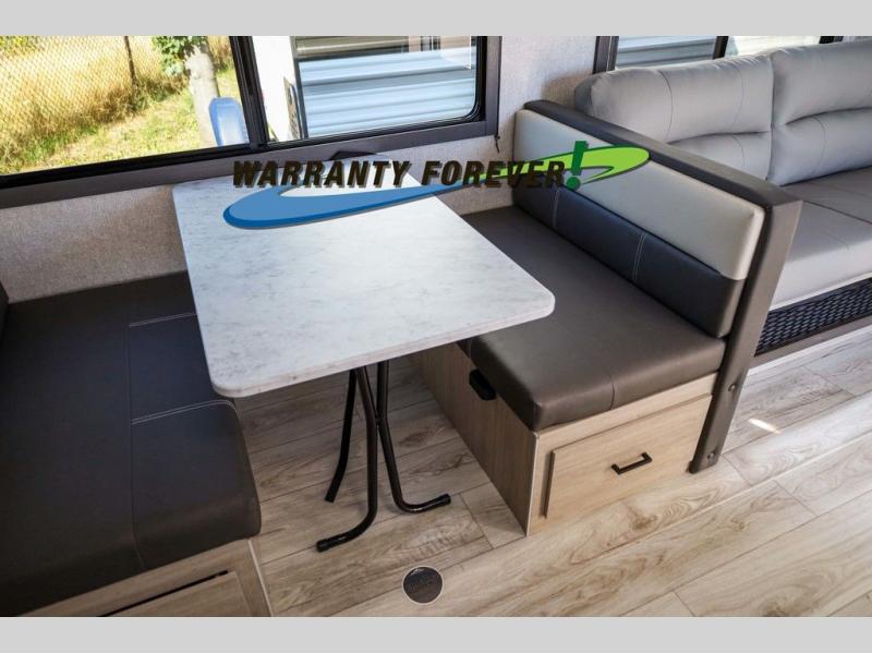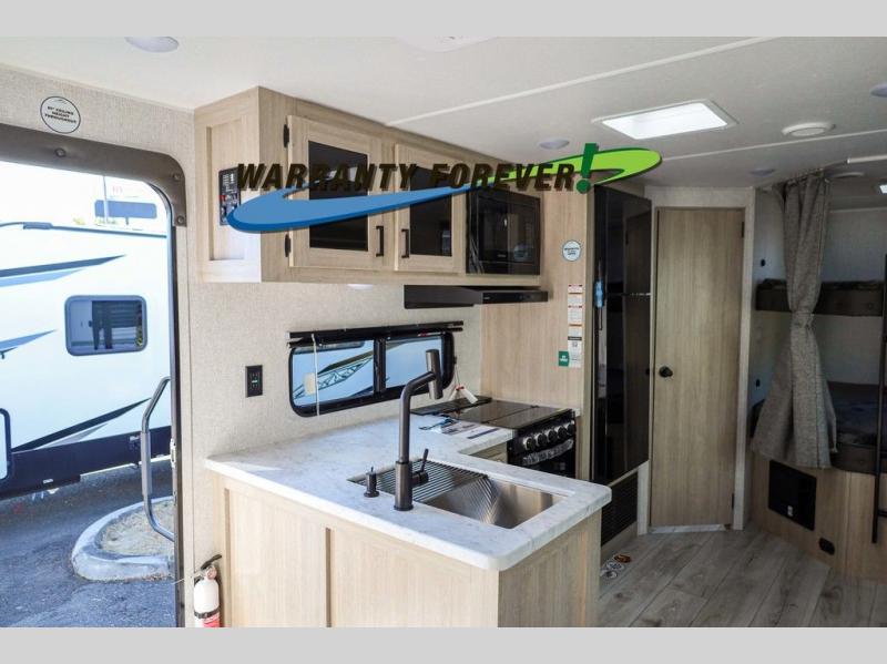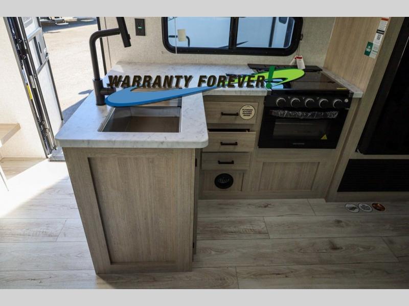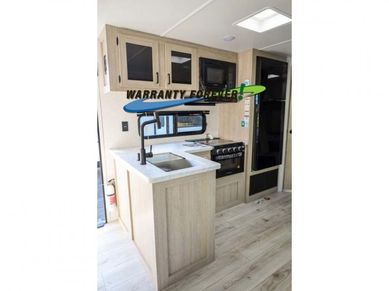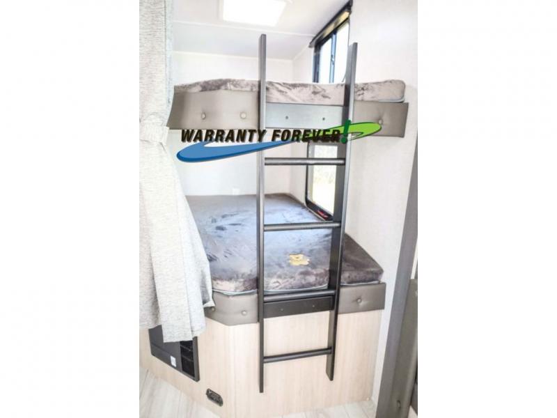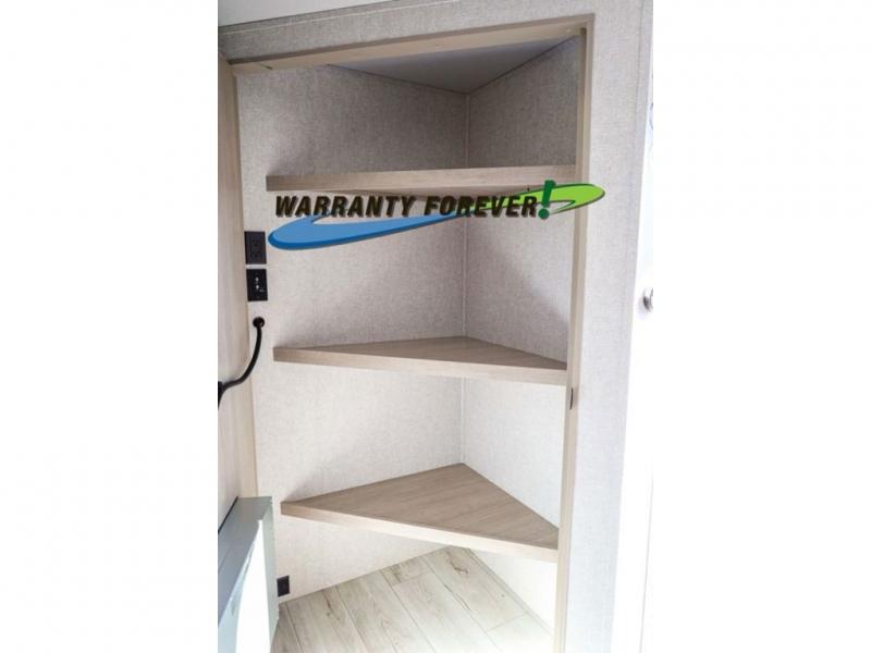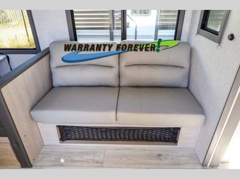 Pack your bags and hitch up this travel trailer for a fun family adventure! You will get a good night's rest on the front king bed in the front private bedroom, and the kids can sleep on the double bunk beds with storage. You could even transform the booth dinette with storage underneath it and the jiffy sofa which can be switched out for the optional theater seat or optional tri-fold sofa. The entertainment center has a fireplace for a cozy evening indoors and a hidden pantry behind it for all of your movie night snacks. With dual entry doors, it will be easy to enter and exit this unit especially from the rear corner bathroom which has one of the entry/exit doors to the unit. Enjoy cooking breakfast outside at the outdoor kitchen complete with a pull-out griddle and fridge!