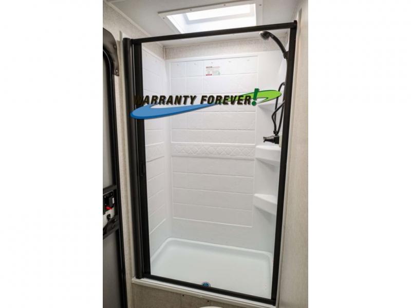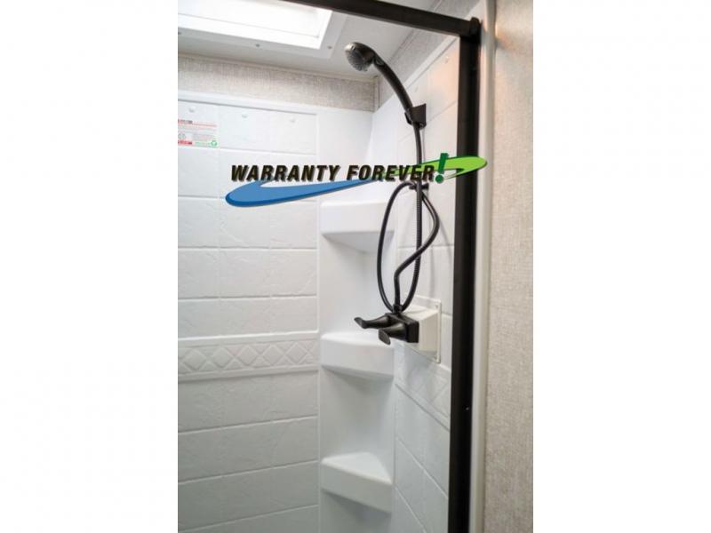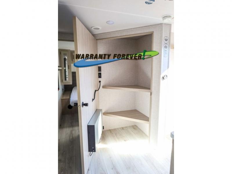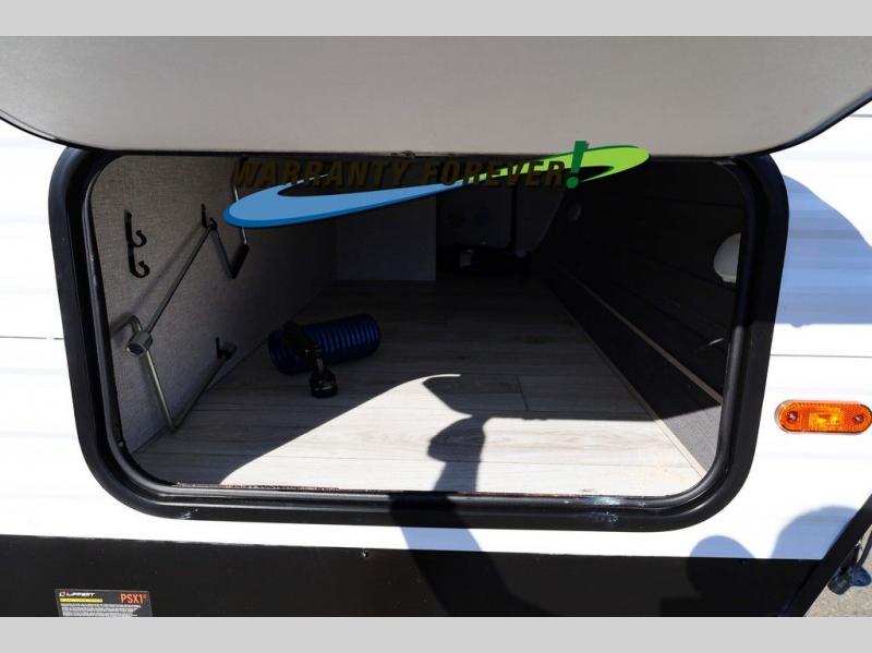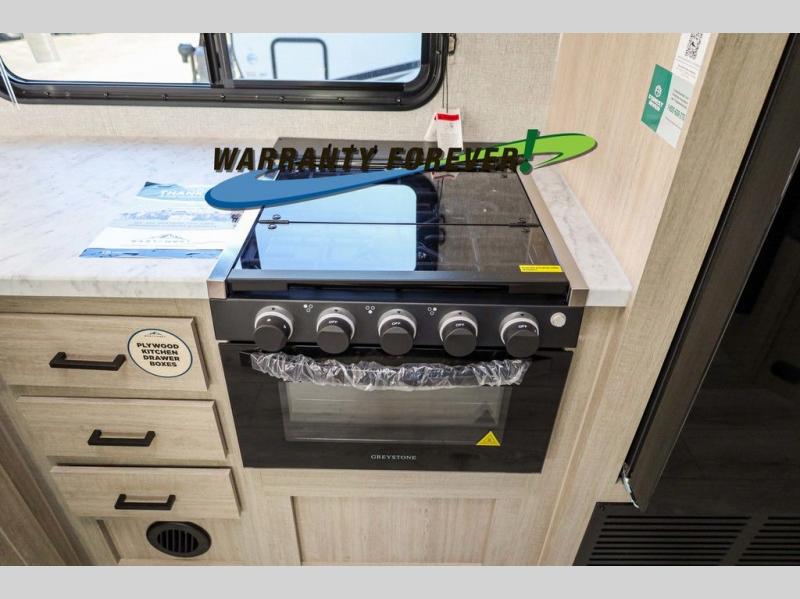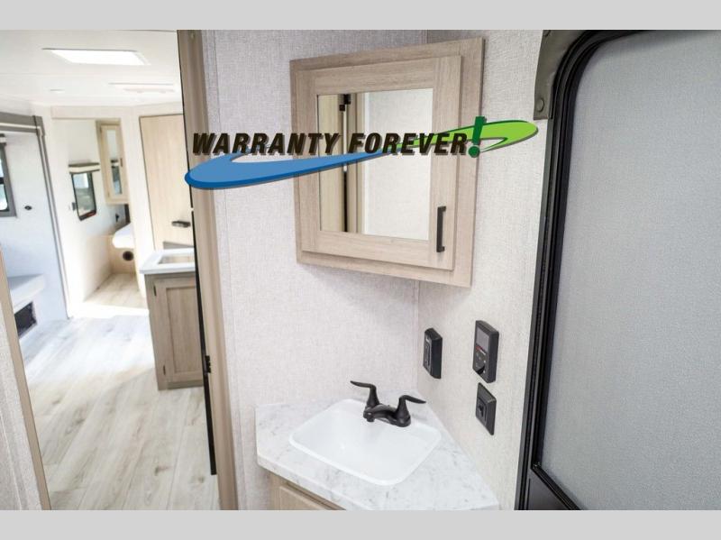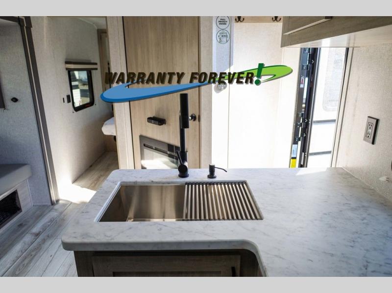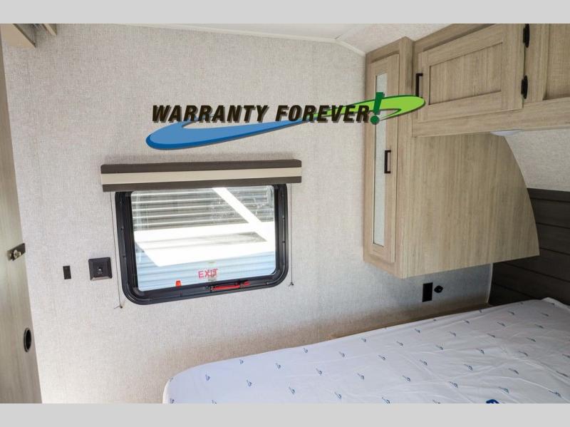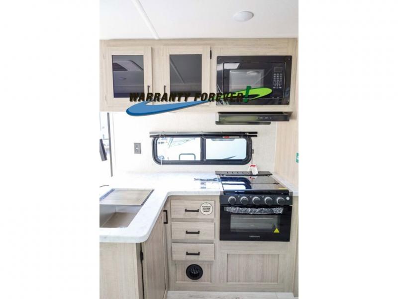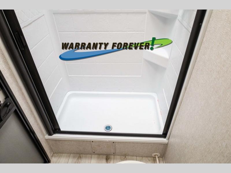 Pack your bags and hitch up this travel trailer for a fun family adventure! You will get a good night's rest on the front king bed in the front private bedroom, and the kids can sleep on the double bunk beds with storage. You could even transform the booth dinette with storage underneath it and the jiffy sofa which can be switched out for the optional theater seat or optional tri-fold sofa. The entertainment center has a fireplace for a cozy evening indoors and a hidden pantry behind it for all of your movie night snacks. With dual entry doors, it will be easy to enter and exit this unit especially from the rear corner bathroom which has one of the entry/exit doors to the unit. Enjoy cooking breakfast outside at the outdoor kitchen complete with a pull-out griddle and fridge!