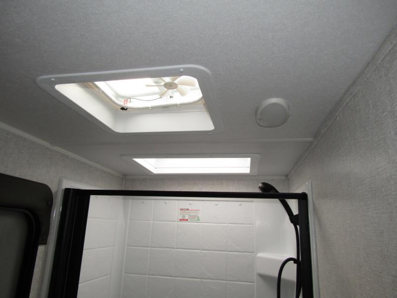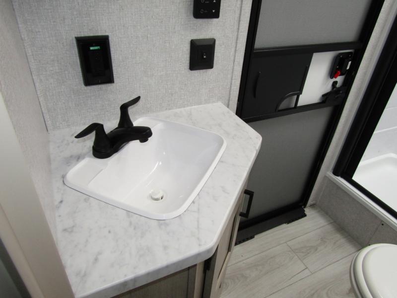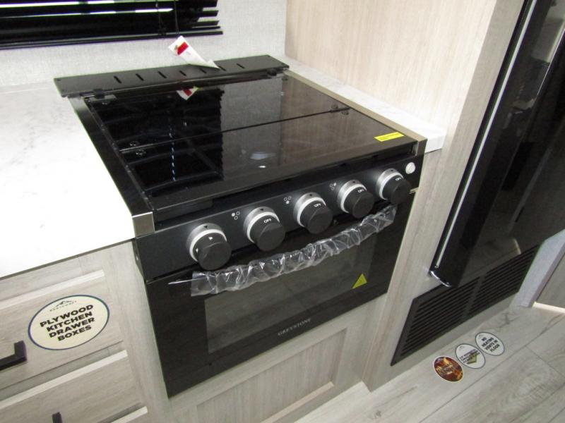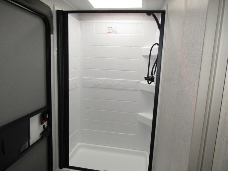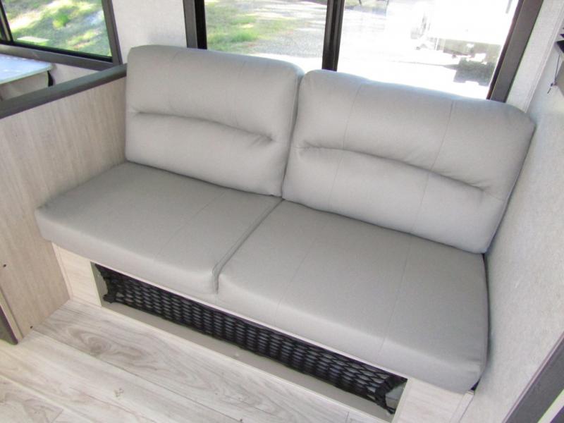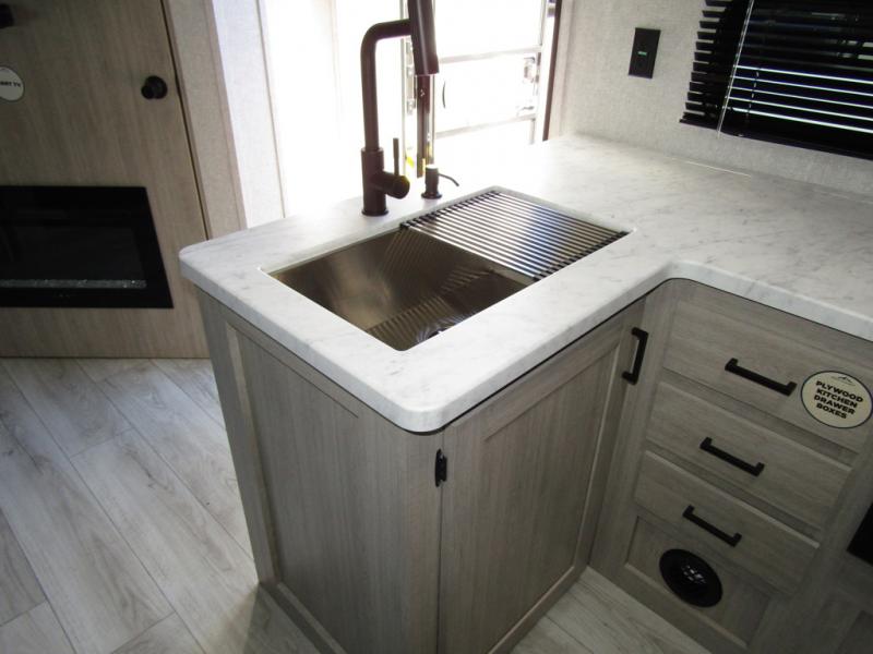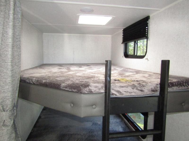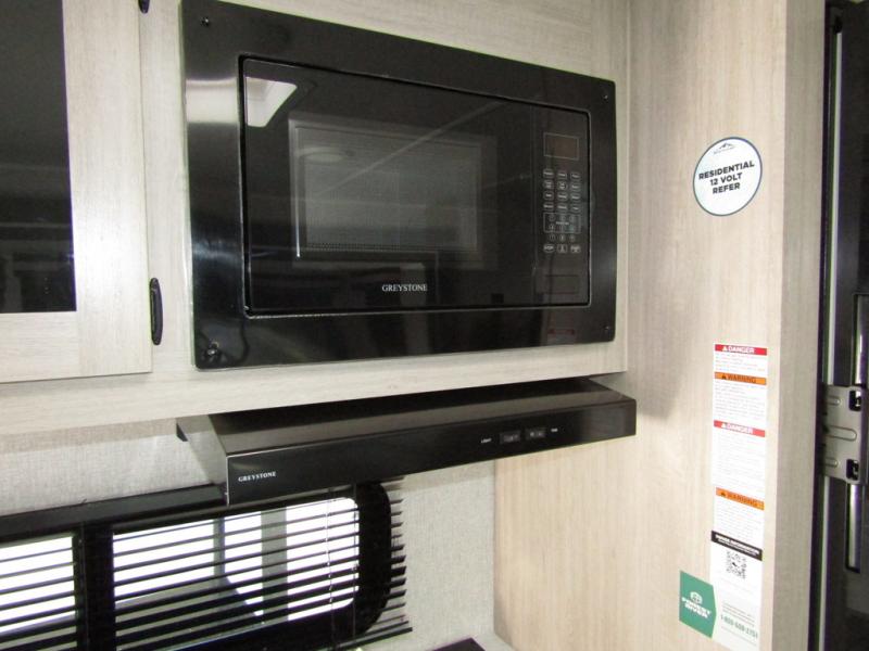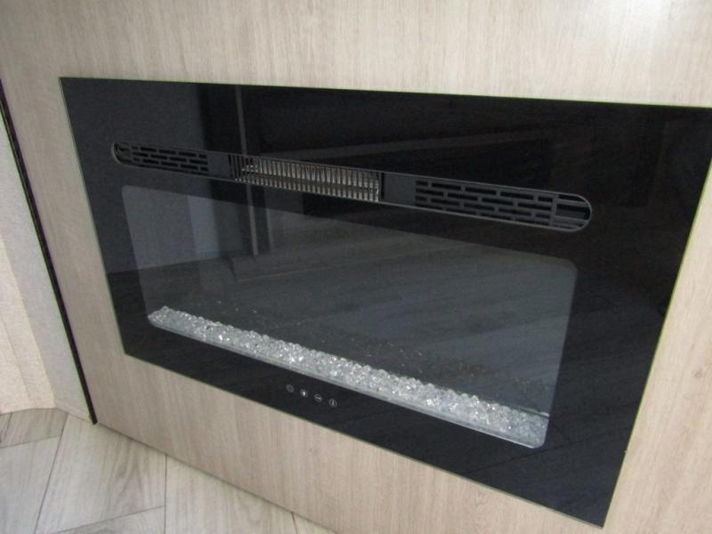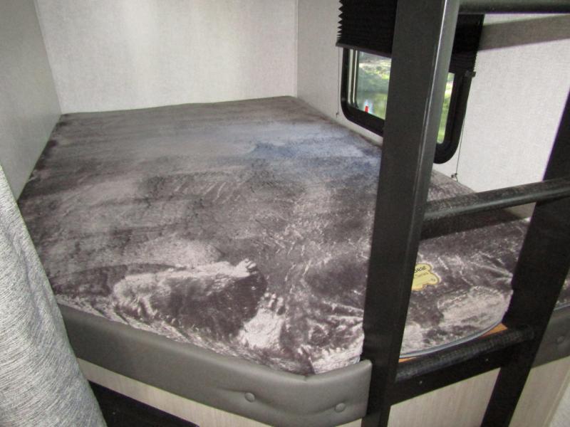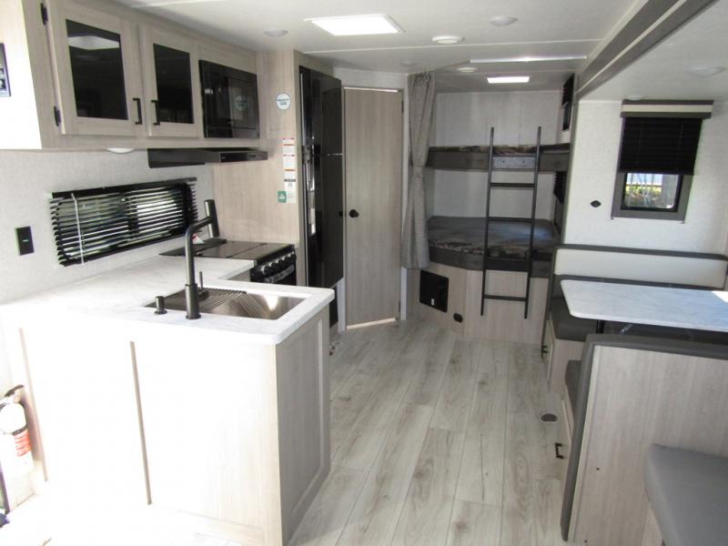 Pack your bags and hitch up this travel trailer for a fun family adventure! You will get a good night's rest on the front king bed in the front private bedroom, and the kids can sleep on the double bunk beds with storage. You could even transform the booth dinette with storage underneath it and the jiffy sofa which can be switched out for the optional theater seat or optional tri-fold sofa. The entertainment center has a fireplace for a cozy evening indoors and a hidden pantry behind it for all of your movie night snacks. With dual entry doors, it will be easy to enter and exit this unit especially from the rear corner bathroom which has one of the entry/exit doors to the unit. Enjoy cooking breakfast outside at the outdoor kitchen complete with a pull-out griddle and fridge!