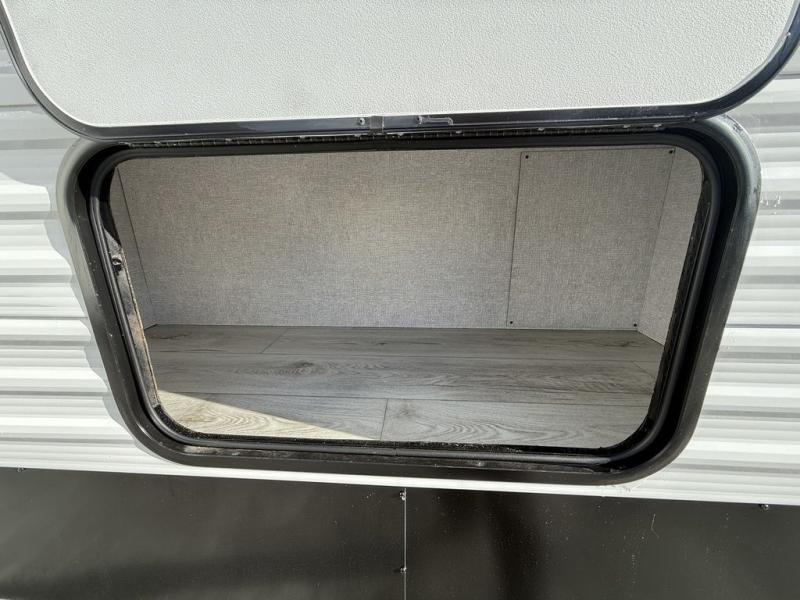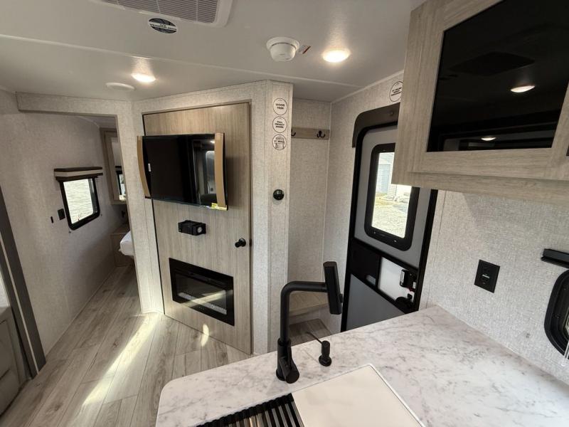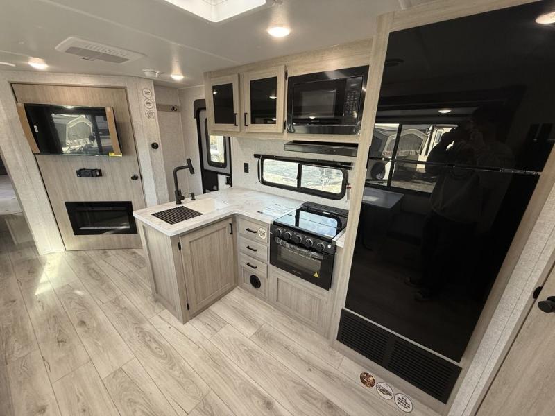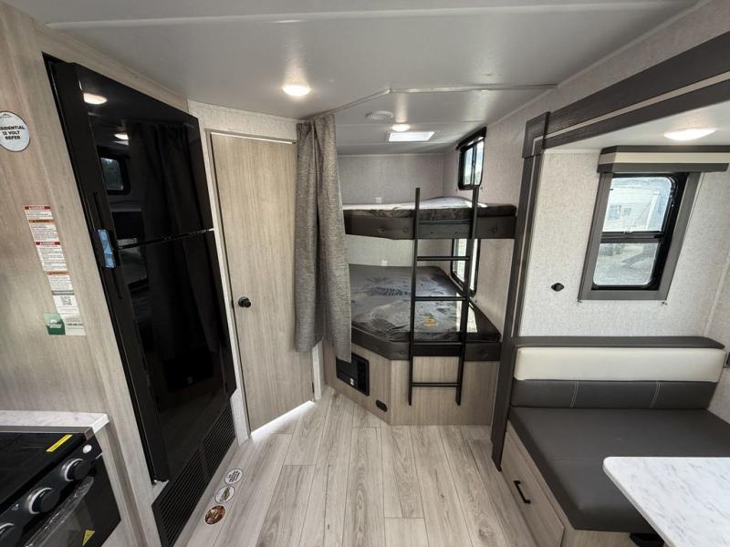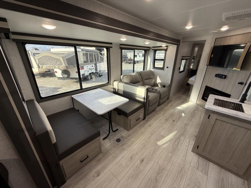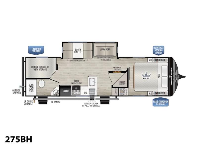 Pack your bags and hitch up this travel trailer for a fun family adventure! You will get a good night's rest on the front king bed in the front private bedroom, and the kids can sleep on the double bunk beds with storage. You could even transform the booth dinette with storage underneath it and the jiffy sofa which can be switched out for the optional theater seat or optional tri-fold sofa. The entertainment center has a fireplace for a cozy evening indoors and a hidden pantry behind it for all of your movie night snacks. With dual entry doors, it will be easy to enter and exit this unit especially from the rear corner bathroom which has one of the entry/exit doors to the unit. Enjoy cooking breakfast outside at the outdoor kitchen complete with a pull-out griddle and fridge!