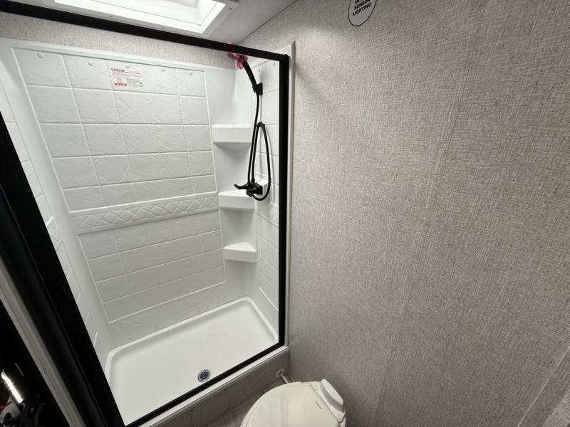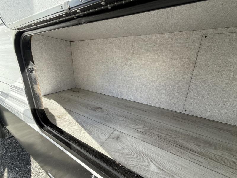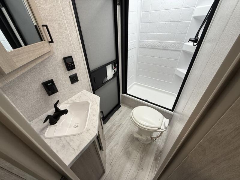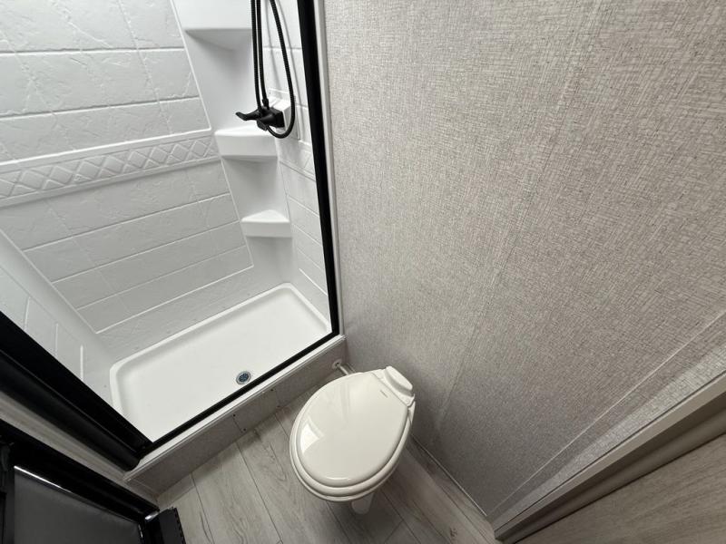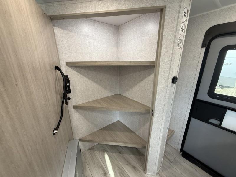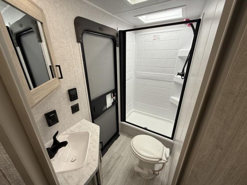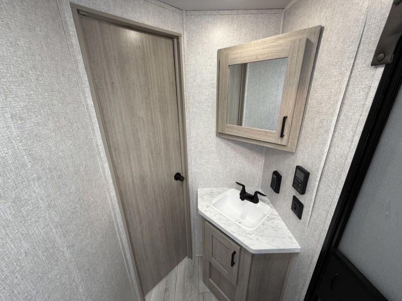 Pack your bags and hitch up this travel trailer for a fun family adventure! You will get a good night's rest on the front king bed in the front private bedroom, and the kids can sleep on the double bunk beds with storage. You could even transform the booth dinette with storage underneath it and the jiffy sofa which can be switched out for the optional theater seat or optional tri-fold sofa. The entertainment center has a fireplace for a cozy evening indoors and a hidden pantry behind it for all of your movie night snacks. With dual entry doors, it will be easy to enter and exit this unit especially from the rear corner bathroom which has one of the entry/exit doors to the unit. Enjoy cooking breakfast outside at the outdoor kitchen complete with a pull-out griddle and fridge!