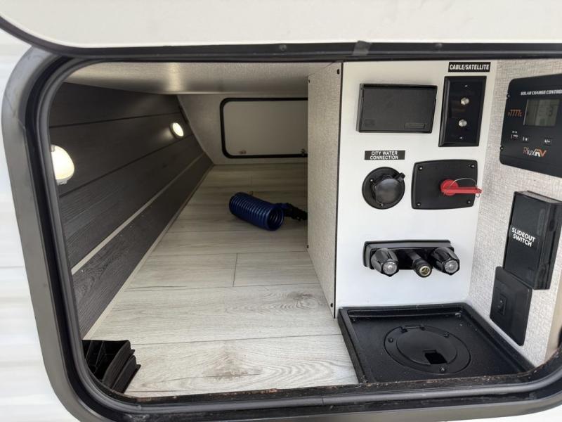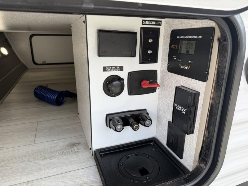 Each Della Terra travel trailer by EAST TO WEST is constructed with an enclosed and heated underbelly and enclosed holding tanks for added protection against the elements. There is also a power tongue jack with an LED light for easy set up and a power awning with LED lights you can rest under after you've unpacked. The Explore Comfort Package comes seamless pressed countertops, kitchen backsplash, window valance package with black night shades, and many more comforts. You will also appreciate the Adventure Outdoor Package with backup camera prep and solar prep, a tankless water heater, an RV grill quick disconnect, and a universal docking station with battery disconnect.