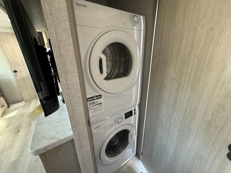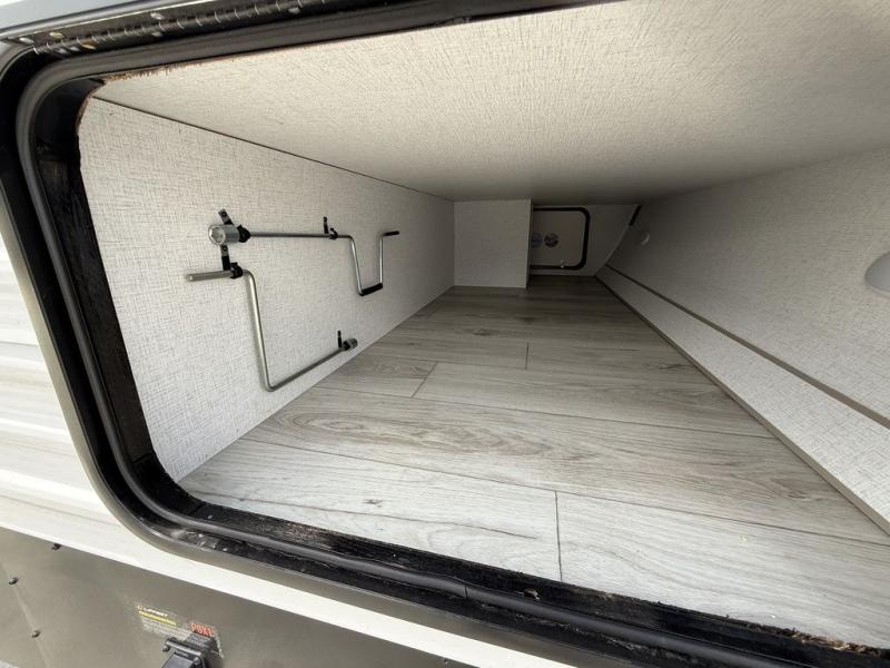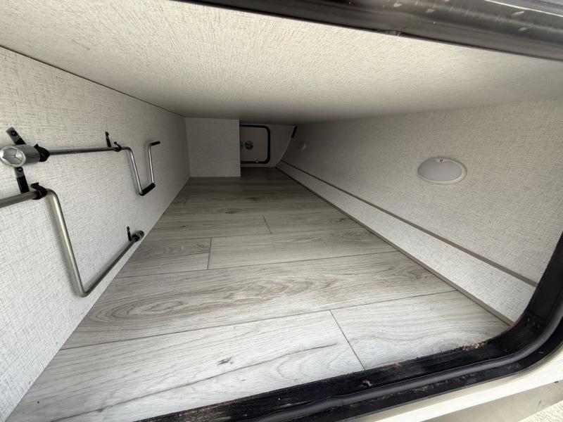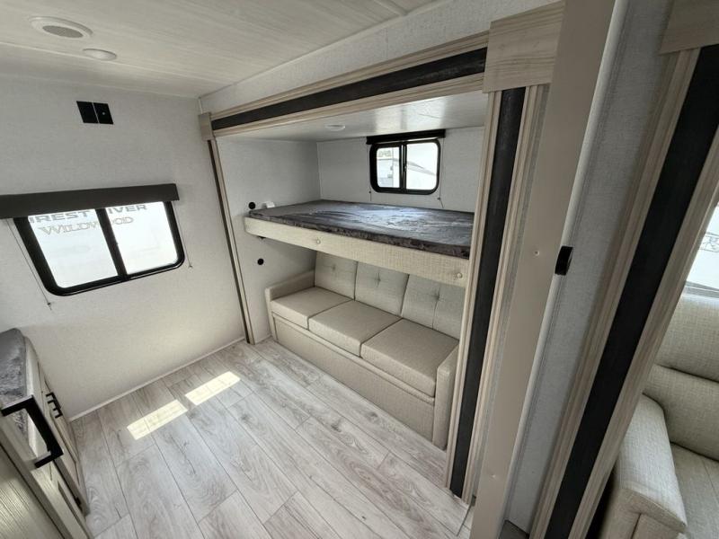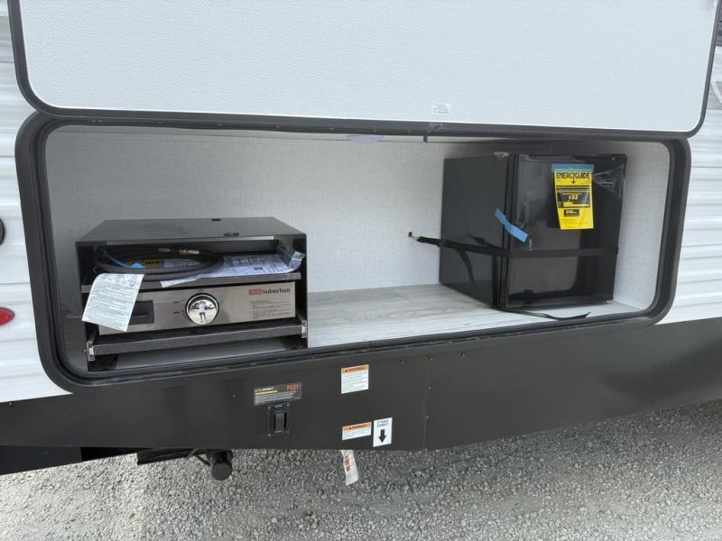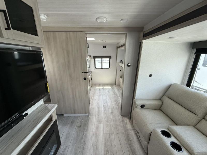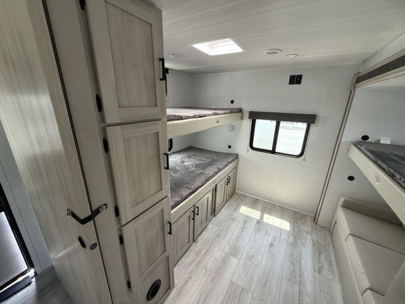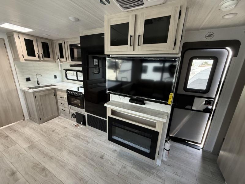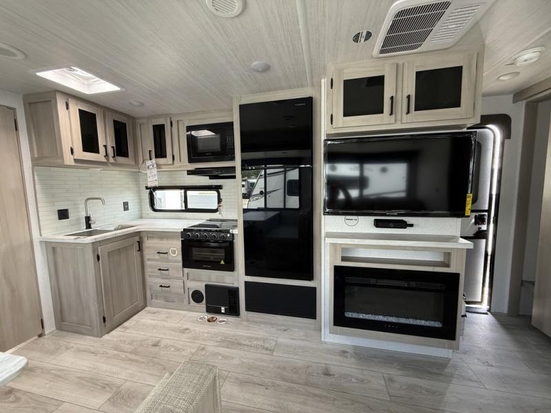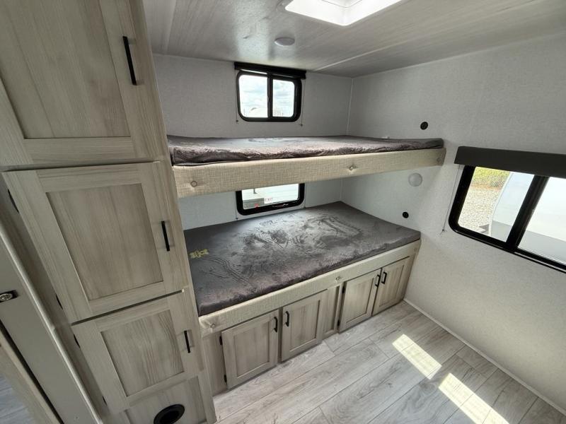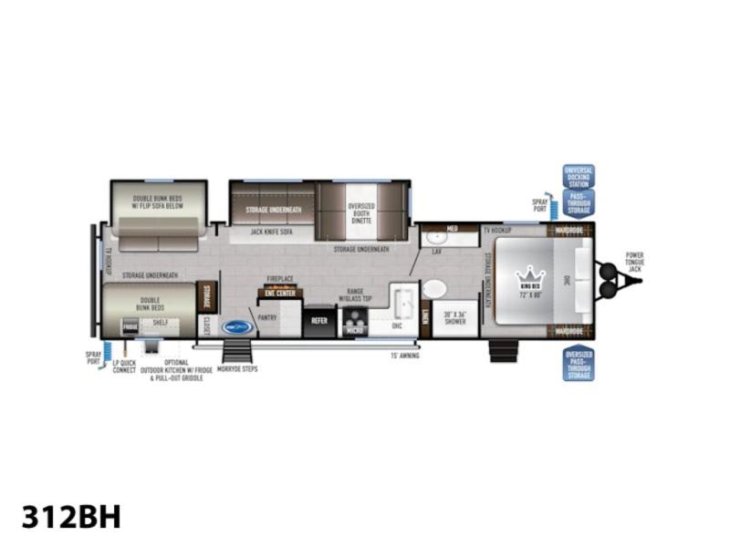Head to the RV park for a long-weekend or week-long break from your everyday routine with this trailer at your favorite campsite. After setting up the two slide outs and the 15' power awning, you can relax inside on the jack knife sofa, dine at the oversized booth dinette or whip up a meal in the L-shaped kitchen. Everyone will enjoy the fireplace no matter what you are doing. The walk-through bathroom is super convenient, and the front bedroom allows you to live like royalty in privacy. The rear bunkhouse also offers privacy and includes three bunk beds and a sofa, plus storage. Your kids or guests will love having their own room. And the exterior offers an optional outdoor kitchen, an oversized pass-through storage for your larger gear like fishing poles, outdoor tables and bags of charcoal, plus there are two spray ports to easily rinse off dirty bikes, shoes and such.