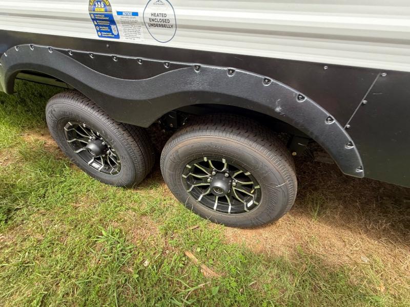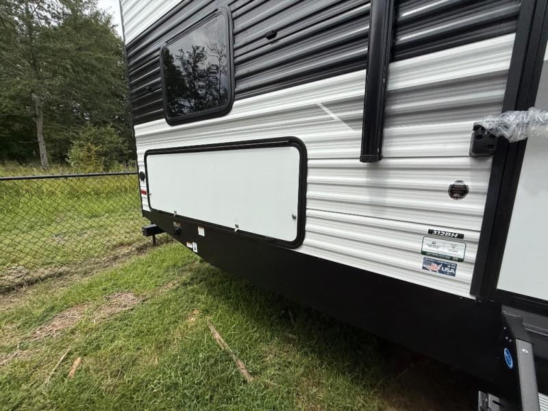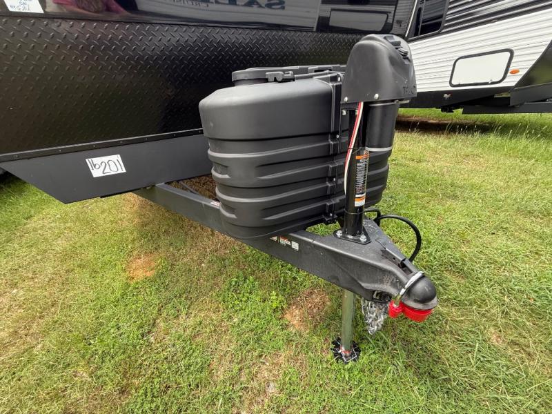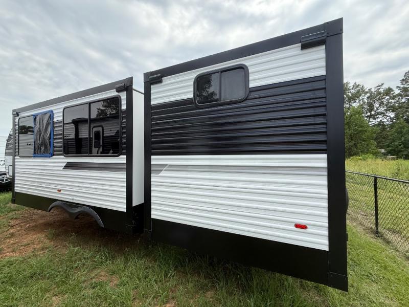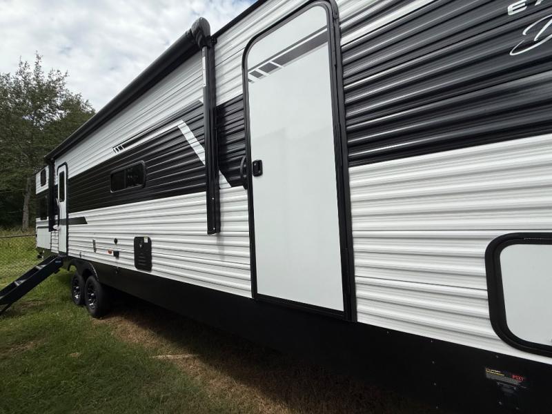 Head to the RV park for a long-weekend or week-long break from your everyday routine with this trailer at your favorite campsite. After setting up the two slide outs and the 15' power awning, you can relax inside on the jack knife sofa, dine at the oversized booth dinette or whip up a meal in the L-shaped kitchen. Everyone will enjoy the fireplace no matter what you are doing. The walk-through bathroom is super convenient, and the front bedroom allows you to live like royalty in privacy. The rear bunkhouse also offers privacy and includes three bunk beds and a sofa, plus storage. Your kids or guests will love having their own room. And the exterior offers an optional outdoor kitchen, an oversized pass-through storage for your larger gear like fishing poles, outdoor tables and bags of charcoal, plus there are two spray ports to easily rinse off dirty bikes, shoes and such.