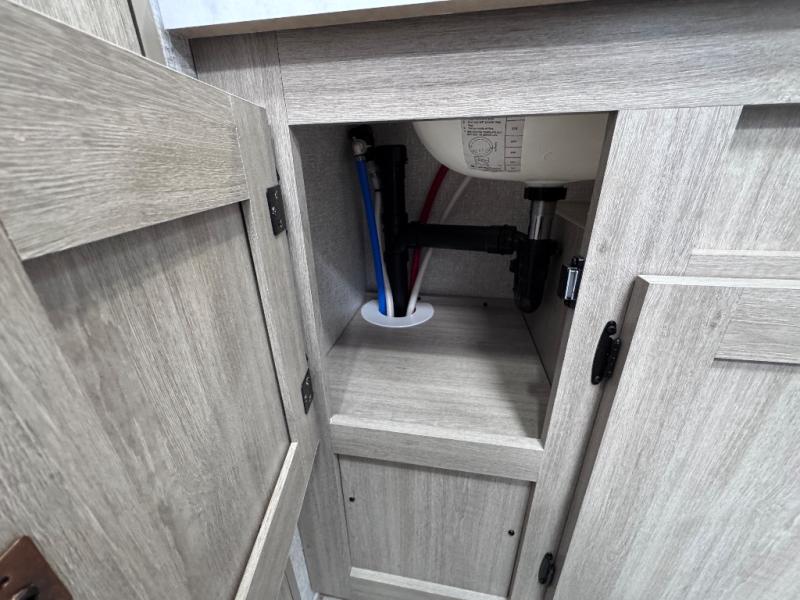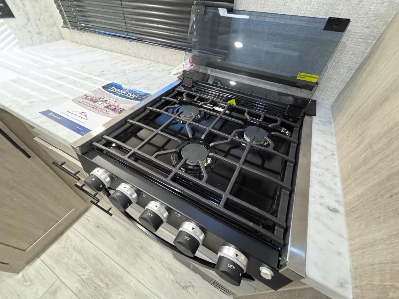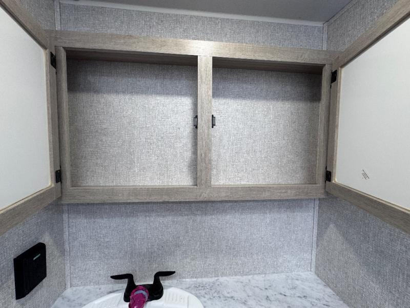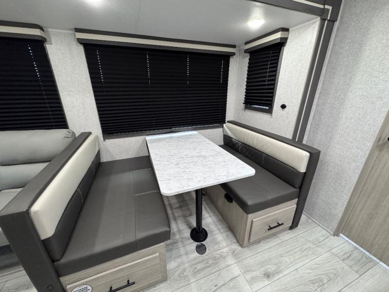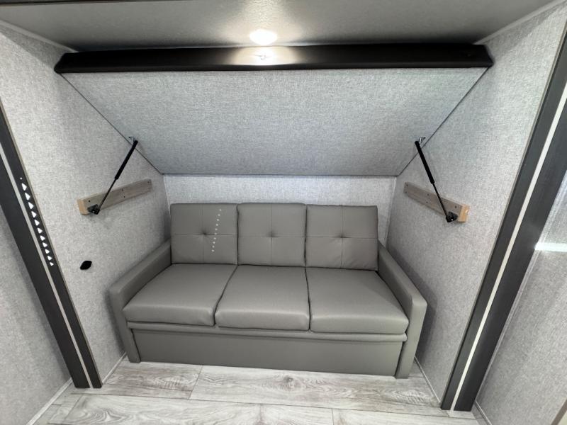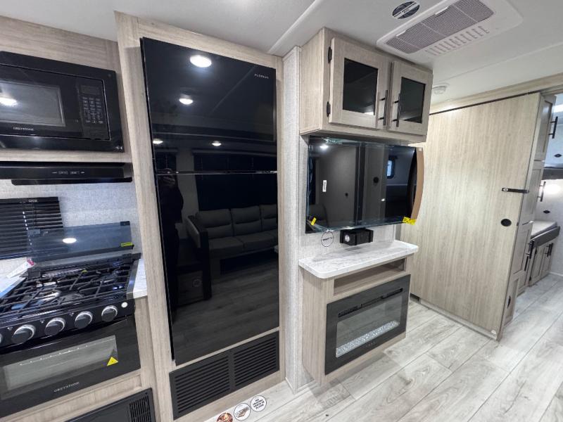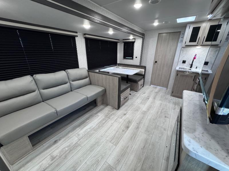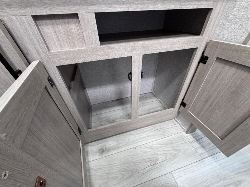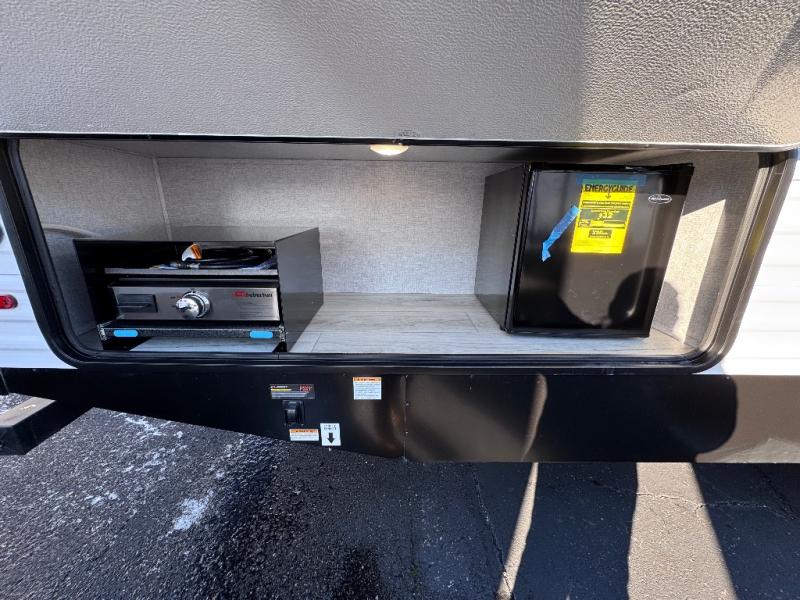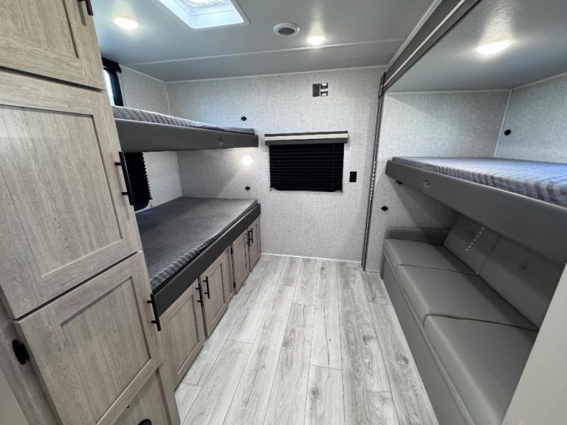 Head to the RV park for a long-weekend or week-long break from your everyday routine with this trailer at your favorite campsite. After setting up the two slide outs and the 15' power awning, you can relax inside on the jack knife sofa, dine at the oversized booth dinette or whip up a meal in the L-shaped kitchen. Everyone will enjoy the fireplace no matter what you are doing. The walk-through bathroom is super convenient, and the front bedroom allows you to live like royalty in privacy. The rear bunkhouse also offers privacy and includes three bunk beds and a sofa, plus storage. Your kids or guests will love having their own room. And the exterior offers an optional outdoor kitchen, an oversized pass-through storage for your larger gear like fishing poles, outdoor tables and bags of charcoal, plus there are two spray ports to easily rinse off dirty bikes, shoes and such.