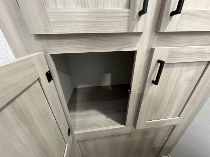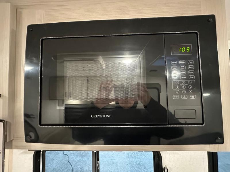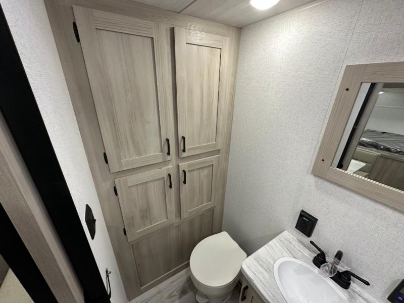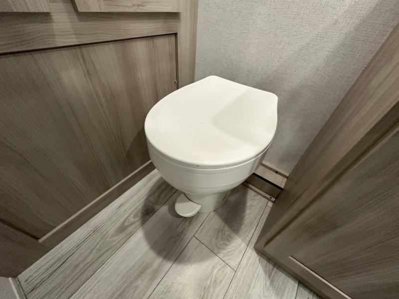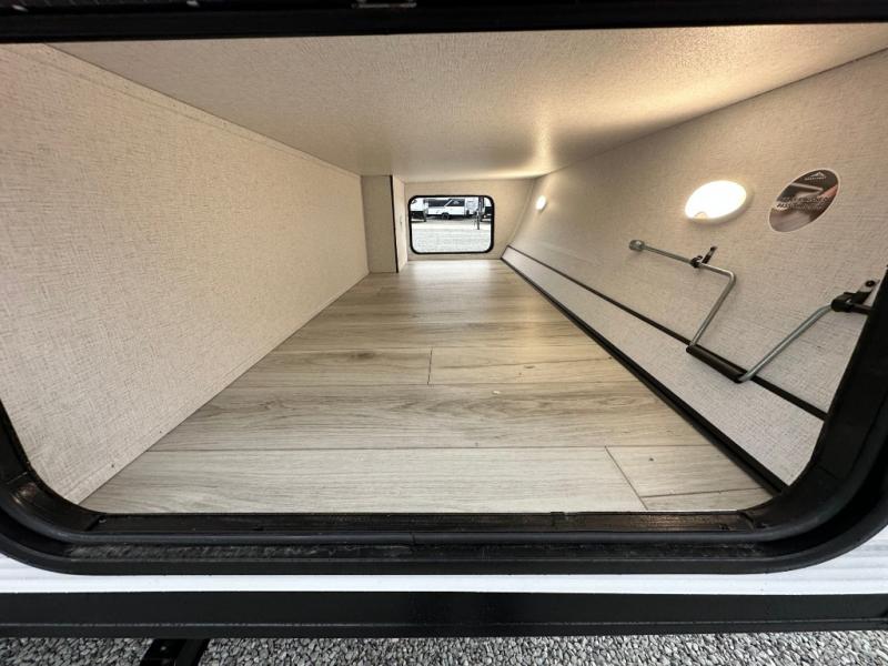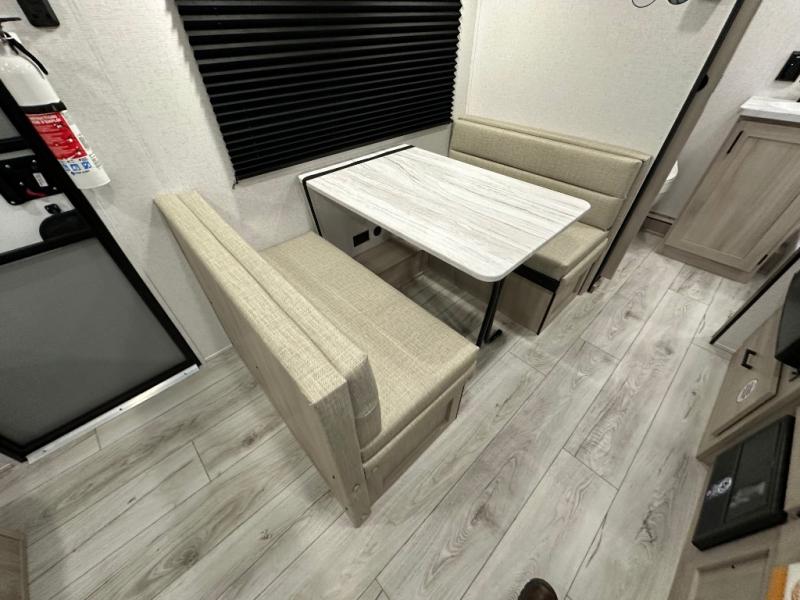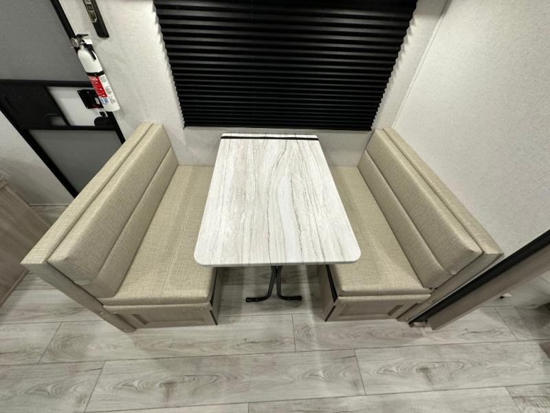 This Della Terra LE model is the perfect couples unit featuring a front queen bed that features flip-up storage and an overhead shelf for books. There is a booth dinette with storage beneath the seats to accommodate everyone for a meal, or to gather for a game of cards. You will appreciate the rear bath featuring a 24" x 40" walk-in shower, toilet, vanity/sink with a medicine cabinet, and additional storage for towels. The kitchen allows you to cook while you travel inside with a refrigerator, two burner range, and overhead microwave oven. A 12' awning outside offers an added living space protected from the sun and rain, and your camp chairs and outside equipment and games can be neatly tucked away in the large pass-through storage up front.