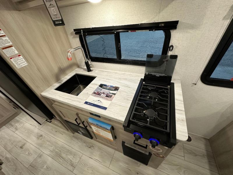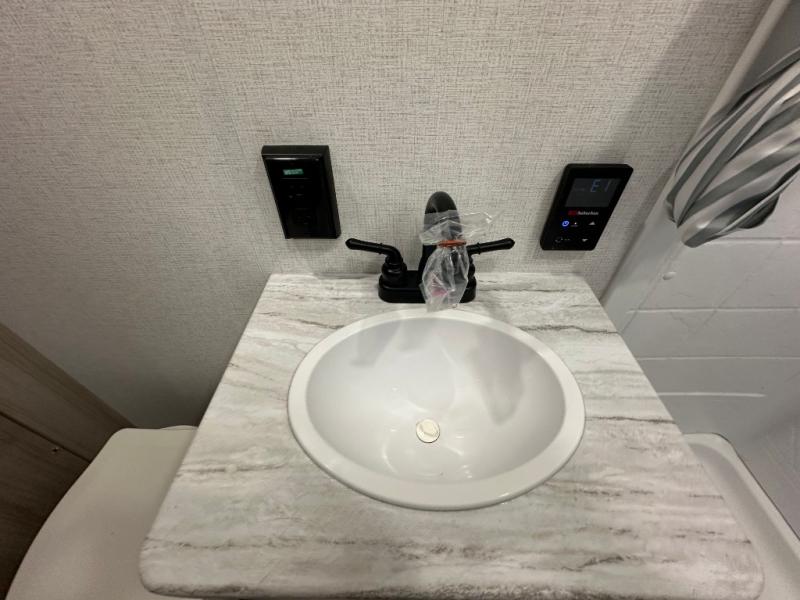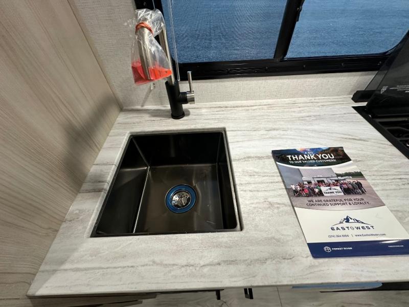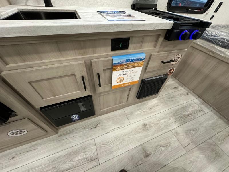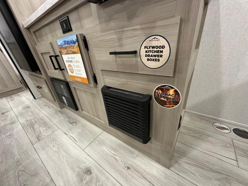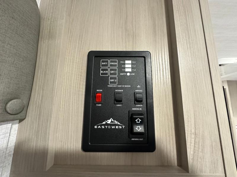 With any Della Terra LE travel trailer by EAST TO WEST, you will enjoy lightweight towing thanks to the single axle, along with many interior comforts. Each model is 8' wide with a 6' 9" interior ceiling height so you can walk around freely. There are seamless countertops also, along with motion sensor lights, a shower surround, and a USB charging station to keep your electronics ready to go. Outside, you'll find solar prep and ladder prep, an outside shower with hot and cold water, and a power awning with an LED light that will provide you with an inviting space outdoors.
