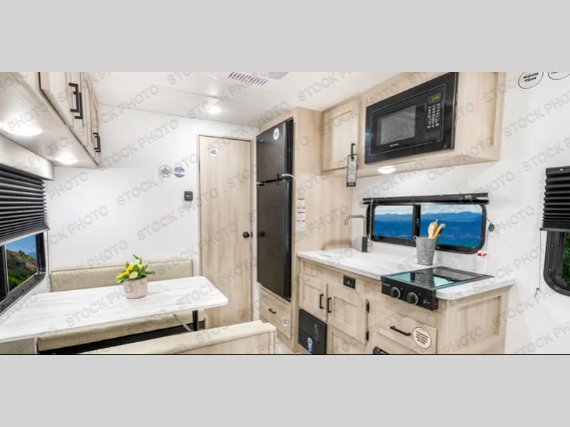 This Della Terra LE model is the perfect couples unit featuring a front queen bed that features flip-up storage and an overhead shelf for books. There is a booth dinette with storage beneath the seats to accommodate everyone for a meal, or to gather for a game of cards. You will appreciate the rear bath featuring a 24" x 40" walk-in shower, toilet, vanity/sink with a medicine cabinet, and additional storage for towels. The kitchen allows you to cook while you travel inside with a refrigerator, two burner range, and overhead microwave oven. A 12' awning outside offers an added living space protected from the sun and rain, and your camp chairs and outside equipment and games can be neatly tucked away in the large pass-through storage up front.