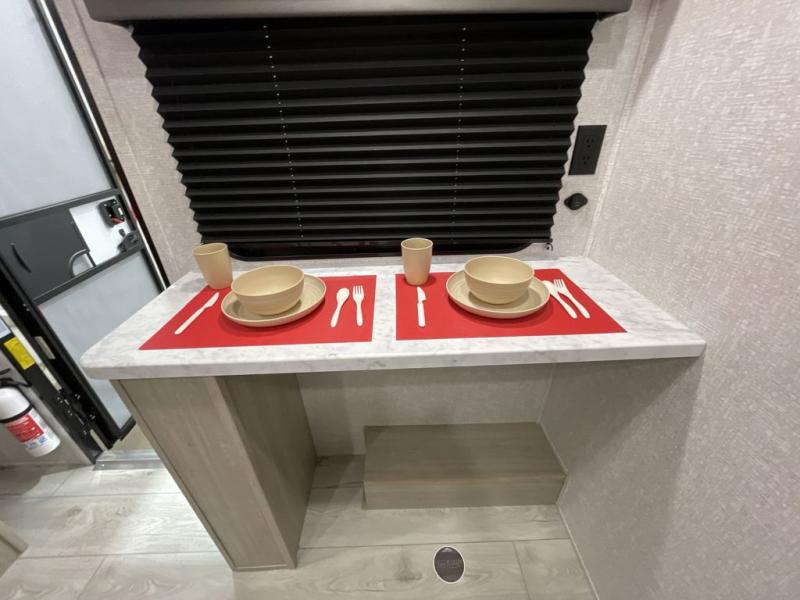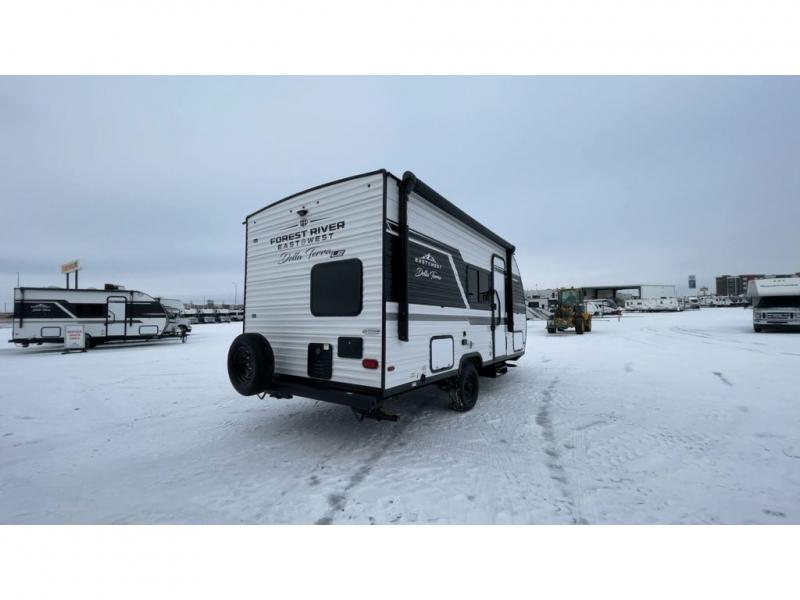 With any Della Terra LE travel trailer by EAST TO WEST, you will enjoy lightweight towing thanks to the single axle, along with many interior comforts. Each model is 8' wide with a 6' 9" interior ceiling height so you can walk around freely. There are seamless countertops also, along with motion sensor lights, a shower surround, and a USB charging station to keep your electronics ready to go. Outside, you'll find solar prep and ladder prep, an outside shower with hot and cold water, and a power awning with an LED light that will provide you with an inviting space outdoors.