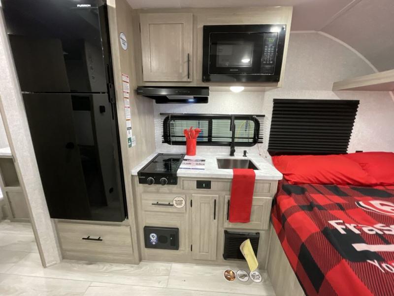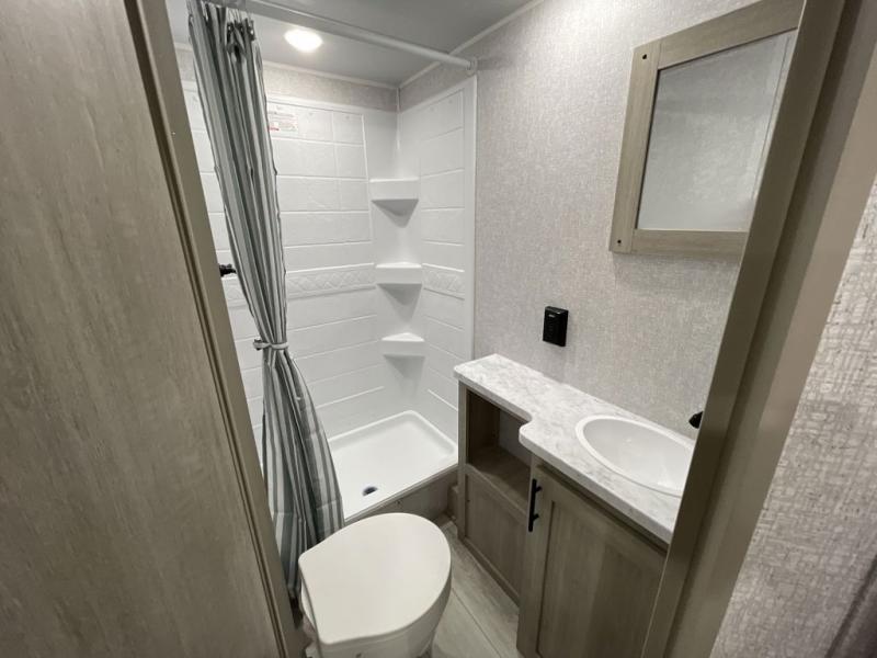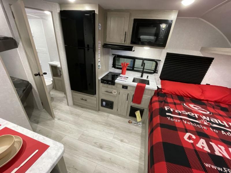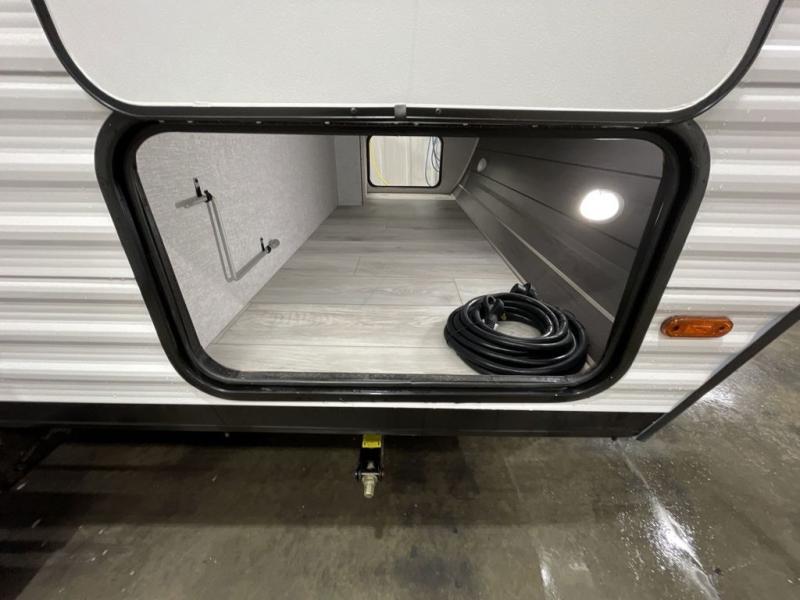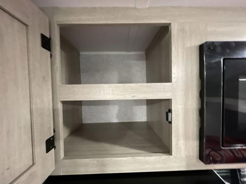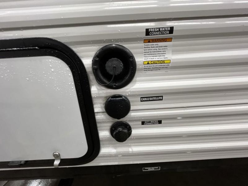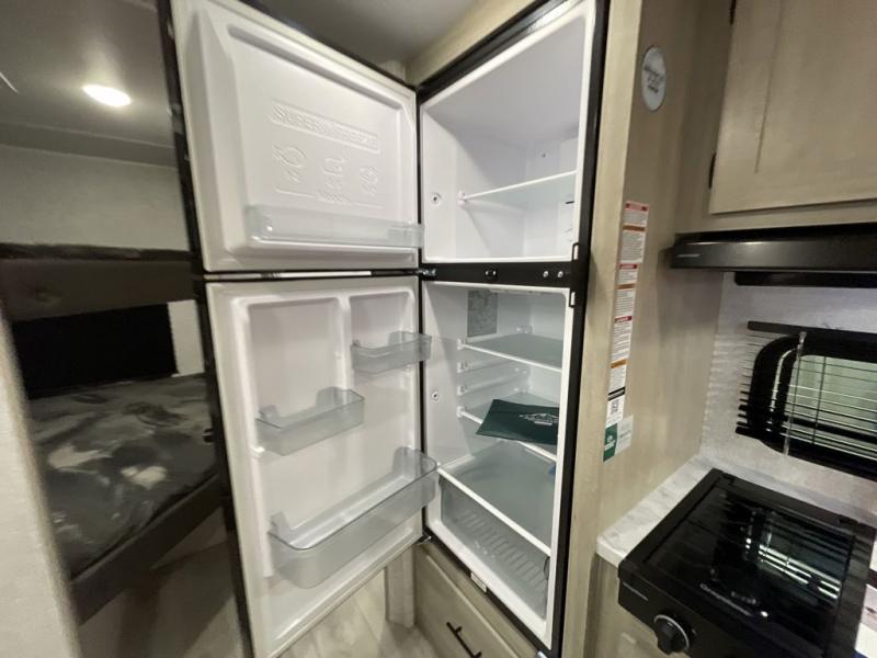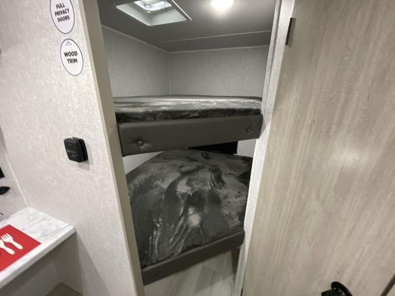 This is the perfect bunk travel trailer for your growing family. You will love the double-size bunks in back for the children or your guests, while you take the front queen bed. You can easily cook using the two burner range and microwave oven when you aren't cooking hotdogs and burgers over an open fire outside. There is flip-up storage under the front bed, under the booth dinette, and under the bunks. There is also a full bath with a walk-in shower that will allow you to freshen up without having to use the campground's facilities.