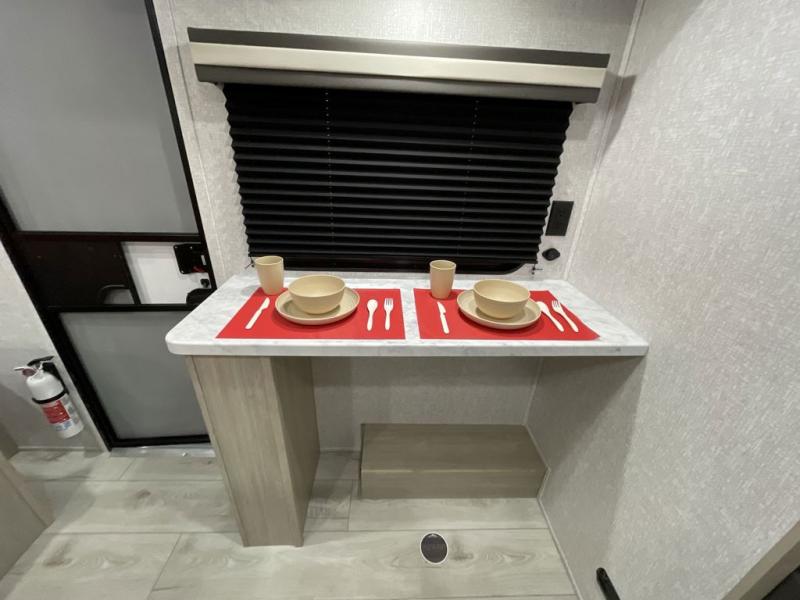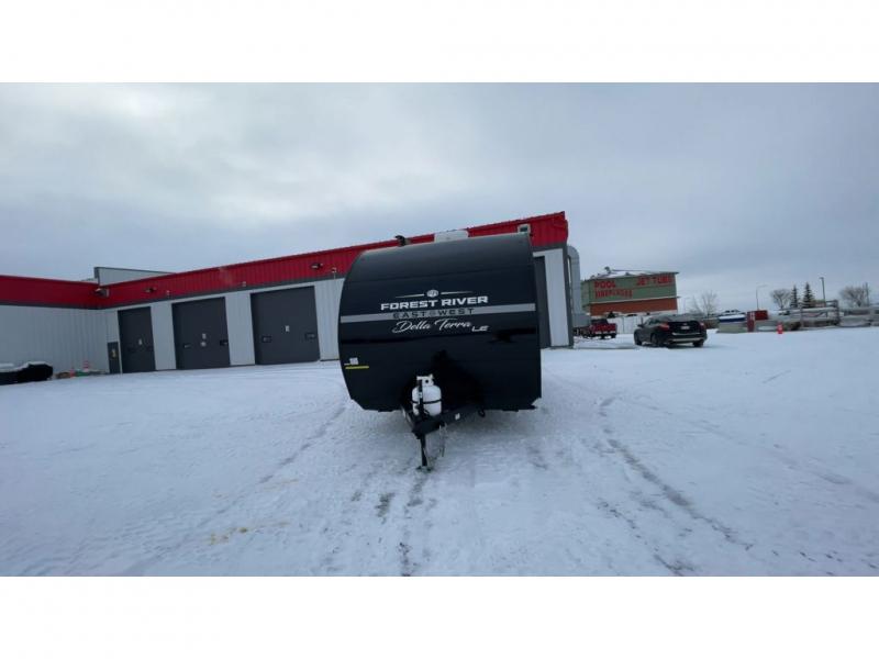 With any Della Terra LE travel trailer by EAST TO WEST, you will enjoy lightweight towing thanks to the single axle, along with many interior comforts. Each model is 8' wide with a 6' 9" interior ceiling height so you can walk around freely. There are seamless countertops also, along with motion sensor lights, a shower surround, and a USB charging station to keep your electronics ready to go. Outside, you'll find solar prep and ladder prep, an outside shower with hot and cold water, and a power awning with an LED light that will provide you with an inviting space outdoors.