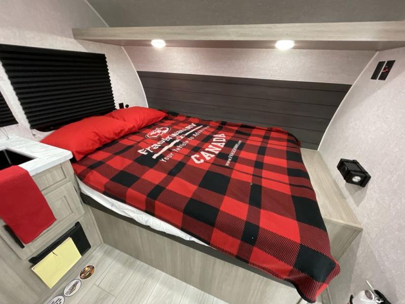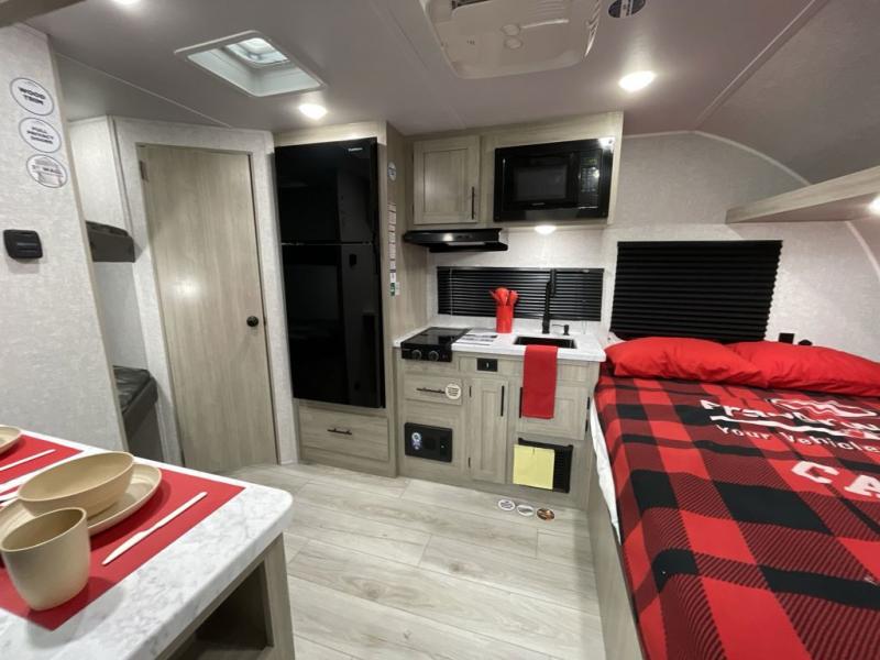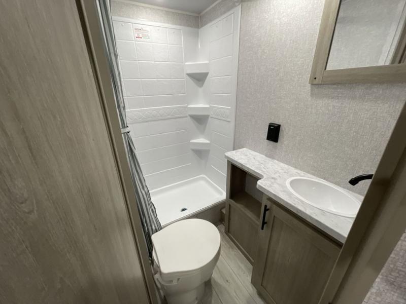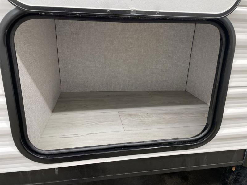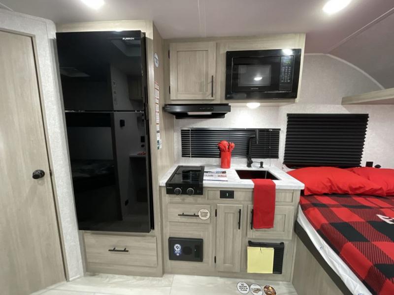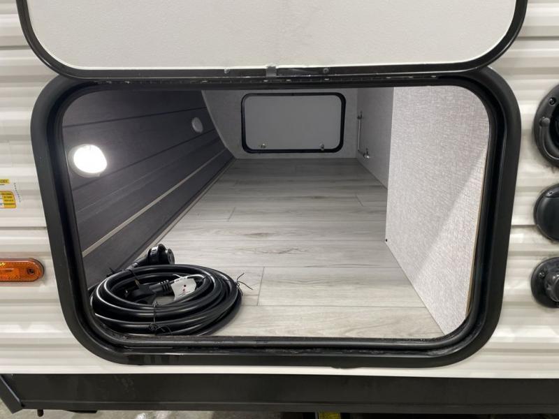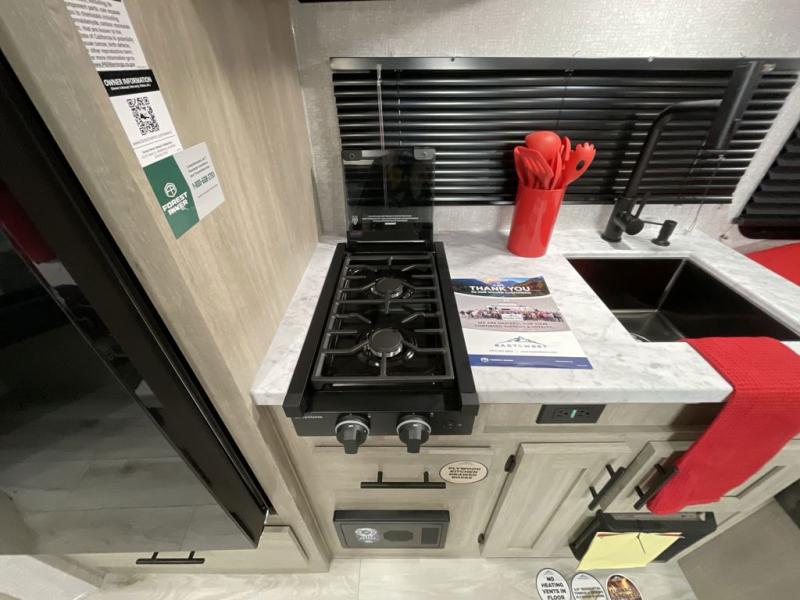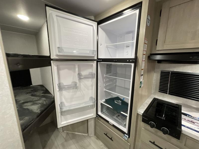 This is the perfect bunk travel trailer for your growing family. You will love the double-size bunks in back for the children or your guests, while you take the front queen bed. You can easily cook using the two burner range and microwave oven when you aren't cooking hotdogs and burgers over an open fire outside. There is flip-up storage under the front bed, under the booth dinette, and under the bunks. There is also a full bath with a walk-in shower that will allow you to freshen up without having to use the campground's facilities.