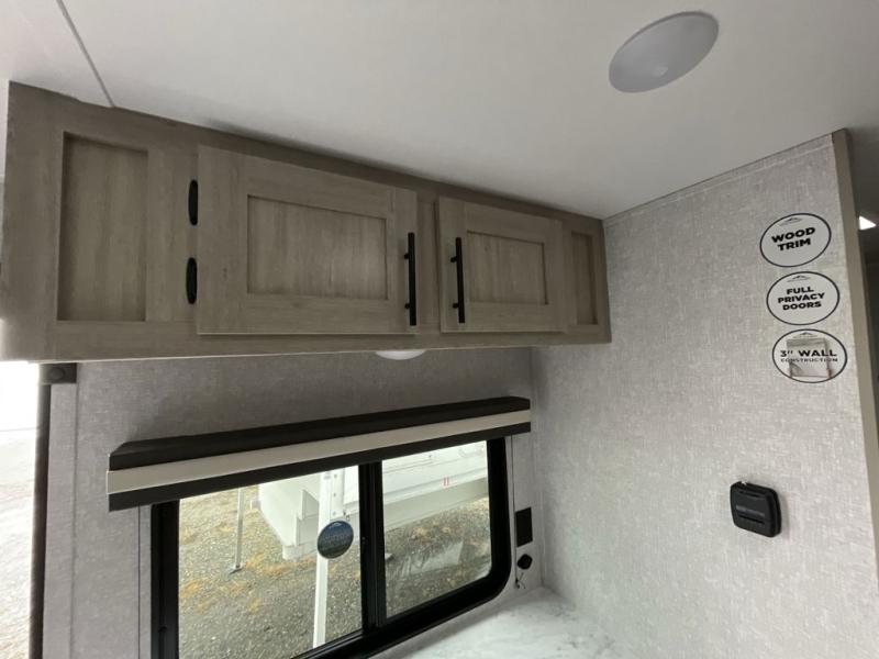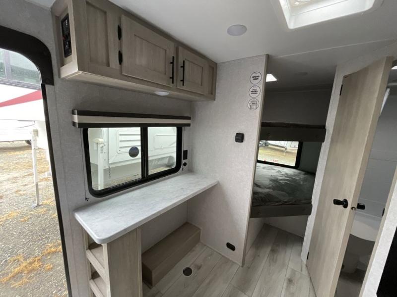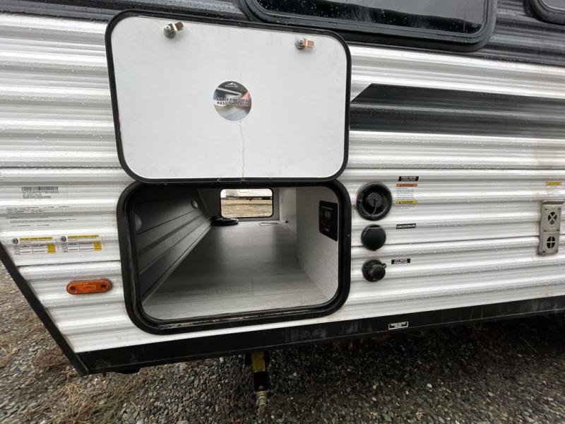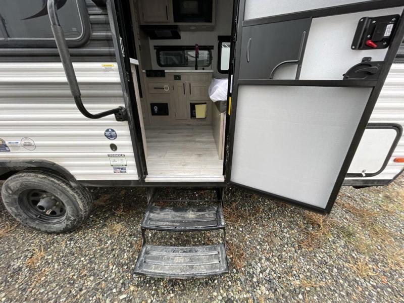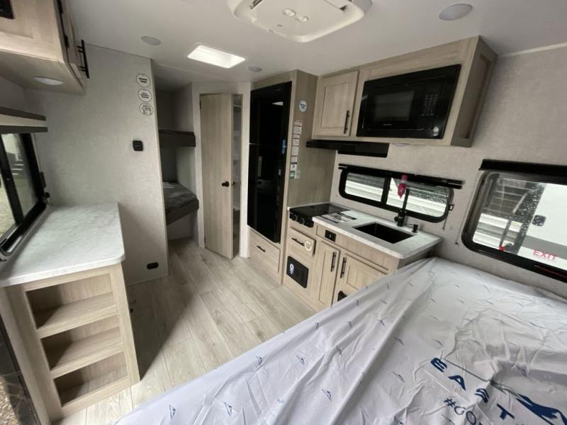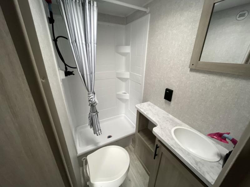 This is the perfect bunk travel trailer for your growing family. You will love the double-size bunks in back for the children or your guests, while you take the front queen bed. You can easily cook using the two burner range and microwave oven when you aren't cooking hotdogs and burgers over an open fire outside. There is flip-up storage under the front bed, under the booth dinette, and under the bunks. There is also a full bath with a walk-in shower that will allow you to freshen up without having to use the campground's facilities.