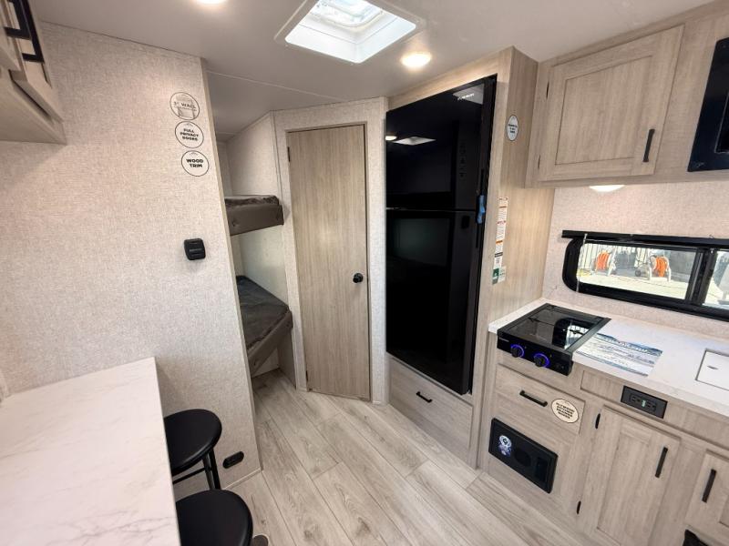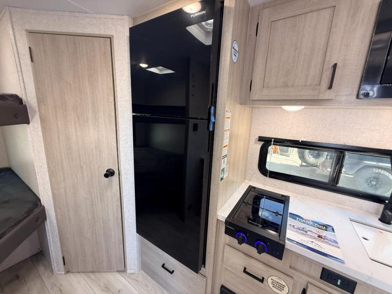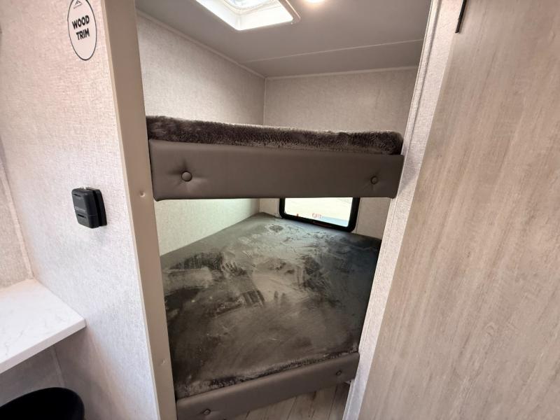 This is the perfect bunk travel trailer for your growing family. You will love the double-size bunks in back for the children or your guests, while you take the front queen bed. You can easily cook using the two burner range and microwave oven when you aren't cooking hotdogs and burgers over an open fire outside. There is flip-up storage under the front bed, under the booth dinette, and under the bunks. There is also a full bath with a walk-in shower that will allow you to freshen up without having to use the campground's facilities.