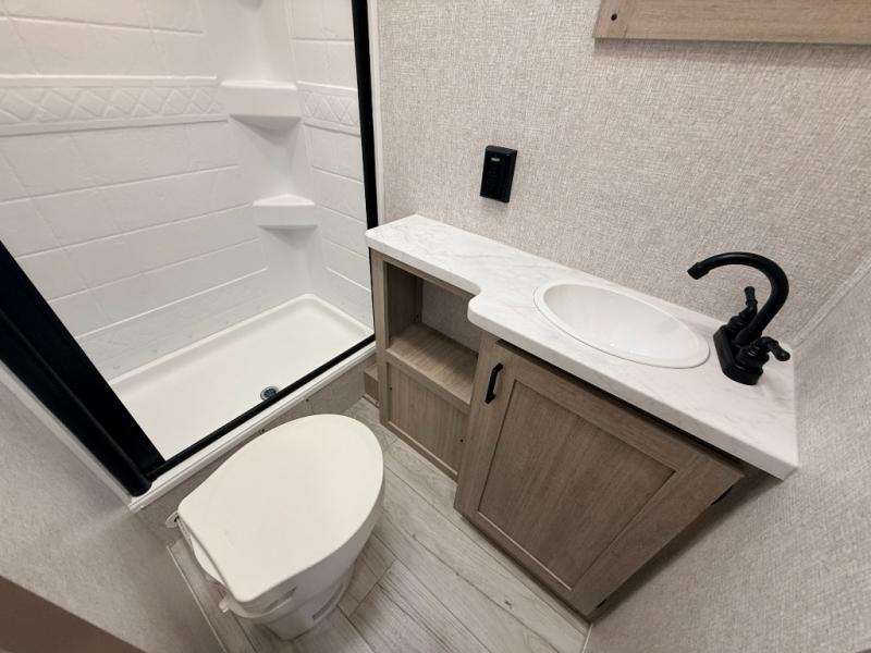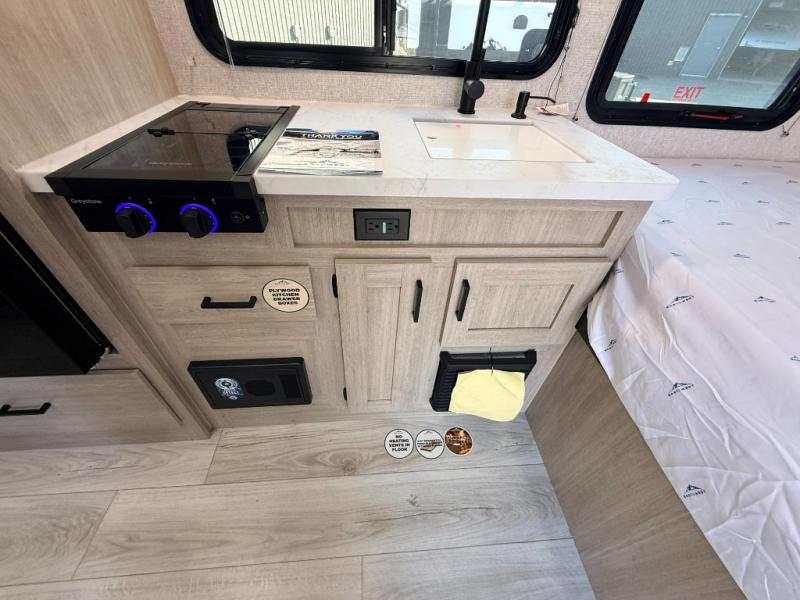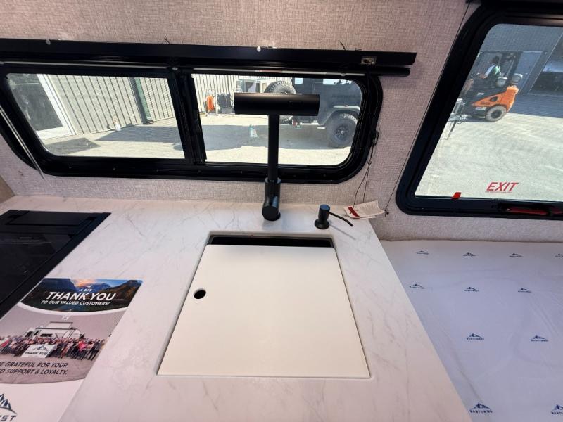 With any Della Terra LE travel trailer by EAST TO WEST, you will enjoy lightweight towing thanks to the single axle, along with many interior comforts. Each model is 8' wide with a 6' 9" interior ceiling height so you can walk around freely. There are seamless countertops also, along with motion sensor lights, a shower surround, and a USB charging station to keep your electronics ready to go. Outside, you'll find solar prep and ladder prep, an outside shower with hot and cold water, and a power awning with an LED light that will provide you with an inviting space outdoors.