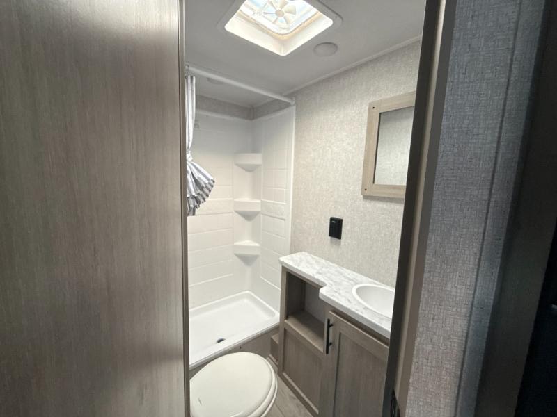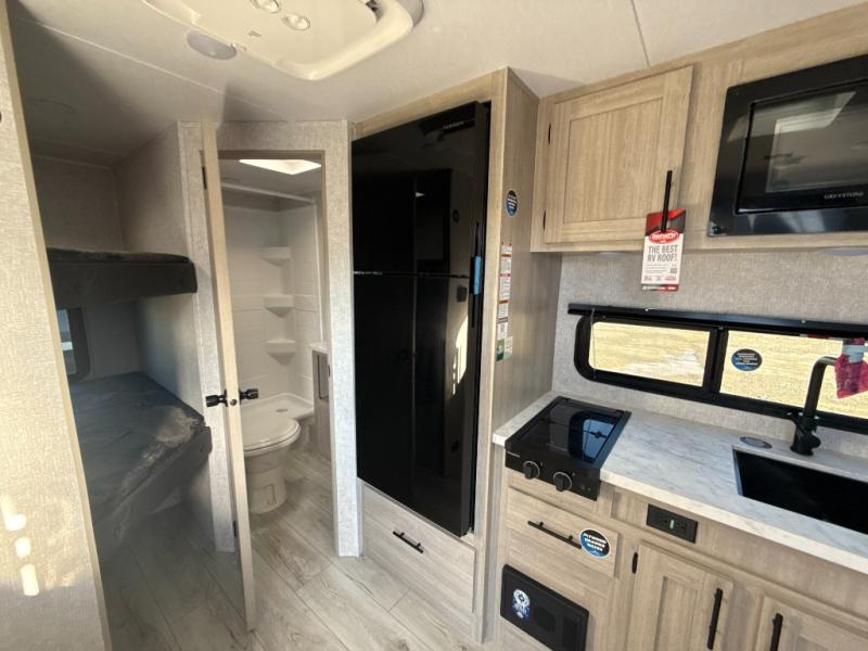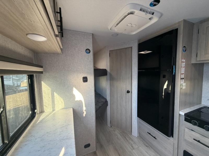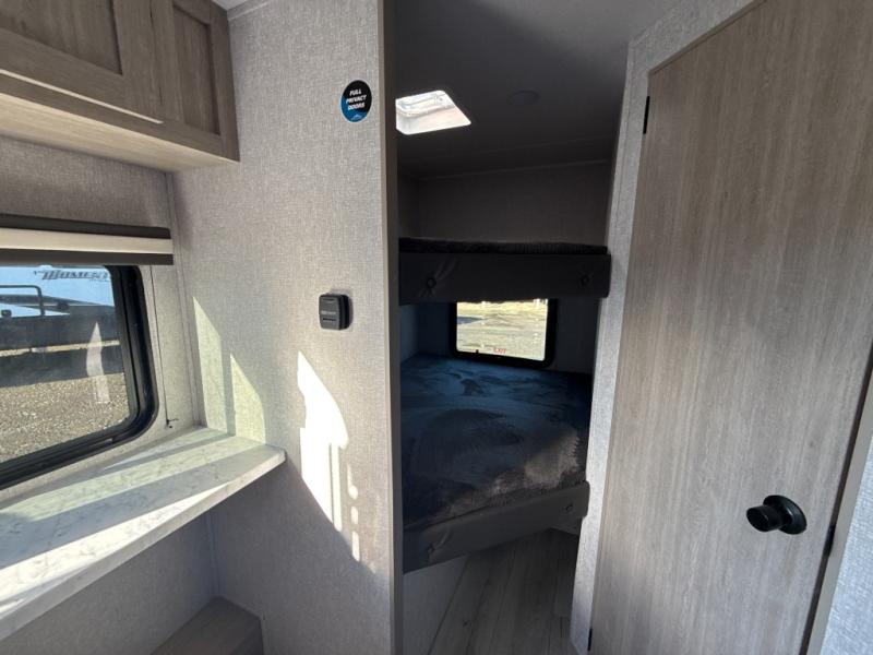 This is the perfect bunk travel trailer for your growing family. You will love the double-size bunks in back for the children or your guests, while you take the front queen bed. You can easily cook using the two burner range and microwave oven when you aren't cooking hotdogs and burgers over an open fire outside. There is flip-up storage under the front bed, under the booth dinette, and under the bunks. There is also a full bath with a walk-in shower that will allow you to freshen up without having to use the campground's facilities.