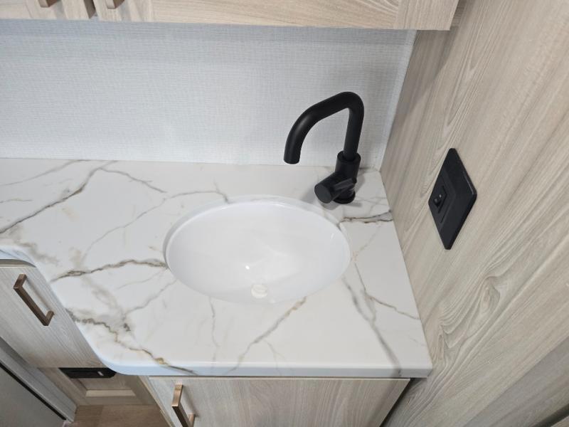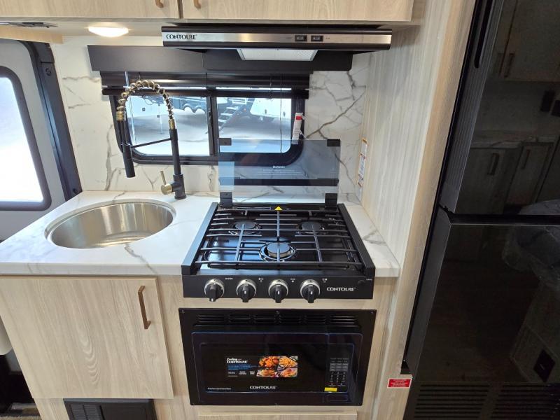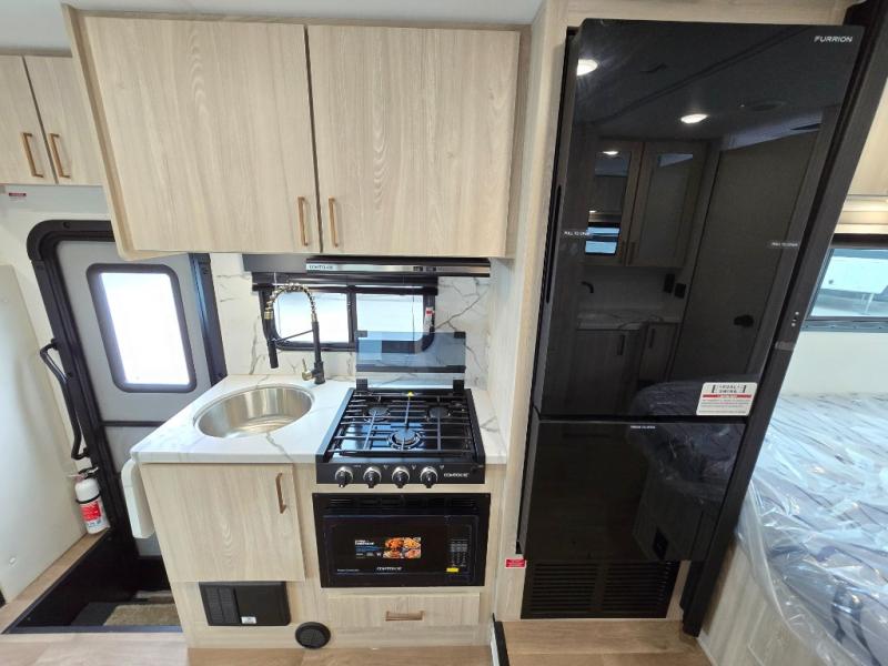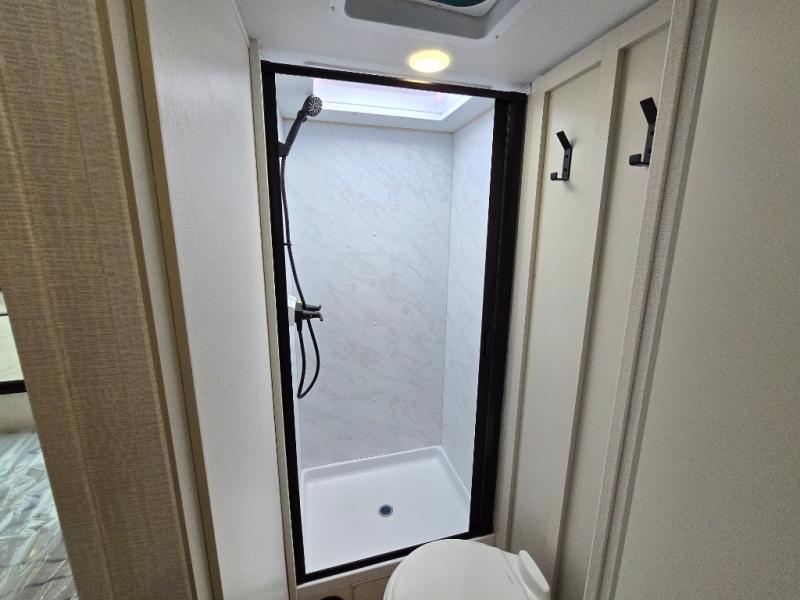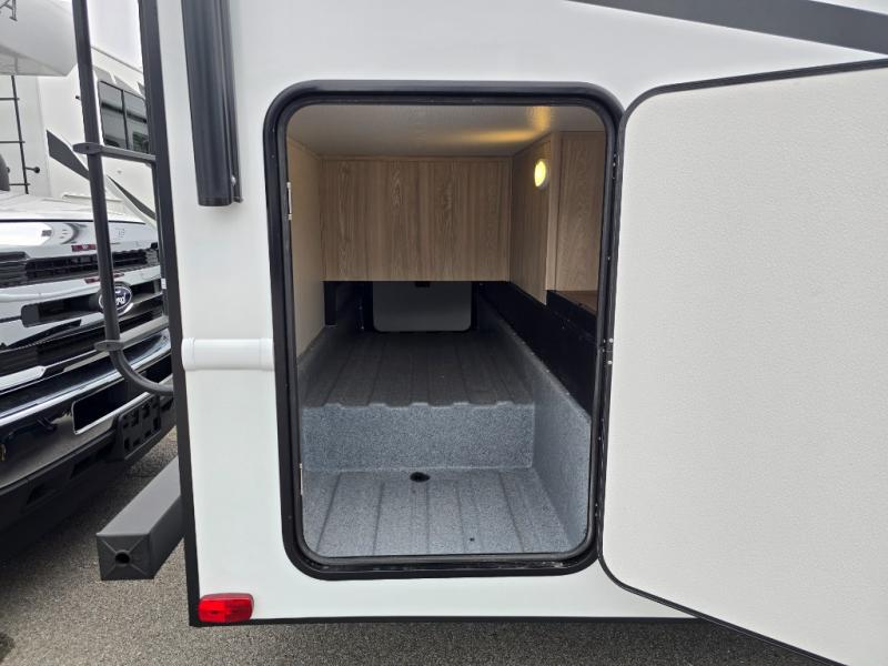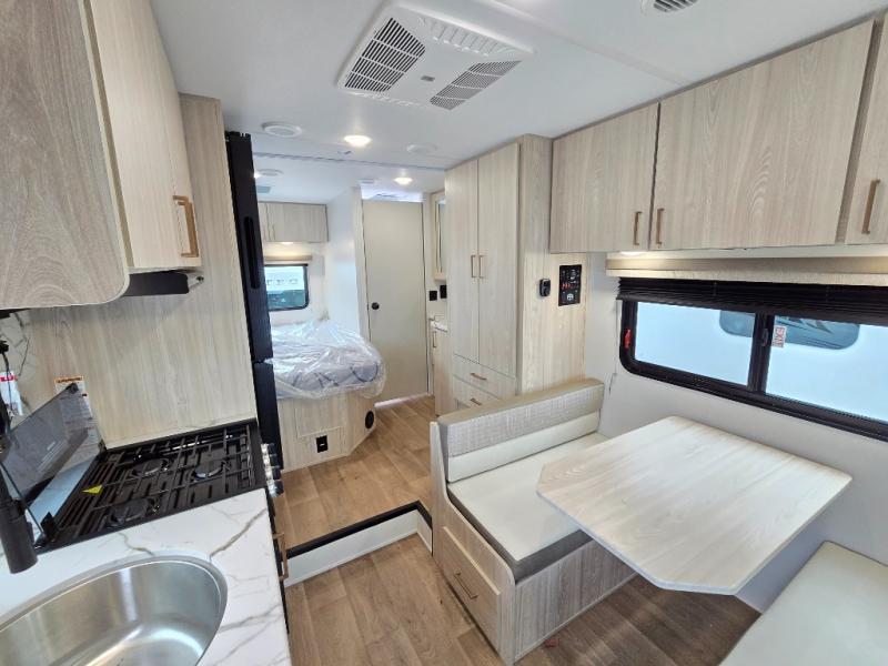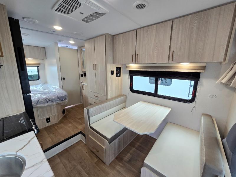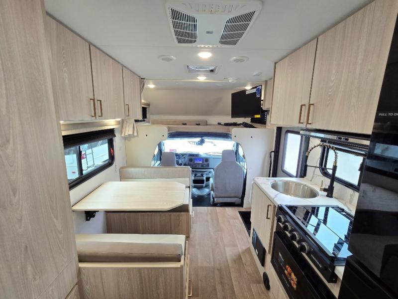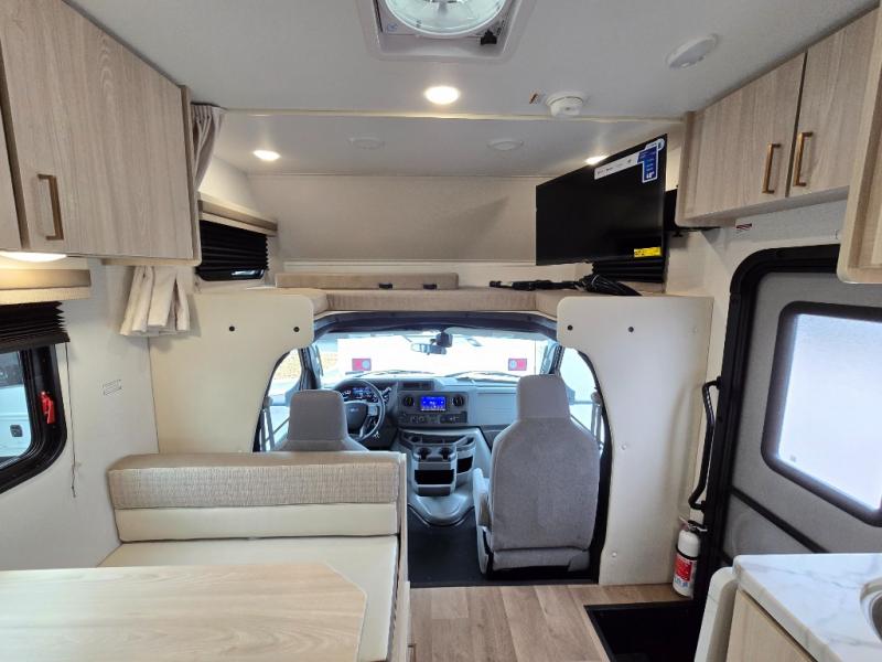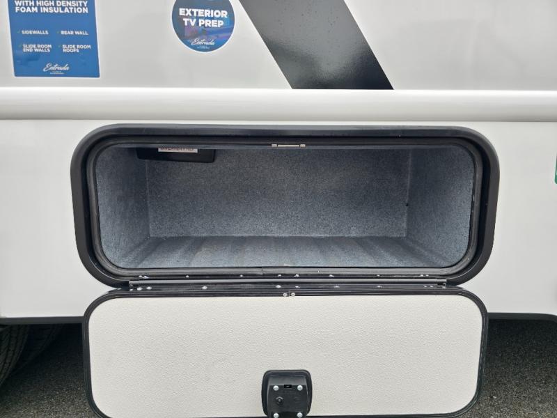 With any Entrada Class C gas motorhome from EAST TO WEST, the construction consists of a one-piece painted fiberglass front cap, a TPO roof membrane, and 2" Azdel composite sidewalls for added durability. There are rotocast exterior storage compartments with slam latch doors, along with an exterior LP Quick Connect, and a power awning with an LED light strip. You will also find rear and sideview cameras to help make maneuvering and parking your RV easier than ever. Inside, you'll feel right at home with soft close hardwood cabinet doors and drawers, a high-altitude tankless water heater, plus a 12V smart TV and USB ports to keep your electronics charged up!