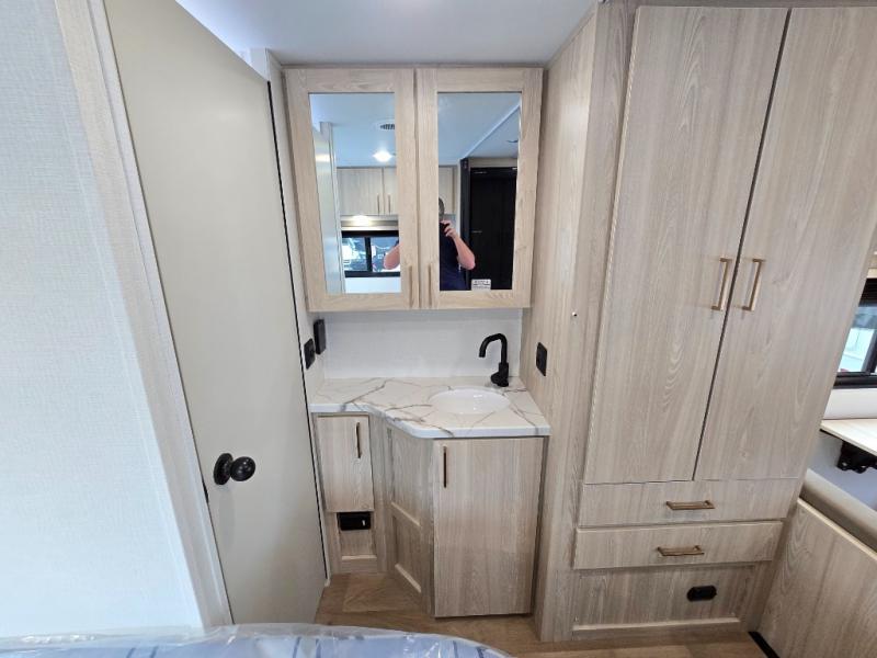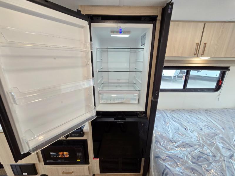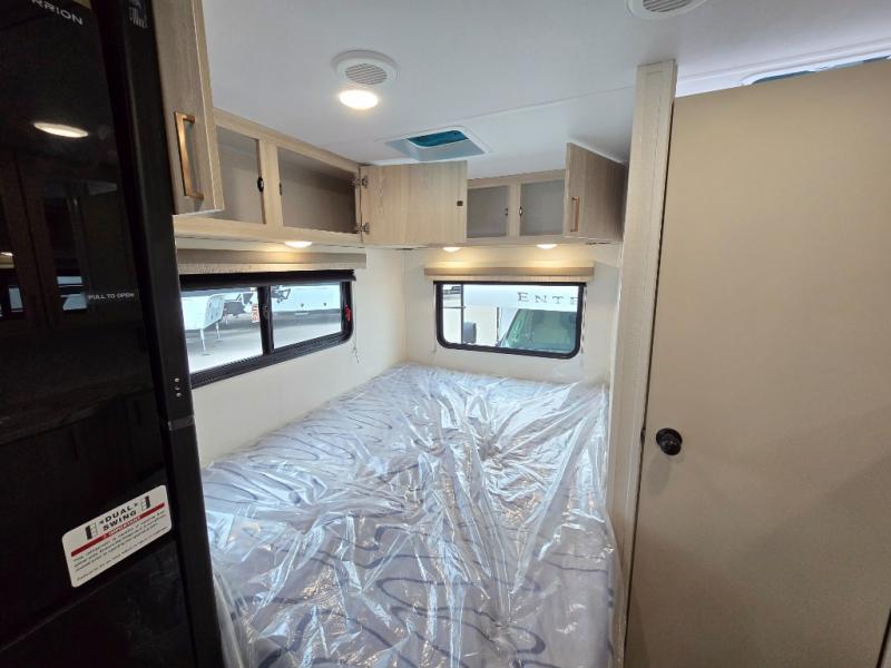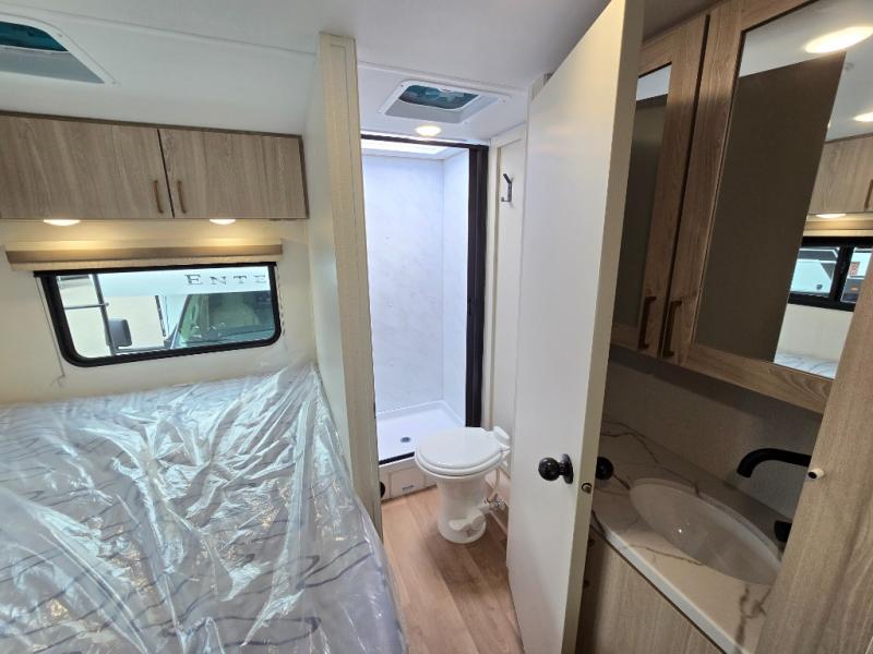 The journey will be oh-so enjoyable when you use this Entrada Class C gas motorhome to explore! You will be able to create meals each day you are on the road because the kitchen has everything you will need, like a convection microwave with air fryer technology, a round sink, a cooktop, a flip-up countertop, and a 10.7-cubic foot refrigerator. There is even a pantry/wardrobe to store spices, chips, or canned goods. The rear of this unit includes the queen bed in one corner and the private bath in the other, and you can close the privacy curtain here to make a master bedroom for extra comfort!