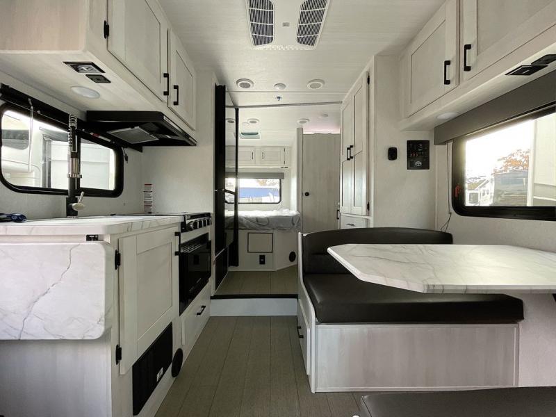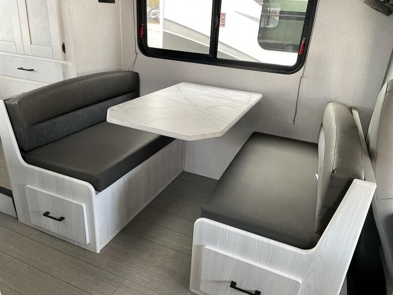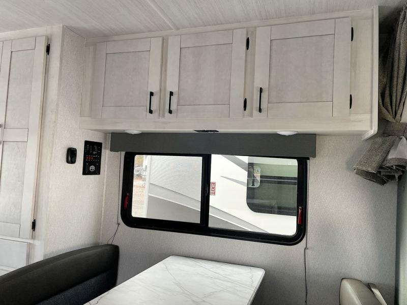 You're going to love traveling and camping in this coach that can sleep five to six each night. The convection microwave and 10.7 cu. ft. 12V refrigerator will let you cook and store food, and the booth dinette provides a place to dine together. A private bath includes a shower and toilet, with the sink just outside this room so two people can freshen up at once. You will sleep soundly each night on the rear corner queen bed with overhead storage for your belongings, while the little ones take the 60" x 80" bunk over cab!