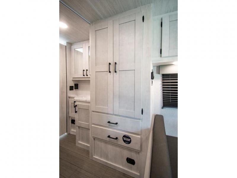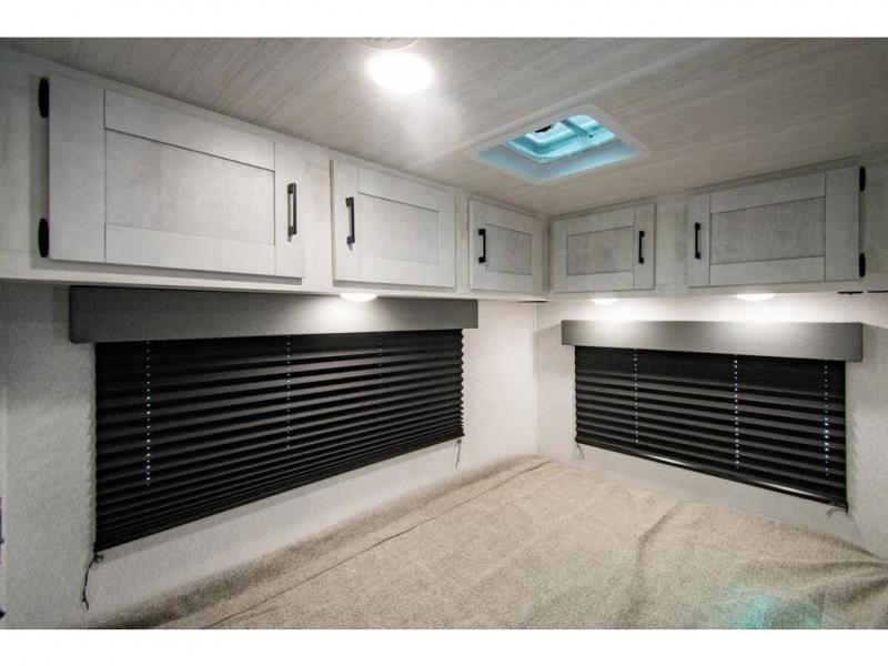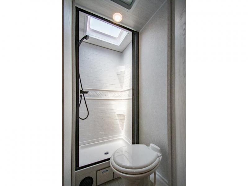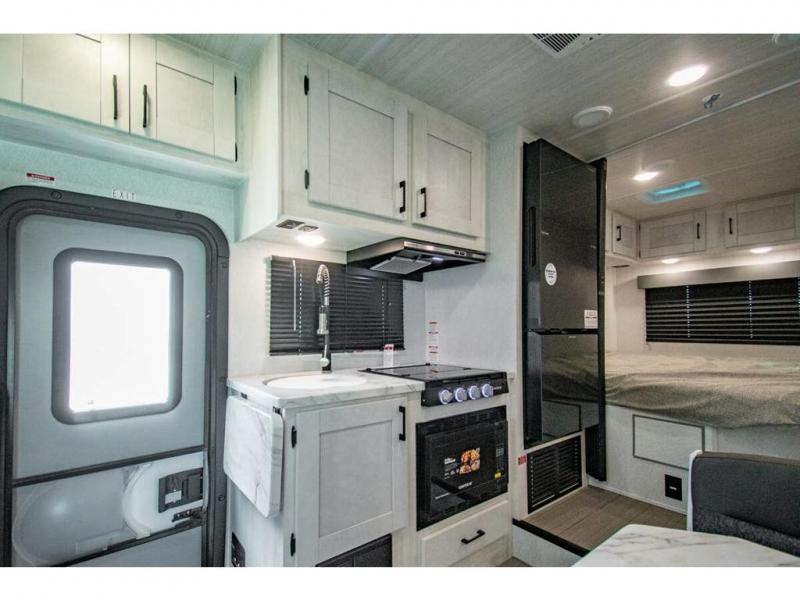You're going to love traveling and camping in this coach that can sleep five to six each night. The convection microwave and 10.7 cu. ft. 12V refrigerator will let you cook and store food, and the booth dinette provides a place to dine together. A private bath includes a shower and toilet, with the sink just outside this room so two people can freshen up at once. You will sleep soundly each night on the rear corner queen bed with overhead storage for your belongings, while the little ones take the 60" x 80" bunk over cab!