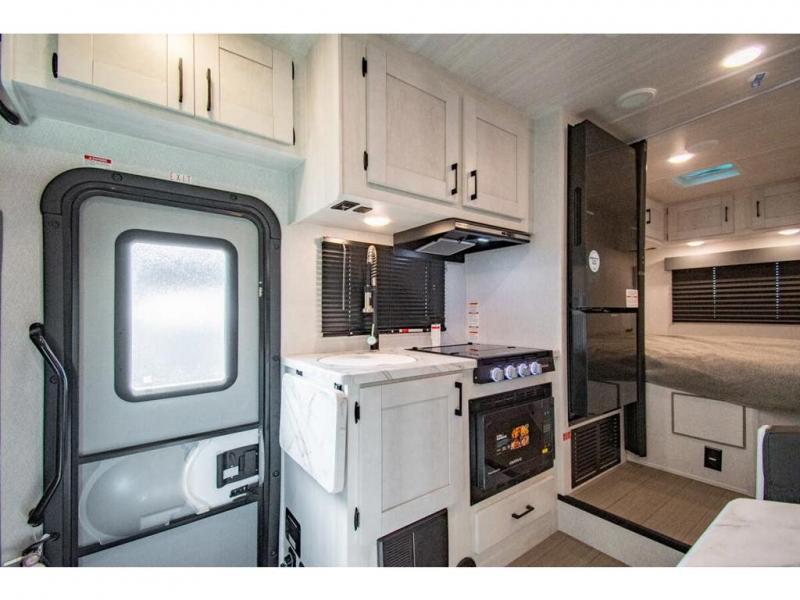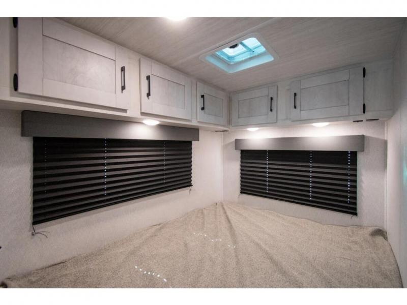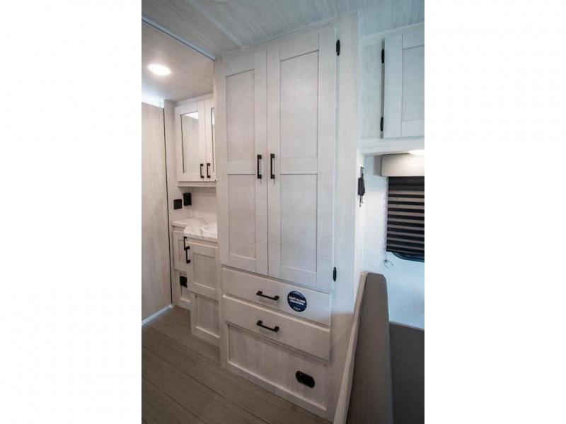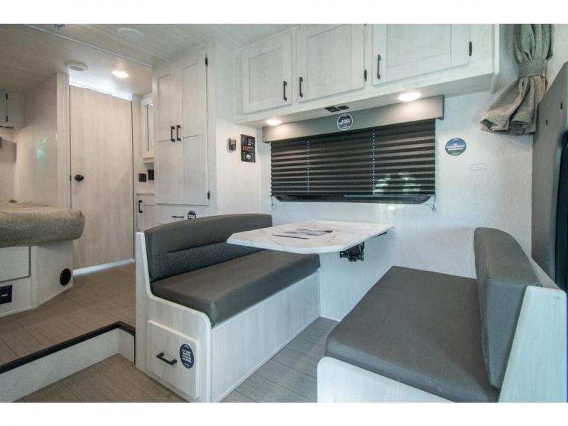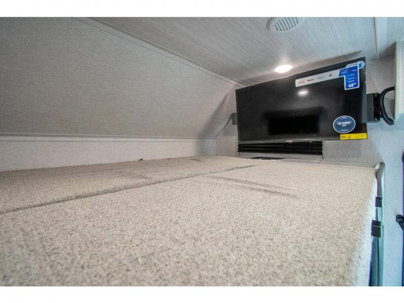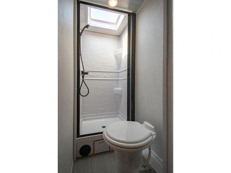 You're going to love traveling and camping in this coach that can sleep five to six each night. The convection microwave and 10.7 cu. ft. 12V refrigerator will let you cook and store food, and the booth dinette provides a place to dine together. A private bath includes a shower and toilet, with the sink just outside this room so two people can freshen up at once. You will sleep soundly each night on the rear corner queen bed with overhead storage for your belongings, while the little ones take the 60" x 80" bunk over cab!