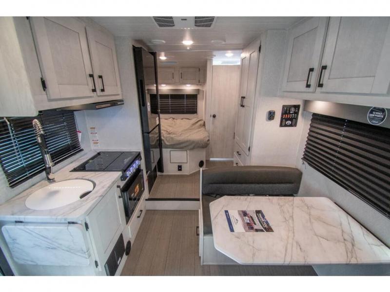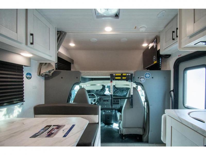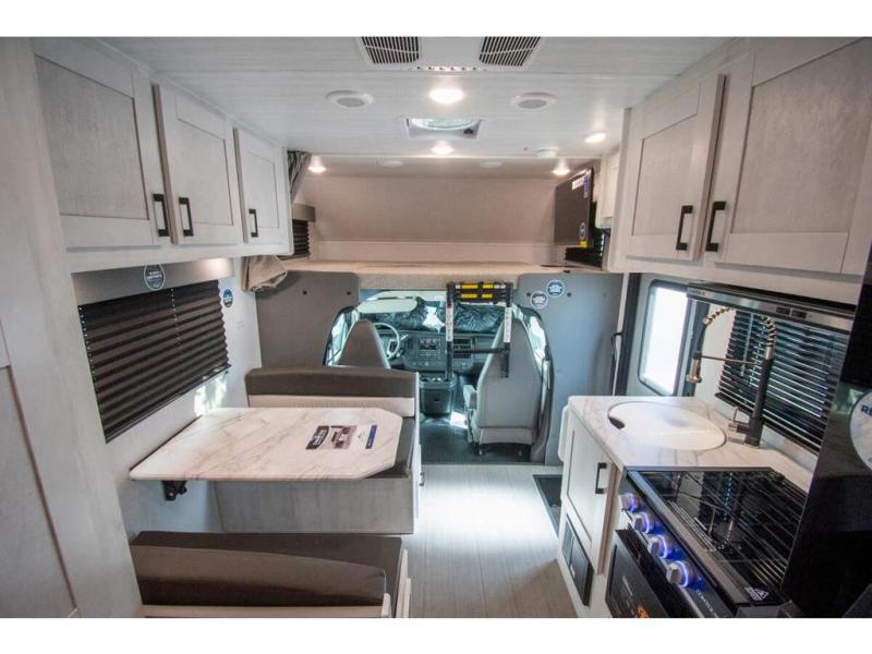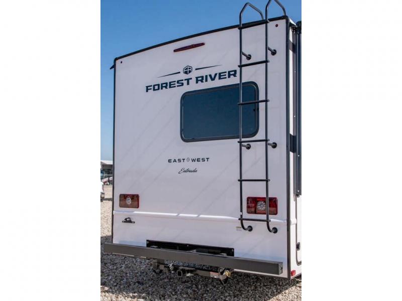 With any Entrada Class C gas motorhome from EAST TO WEST, the construction consists of a one-piece painted fiberglass front cap, a TPO roof membrane, and 2" Azdel composite sidewalls for added durability. There are rotocast exterior storage compartments with slam latch doors, along with an exterior LP Quick Connect, and a power awning with an LED light strip. You will also find rear and sideview cameras to help make maneuvering and parking your RV easier than ever. Inside, you'll feel right at home with soft close hardwood cabinet doors and drawers, a high-altitude tankless water heater, plus a 12V smart TV and USB ports to keep your electronics charged up!