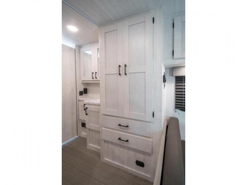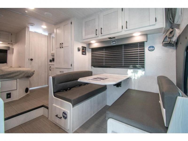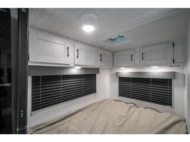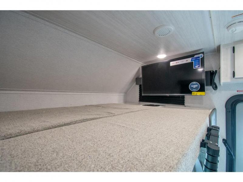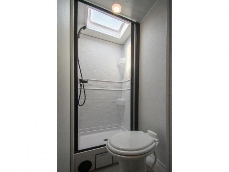 You're going to love traveling and camping in this coach that can sleep five to six each night. The convection microwave and 10.7 cu. ft. 12V refrigerator will let you cook and store food, and the booth dinette provides a place to dine together. A private bath includes a shower and toilet, with the sink just outside this room so two people can freshen up at once. You will sleep soundly each night on the rear corner queen bed with overhead storage for your belongings, while the little ones take the 60" x 80" bunk over cab!