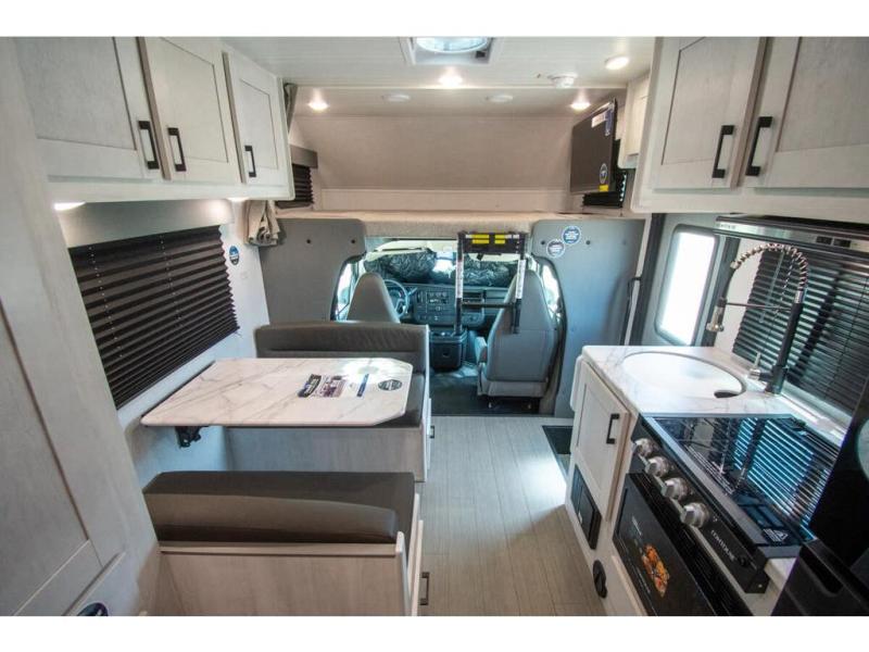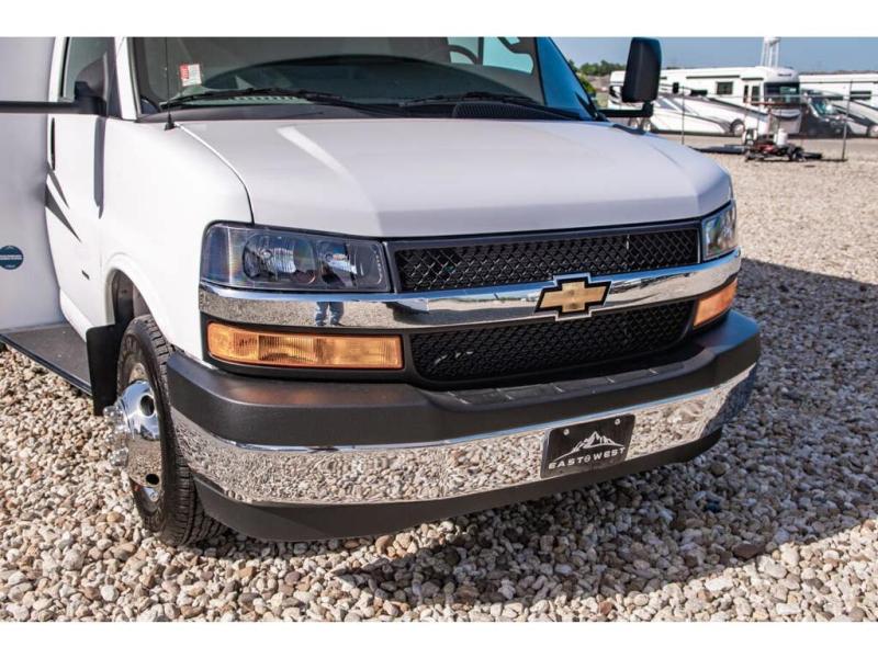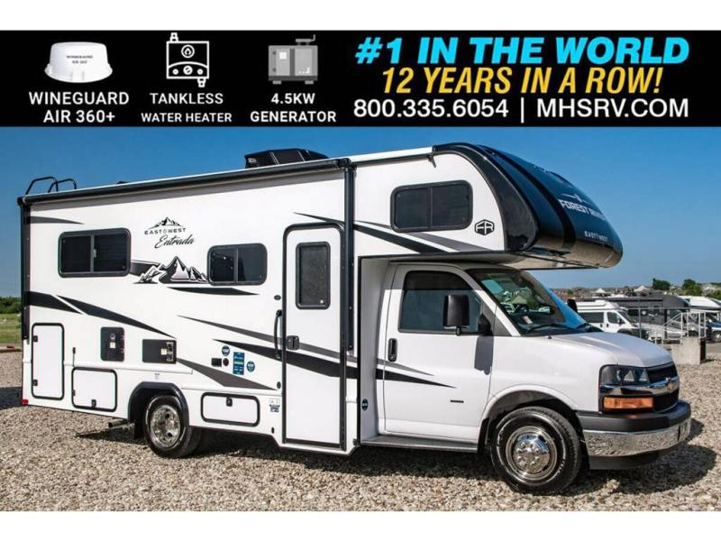 With any Entrada Class C gas motorhome from EAST TO WEST, the construction consists of a one-piece painted fiberglass front cap, a TPO roof membrane, and 2" Azdel composite sidewalls for added durability. There are rotocast exterior storage compartments with slam latch doors, along with an exterior LP Quick Connect, and a power awning with an LED light strip. You will also find rear and sideview cameras to help make maneuvering and parking your RV easier than ever. Inside, you'll feel right at home with soft close hardwood cabinet doors and drawers, a high-altitude tankless water heater, plus a 12V smart TV and USB ports to keep your electronics charged up!