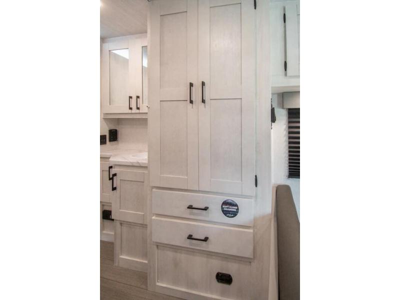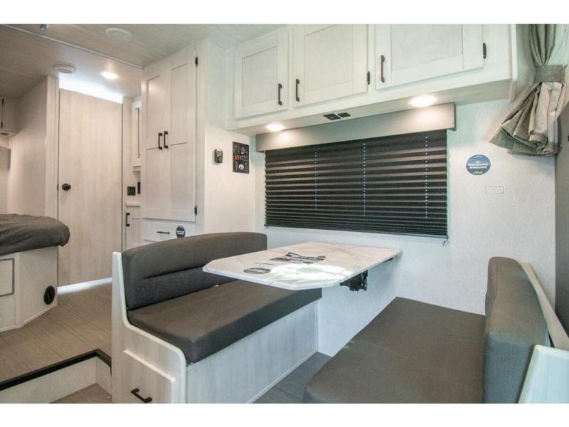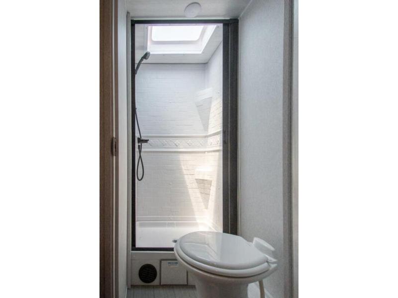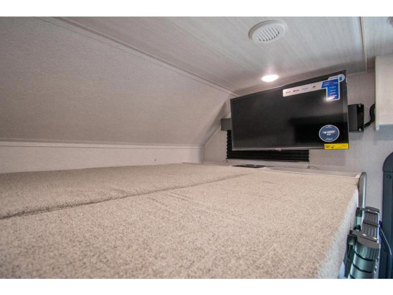 You're going to love traveling and camping in this coach that can sleep five to six each night. The convection microwave and 10.7 cu. ft. 12V refrigerator will let you cook and store food, and the booth dinette provides a place to dine together. A private bath includes a shower and toilet, with the sink just outside this room so two people can freshen up at once. You will sleep soundly each night on the rear corner queen bed with overhead storage for your belongings, while the little ones take the 60" x 80" bunk over cab!