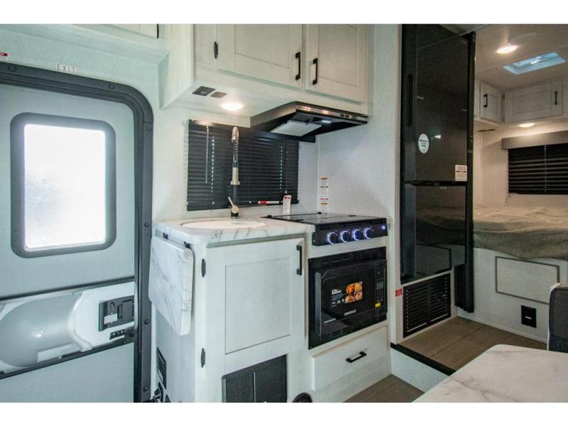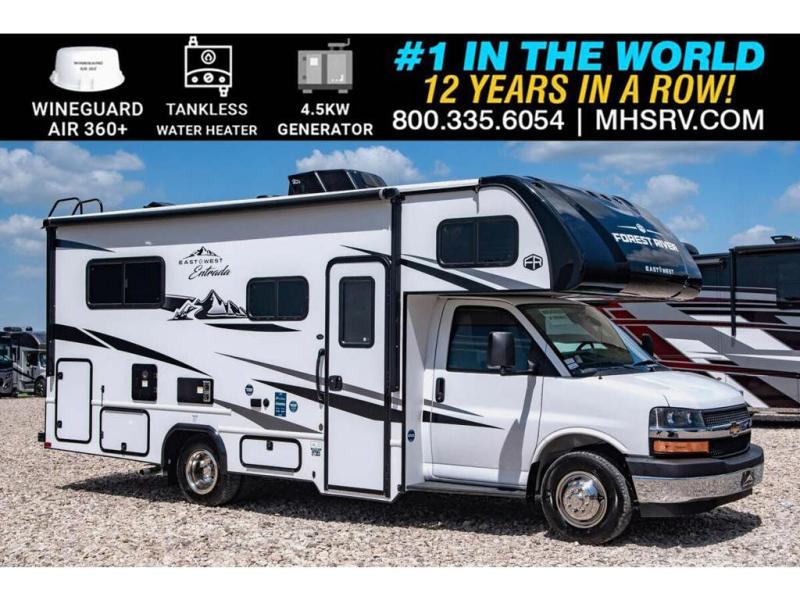 With any Entrada Class C gas motorhome from EAST TO WEST, the construction consists of a one-piece painted fiberglass front cap, a TPO roof membrane, and 2" Azdel composite sidewalls for added durability. There are rotocast exterior storage compartments with slam latch doors, along with an exterior LP Quick Connect, and a power awning with an LED light strip. You will also find rear and sideview cameras to help make maneuvering and parking your RV easier than ever. Inside, you'll feel right at home with soft close hardwood cabinet doors and drawers, a high-altitude tankless water heater, plus a 12V smart TV and USB ports to keep your electronics charged up!