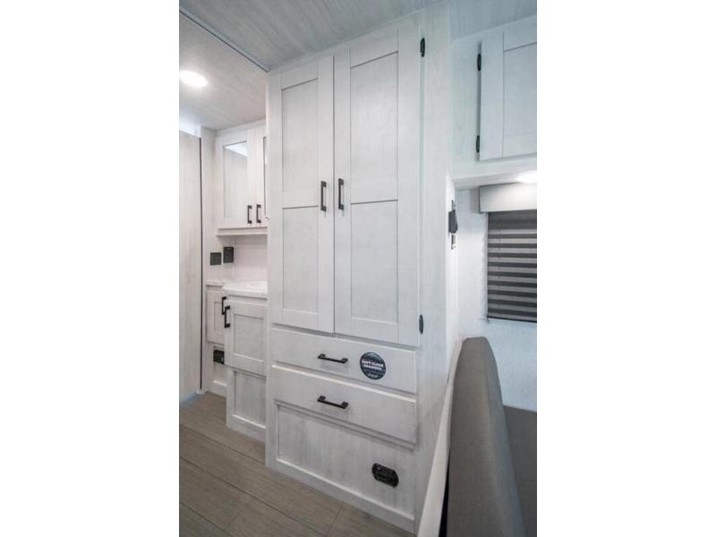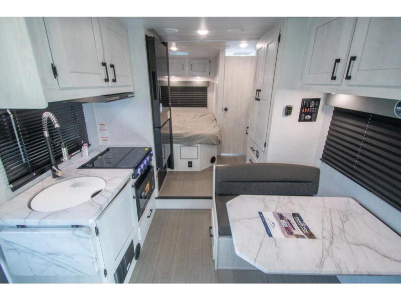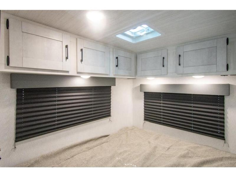 You're going to love traveling and camping in this coach that can sleep five to six each night. The convection microwave and 10.7 cu. ft. 12V refrigerator will let you cook and store food, and the booth dinette provides a place to dine together. A private bath includes a shower and toilet, with the sink just outside this room so two people can freshen up at once. You will sleep soundly each night on the rear corner queen bed with overhead storage for your belongings, while the little ones take the 60" x 80" bunk over cab!