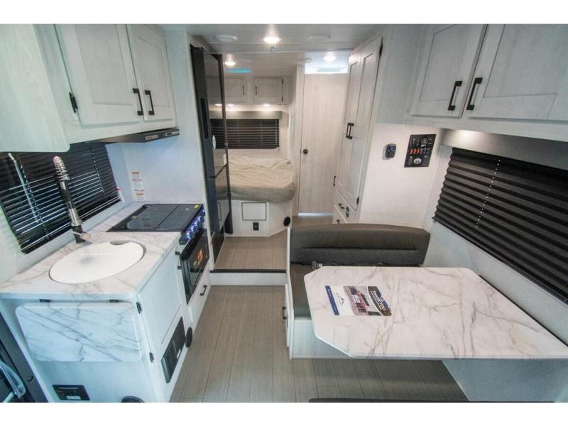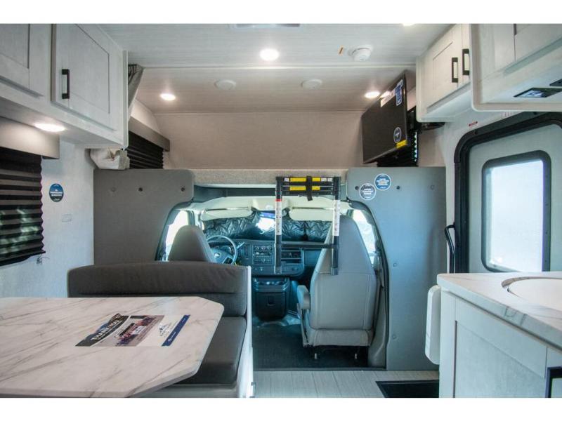 With any Entrada Class C gas motorhome from EAST TO WEST, the construction consists of a one-piece painted fiberglass front cap, a TPO roof membrane, and 2" Azdel composite sidewalls for added durability. There are rotocast exterior storage compartments with slam latch doors, along with an exterior LP Quick Connect, and a power awning with an LED light strip. You will also find rear and sideview cameras to help make maneuvering and parking your RV easier than ever. Inside, you'll feel right at home with soft close hardwood cabinet doors and drawers, a high-altitude tankless water heater, plus a 12V smart TV and USB ports to keep your electronics charged up!