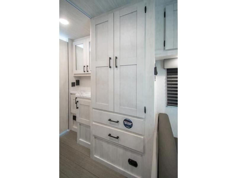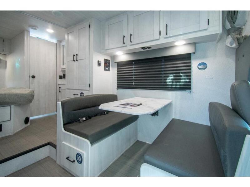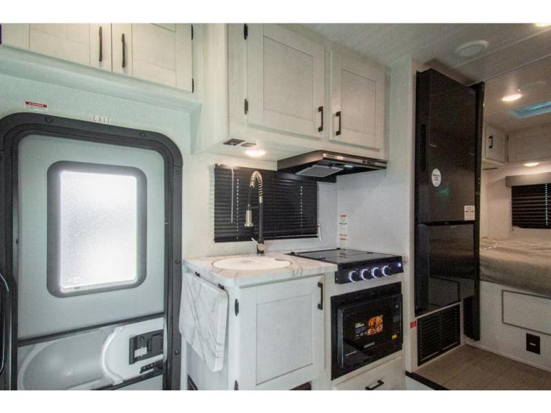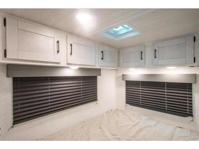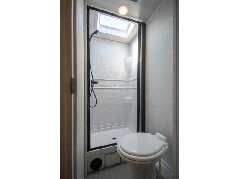 You're going to love traveling and camping in this coach that can sleep five to six each night. The convection microwave and 10.7 cu. ft. 12V refrigerator will let you cook and store food, and the booth dinette provides a place to dine together. A private bath includes a shower and toilet, with the sink just outside this room so two people can freshen up at once. You will sleep soundly each night on the rear corner queen bed with overhead storage for your belongings, while the little ones take the 60" x 80" bunk over cab!