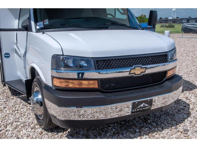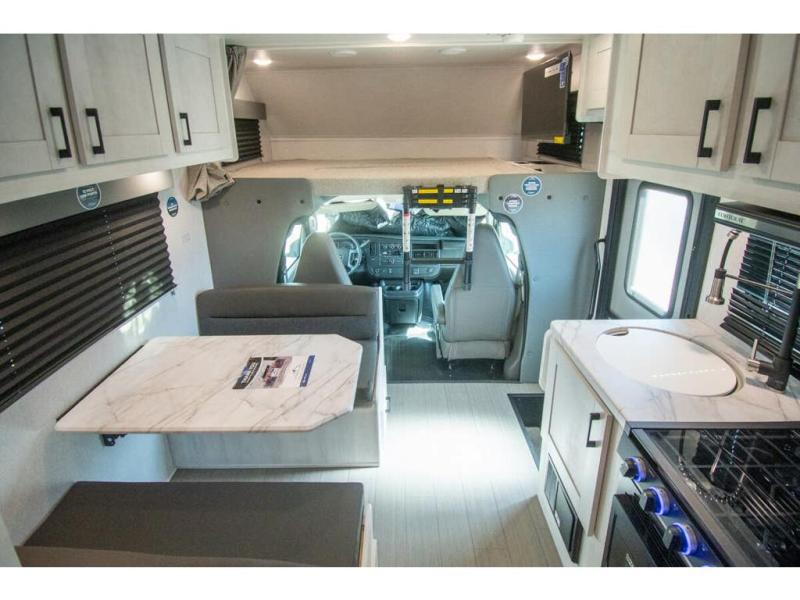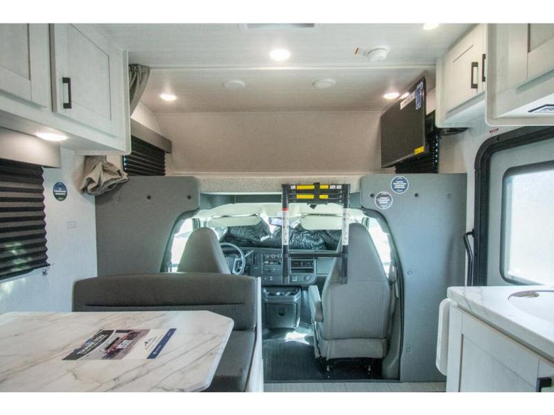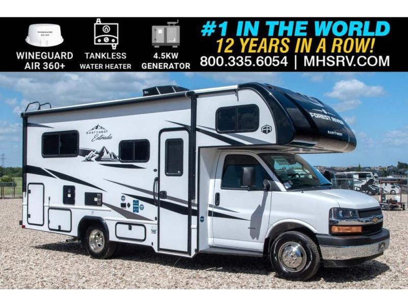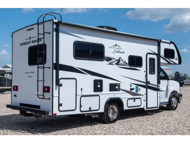 With any Entrada Class C gas motorhome from EAST TO WEST, the construction consists of a one-piece painted fiberglass front cap, a TPO roof membrane, and 2" Azdel composite sidewalls for added durability. There are rotocast exterior storage compartments with slam latch doors, along with an exterior LP Quick Connect, and a power awning with an LED light strip. You will also find rear and sideview cameras to help make maneuvering and parking your RV easier than ever. Inside, you'll feel right at home with soft close hardwood cabinet doors and drawers, a high-altitude tankless water heater, plus a 12V smart TV and USB ports to keep your electronics charged up!