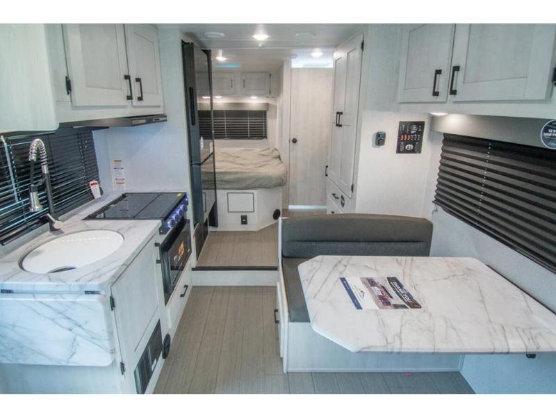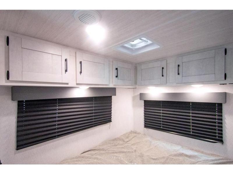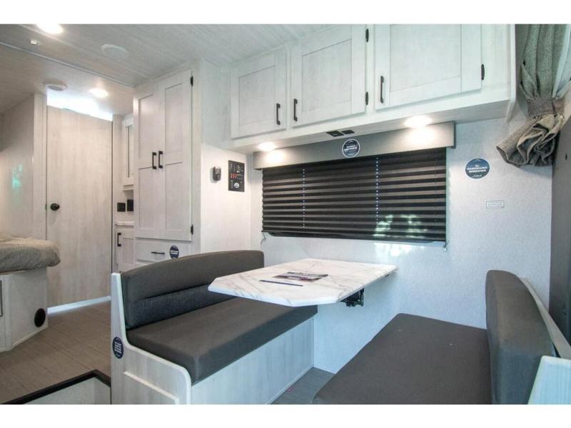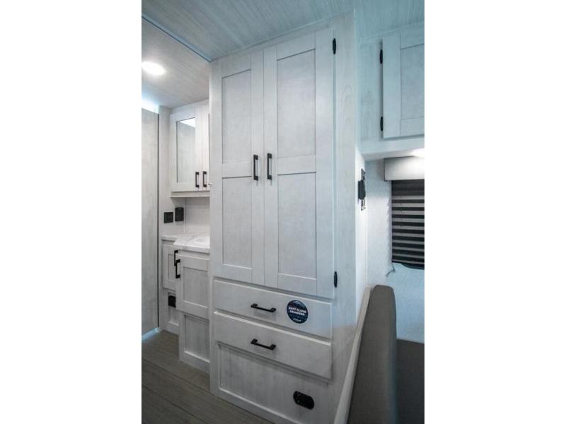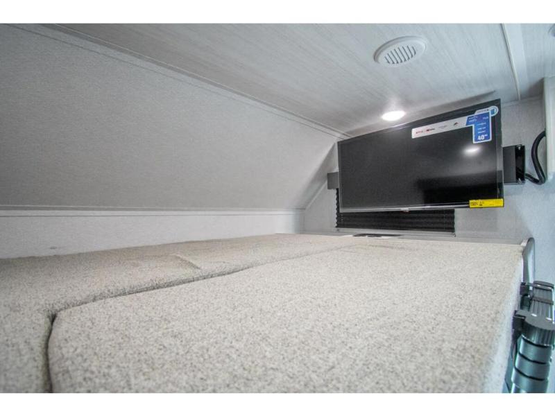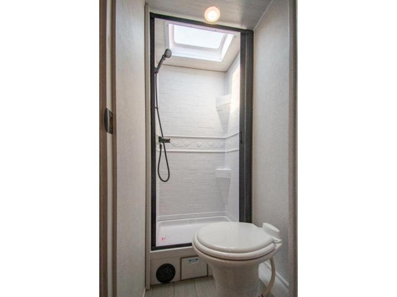 You're going to love traveling and camping in this coach that can sleep five to six each night. The convection microwave and 10.7 cu. ft. 12V refrigerator will let you cook and store food, and the booth dinette provides a place to dine together. A private bath includes a shower and toilet, with the sink just outside this room so two people can freshen up at once. You will sleep soundly each night on the rear corner queen bed with overhead storage for your belongings, while the little ones take the 60" x 80" bunk over cab!