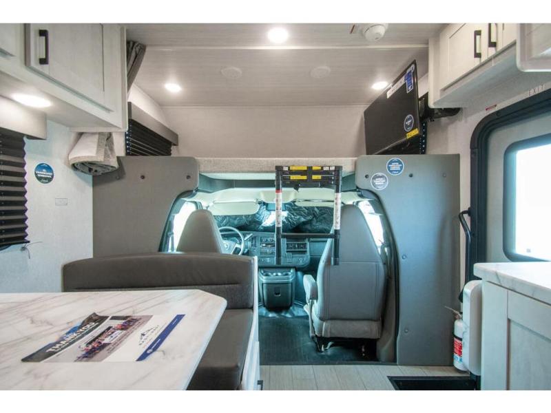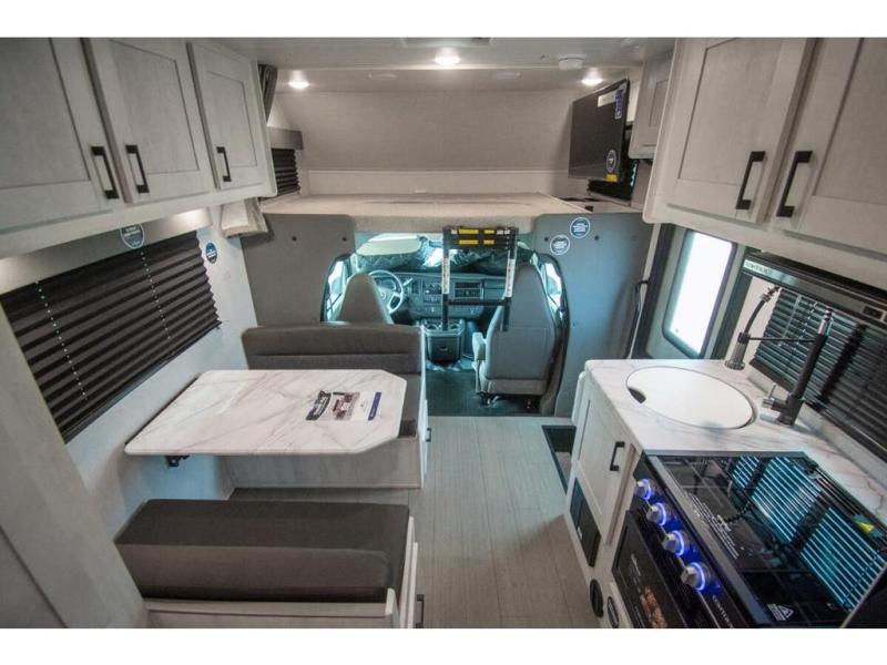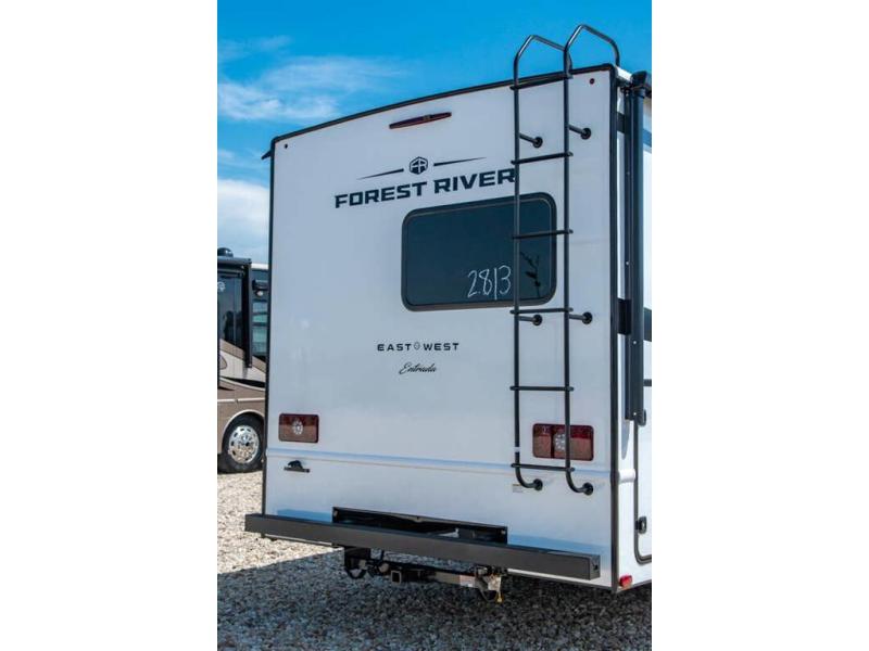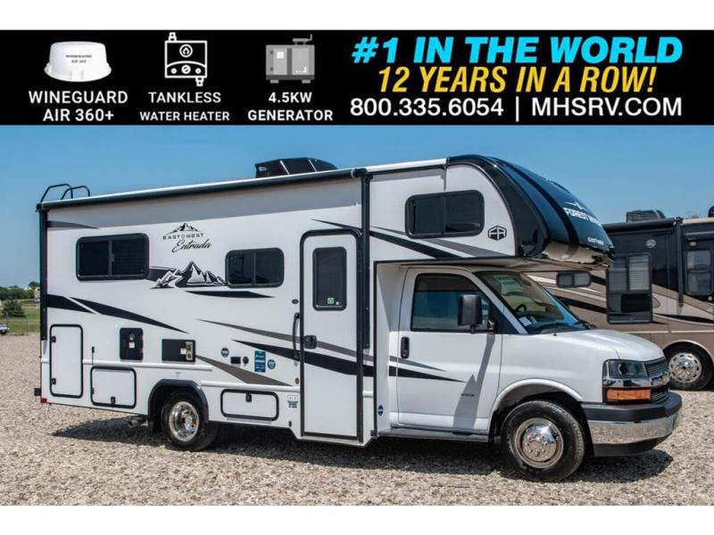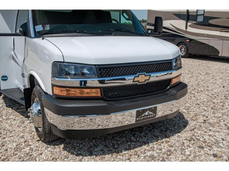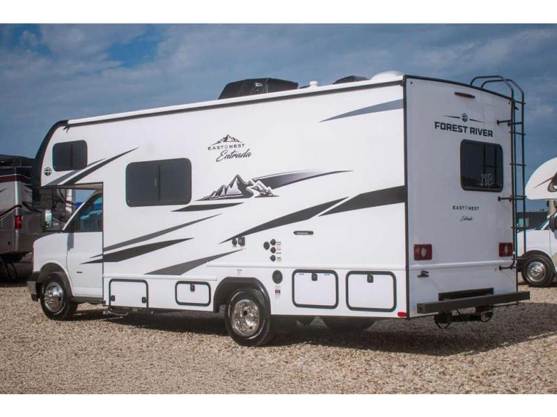 With any Entrada Class C gas motorhome from EAST TO WEST, the construction consists of a one-piece painted fiberglass front cap, a TPO roof membrane, and 2" Azdel composite sidewalls for added durability. There are rotocast exterior storage compartments with slam latch doors, along with an exterior LP Quick Connect, and a power awning with an LED light strip. You will also find rear and sideview cameras to help make maneuvering and parking your RV easier than ever. Inside, you'll feel right at home with soft close hardwood cabinet doors and drawers, a high-altitude tankless water heater, plus a 12V smart TV and USB ports to keep your electronics charged up!