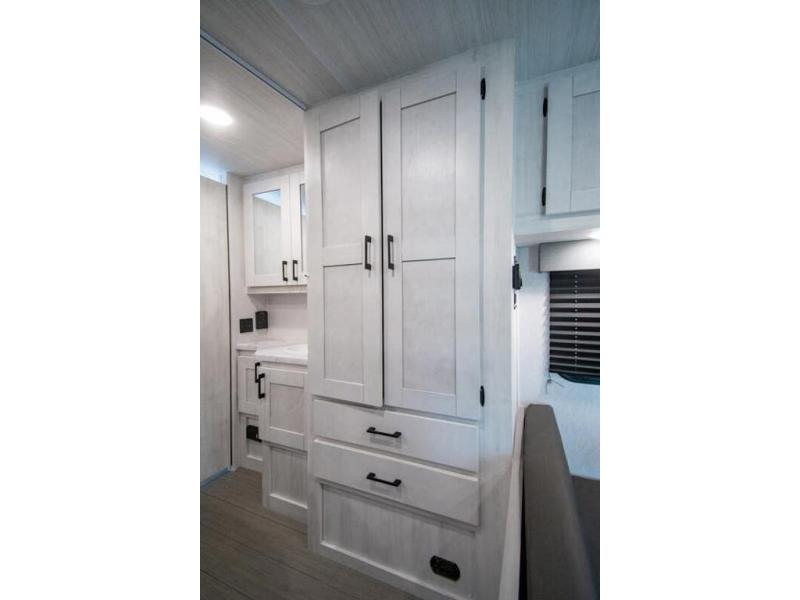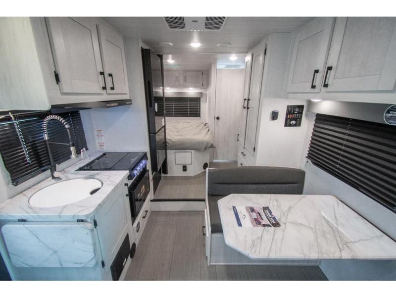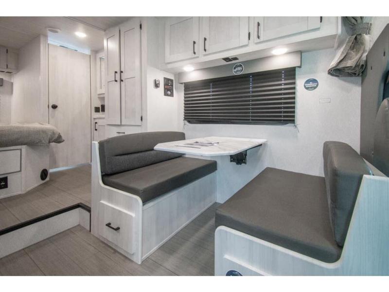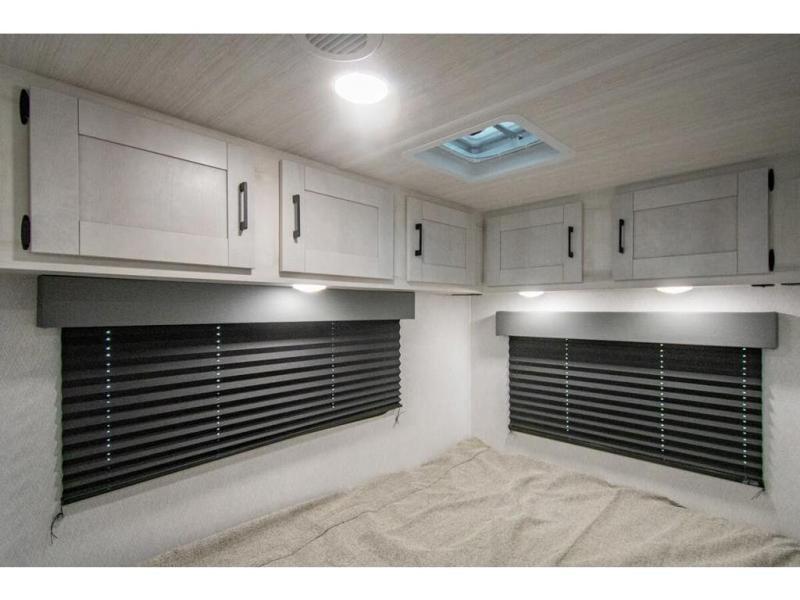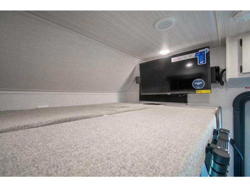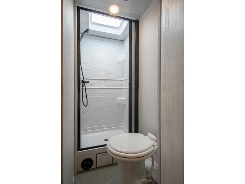 You're going to love traveling and camping in this coach that can sleep five to six each night. The convection microwave and 10.7 cu. ft. 12V refrigerator will let you cook and store food, and the booth dinette provides a place to dine together. A private bath includes a shower and toilet, with the sink just outside this room so two people can freshen up at once. You will sleep soundly each night on the rear corner queen bed with overhead storage for your belongings, while the little ones take the 60" x 80" bunk over cab!