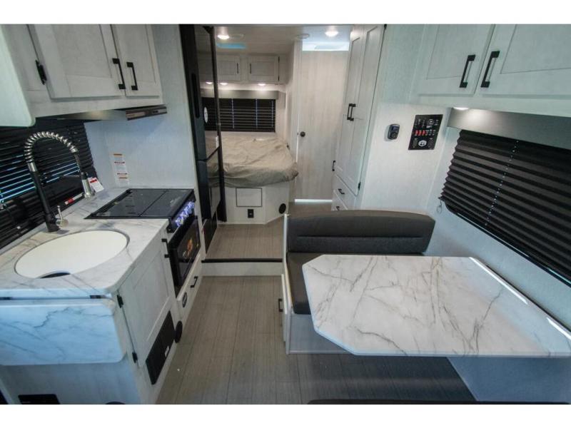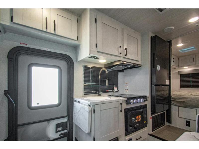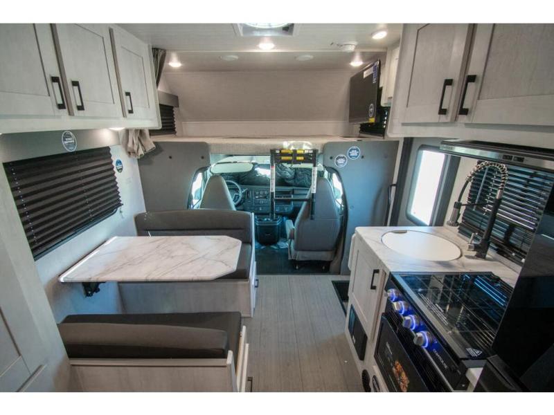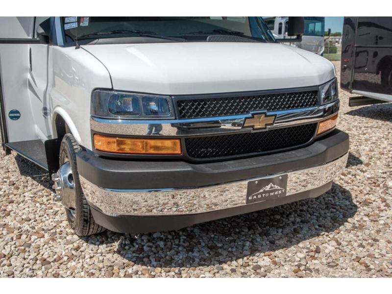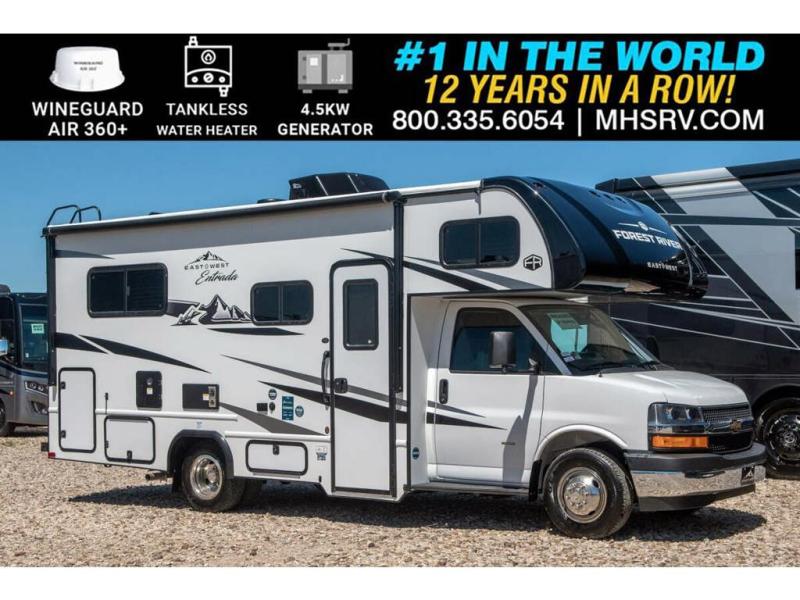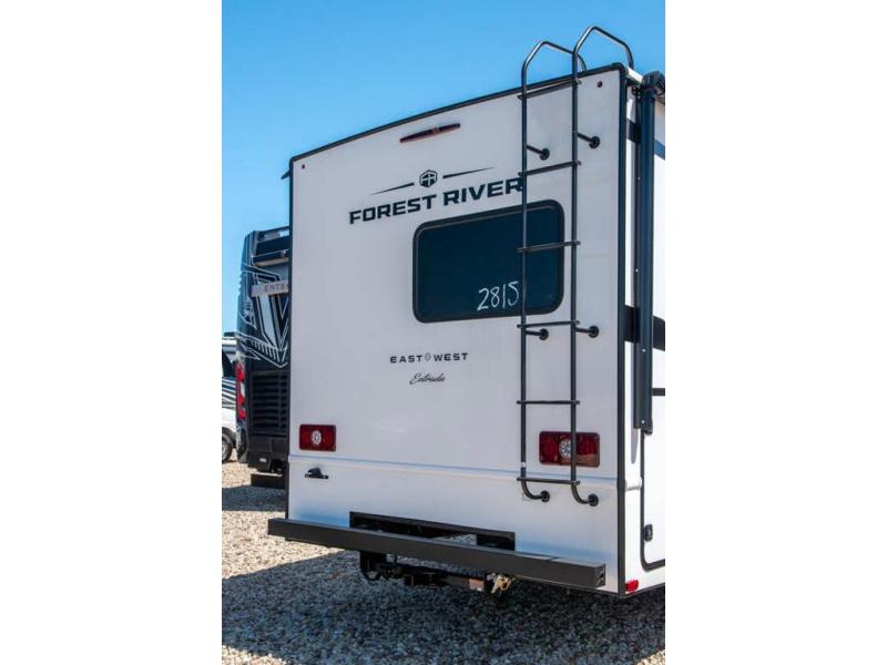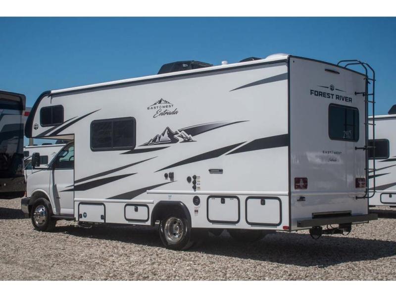 With any Entrada Class C gas motorhome from EAST TO WEST, the construction consists of a one-piece painted fiberglass front cap, a TPO roof membrane, and 2" Azdel composite sidewalls for added durability. There are rotocast exterior storage compartments with slam latch doors, along with an exterior LP Quick Connect, and a power awning with an LED light strip. You will also find rear and sideview cameras to help make maneuvering and parking your RV easier than ever. Inside, you'll feel right at home with soft close hardwood cabinet doors and drawers, a high-altitude tankless water heater, plus a 12V smart TV and USB ports to keep your electronics charged up!