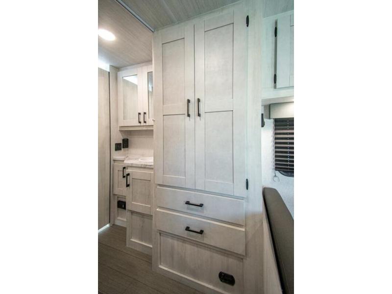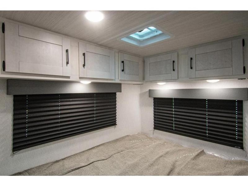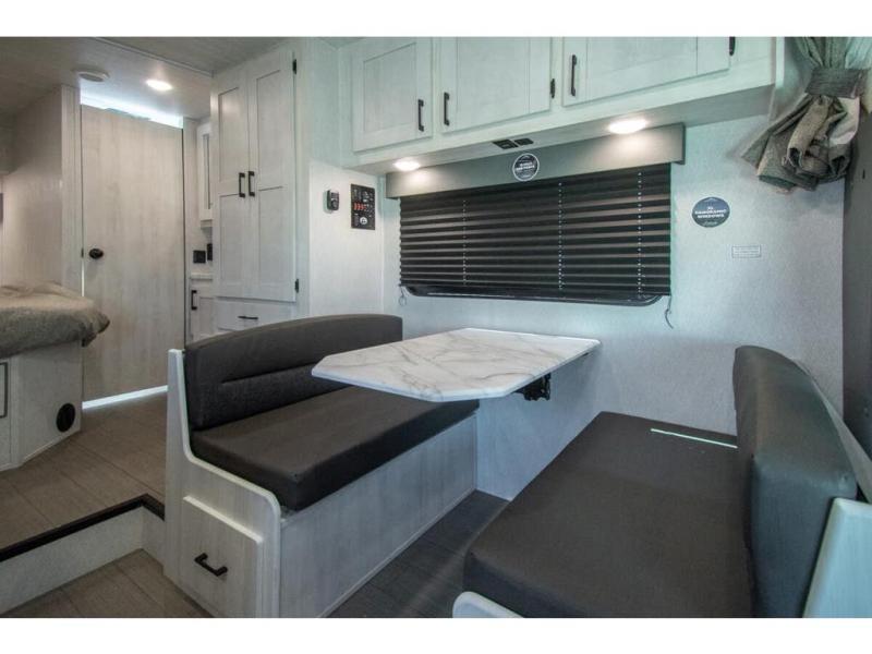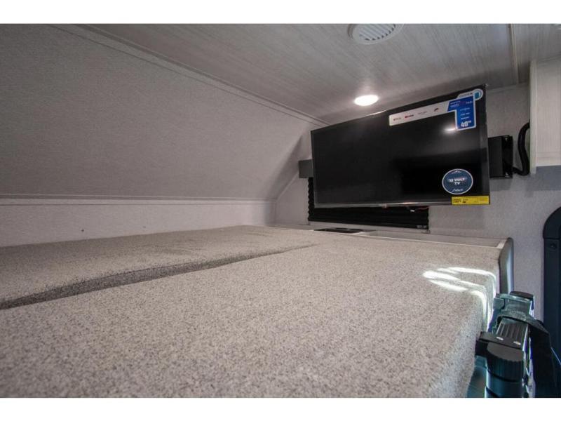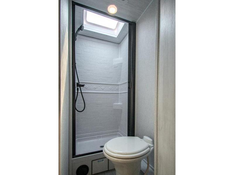 You're going to love traveling and camping in this coach that can sleep five to six each night. The convection microwave and 10.7 cu. ft. 12V refrigerator will let you cook and store food, and the booth dinette provides a place to dine together. A private bath includes a shower and toilet, with the sink just outside this room so two people can freshen up at once. You will sleep soundly each night on the rear corner queen bed with overhead storage for your belongings, while the little ones take the 60" x 80" bunk over cab!