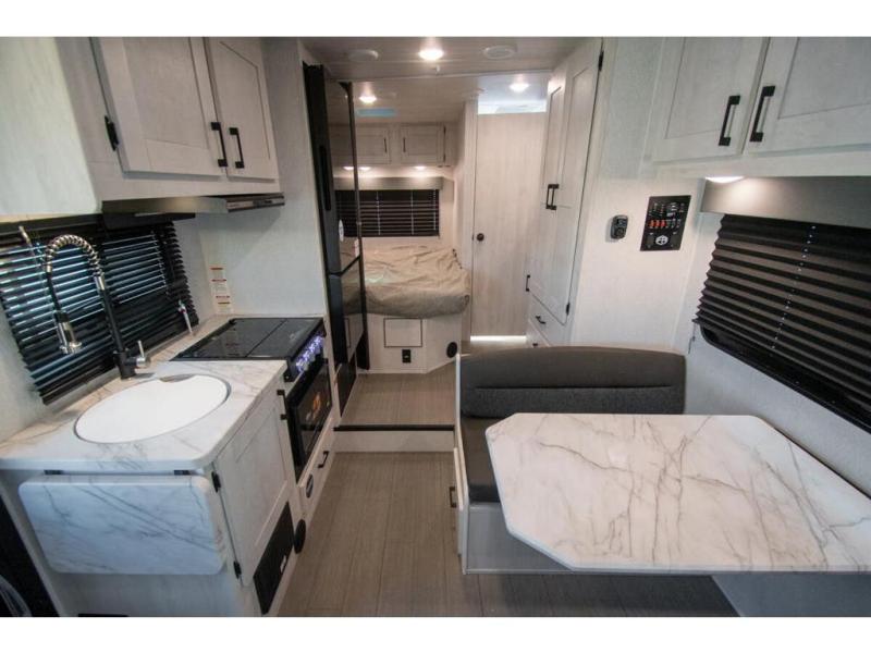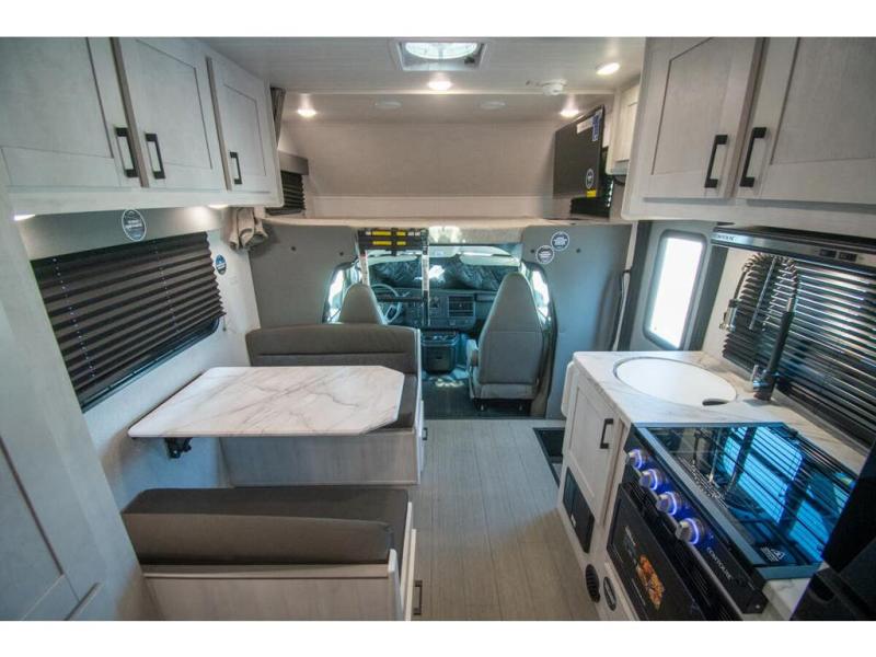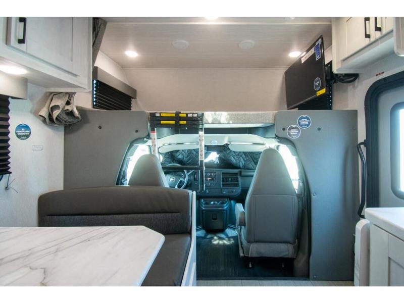 With any Entrada Class C gas motorhome from EAST TO WEST, the construction consists of a one-piece painted fiberglass front cap, a TPO roof membrane, and 2" Azdel composite sidewalls for added durability. There are rotocast exterior storage compartments with slam latch doors, along with an exterior LP Quick Connect, and a power awning with an LED light strip. You will also find rear and sideview cameras to help make maneuvering and parking your RV easier than ever. Inside, you'll feel right at home with soft close hardwood cabinet doors and drawers, a high-altitude tankless water heater, plus a 12V smart TV and USB ports to keep your electronics charged up!