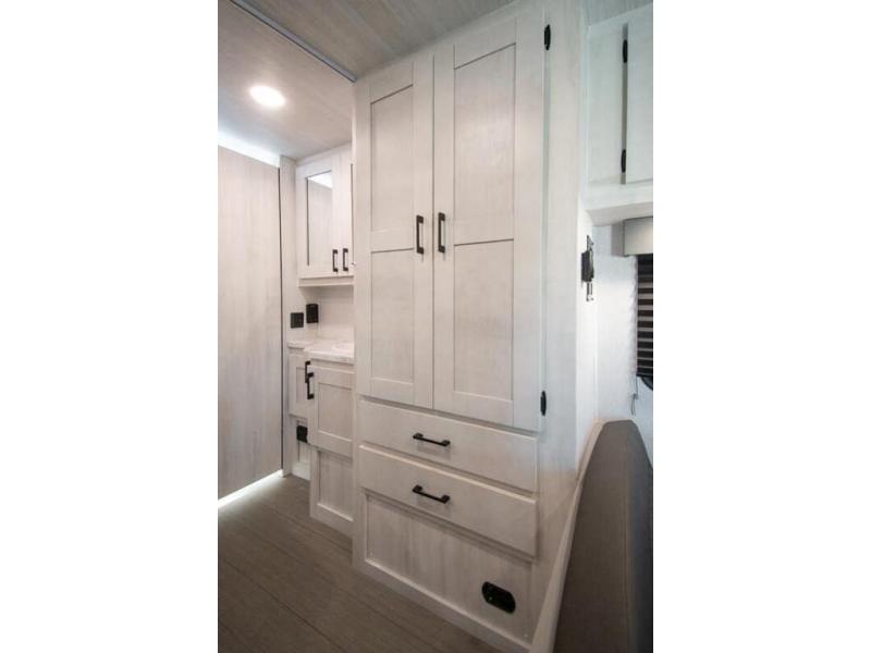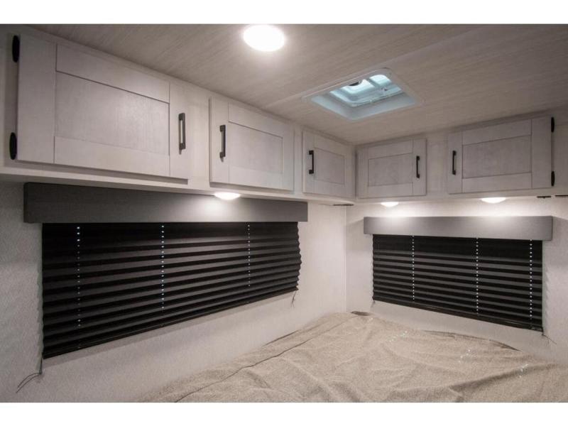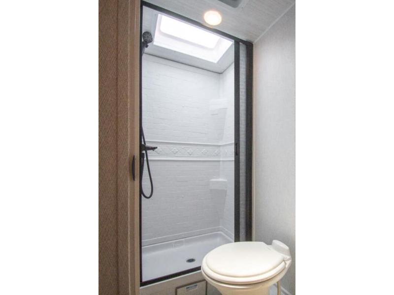 You're going to love traveling and camping in this coach that can sleep five to six each night. The convection microwave and 10.7 cu. ft. 12V refrigerator will let you cook and store food, and the booth dinette provides a place to dine together. A private bath includes a shower and toilet, with the sink just outside this room so two people can freshen up at once. You will sleep soundly each night on the rear corner queen bed with overhead storage for your belongings, while the little ones take the 60" x 80" bunk over cab!